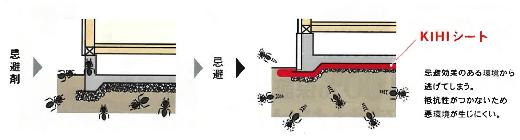EVA樹脂(ポリエチレン樹脂+酢酸ビニールの複合体)でできたシートで、主に「殺虫」ではなく、『忌避』を基本とした防蟻工法。基礎下にこのKIHIシートを敷くことにより、家の中へ侵入してしまった白蟻の殺虫・駆除ではなく、『そもそも侵入させない』のがポイントです。これにより、土壌や室内環境を汚さないというメリットもあります。シートの構造(厚み0.18mmと厚く、引張強度・伸度が高い)上、カビ・バクテリア等による生物分解が無く、地中へ施工する為、紫外線分解もない。含有する薬剤である「ビフェントリン※」は水に溶けにくい性質の為、『長期にわたって防蟻性能の維持が可能』という点が大きなメリットです。