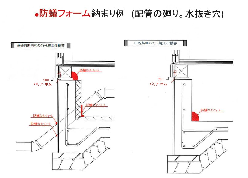 こちらは防蟻用の吹付ウレタンフォームになります。白蟻が侵入しがちな配管穴やコンクリートの亀裂などに充填することにより、隙間にも防蟻効果を発揮し、徹底的に侵入させないように対策を行います。