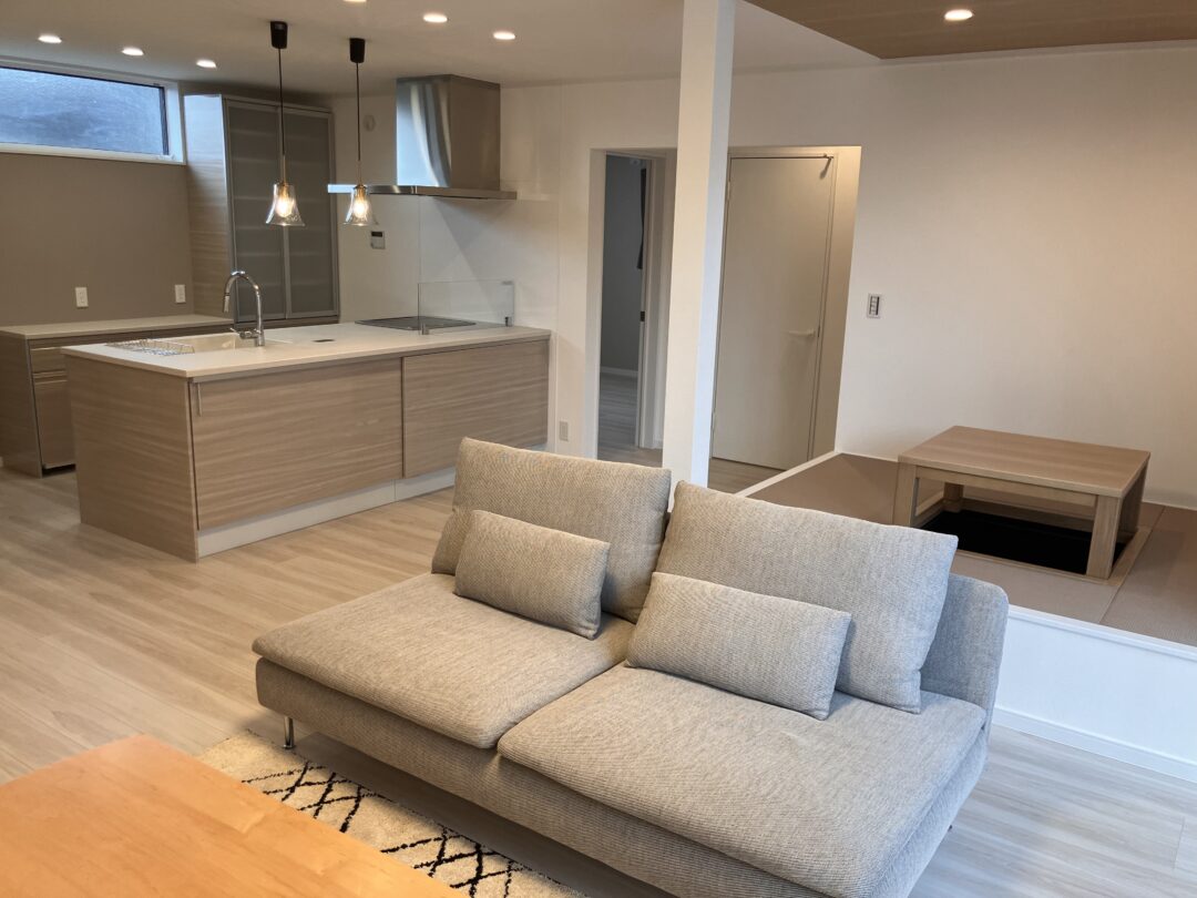 やさしい色合いで統一された柔らかなLDK、小上りの畳スペース、ラグジュアリーなハイドアの建具などにも注目してください。