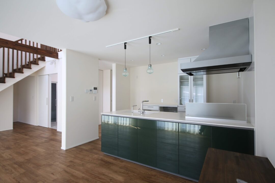広々としたLDKは折り下げ天井のキッチンを中心に家族が自然と集まる空間となり、毎日の暮らしに温かな時間をもたらします。