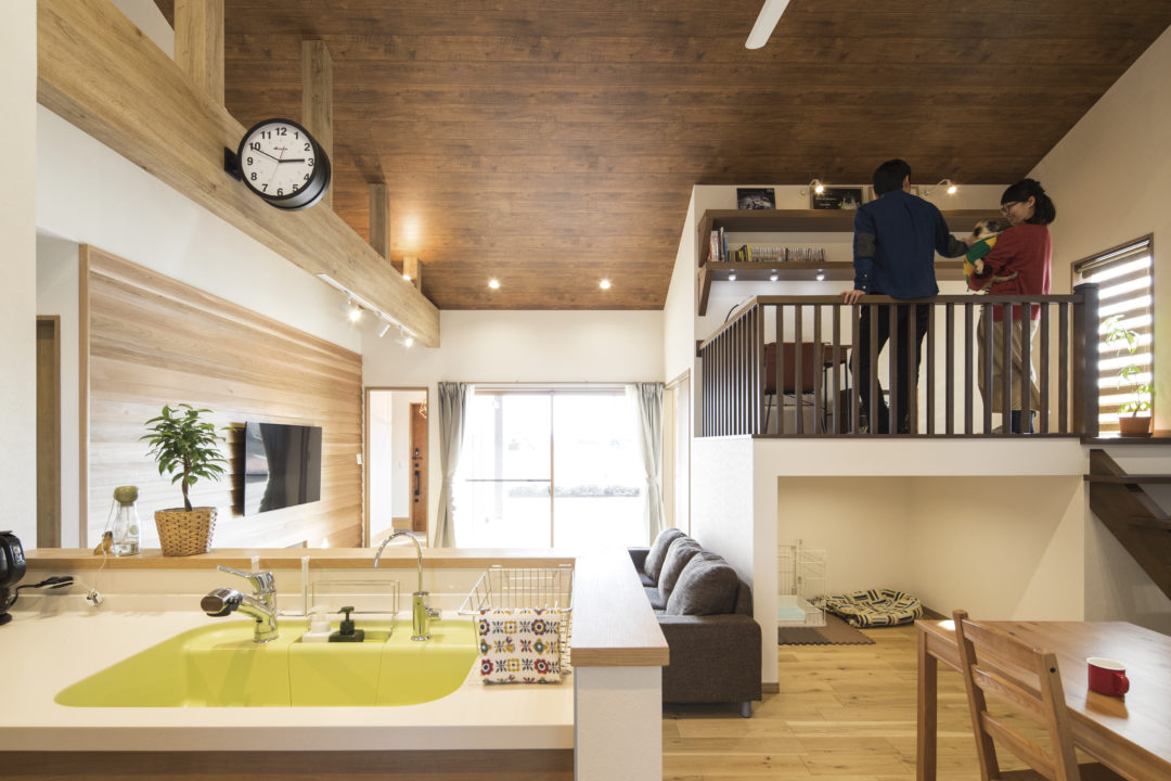 天井の一部を板張りにすると、間仕切りはなくともゾーニングでき、空間にメリハリをつけることができます。リビングダイニングであればキッチンだけを板張りにしたり、ワークスペースだけをしたり… ポイントで使うのもとってもおしゃれです。