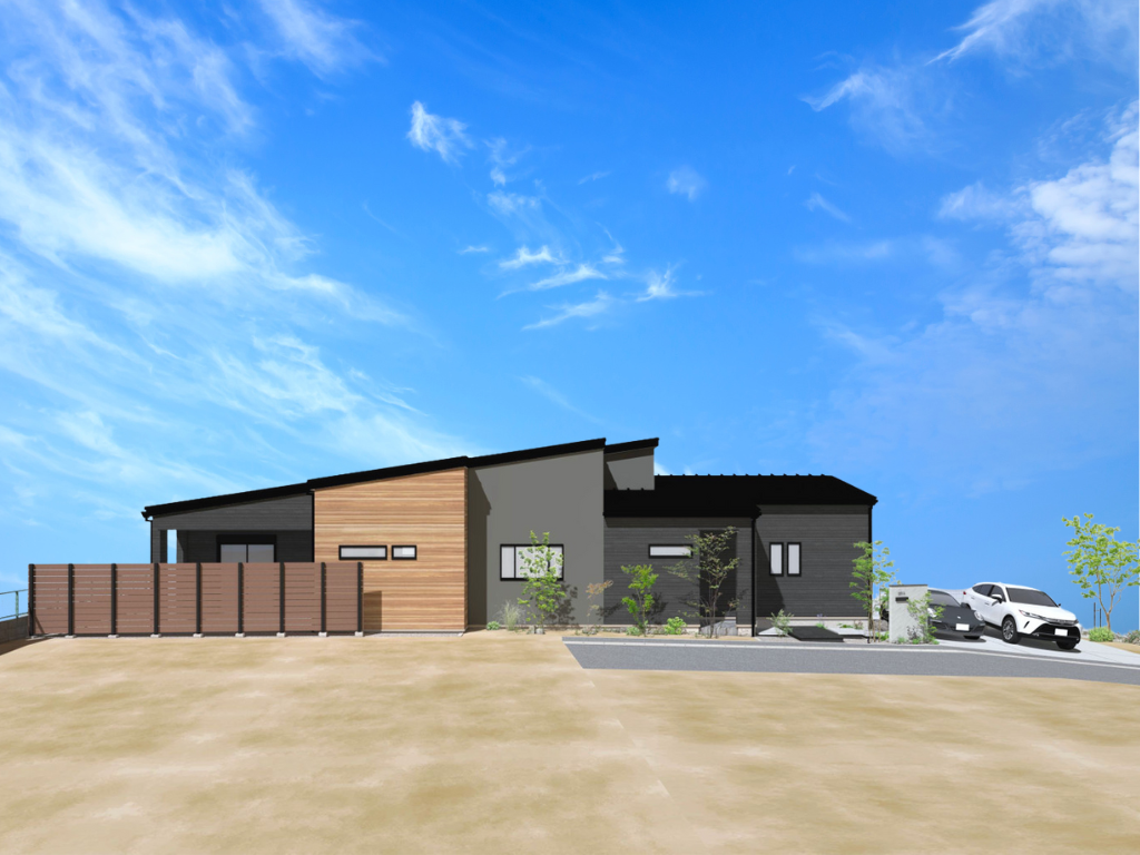 横長の敷地形状を活かし、片流れ屋根が描く美しい水平ラインが印象的なナチュラルモダンな外観デザイン。