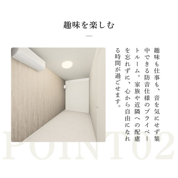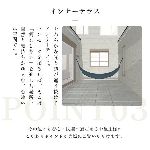 光と風を感じながら、くつろぎの時間が流れるインナーテラス、これからの季節に重宝する床暖房、趣味の時間を愉しむ防音室、そしてプライベート感のあるシャワー室。