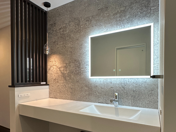 玄関すぐの造作洗面は、帰宅後の“ただいま手洗い”が自然な習慣に。美しさと機能性を兼ね備えた、上質なホテルライクな暮らしを。