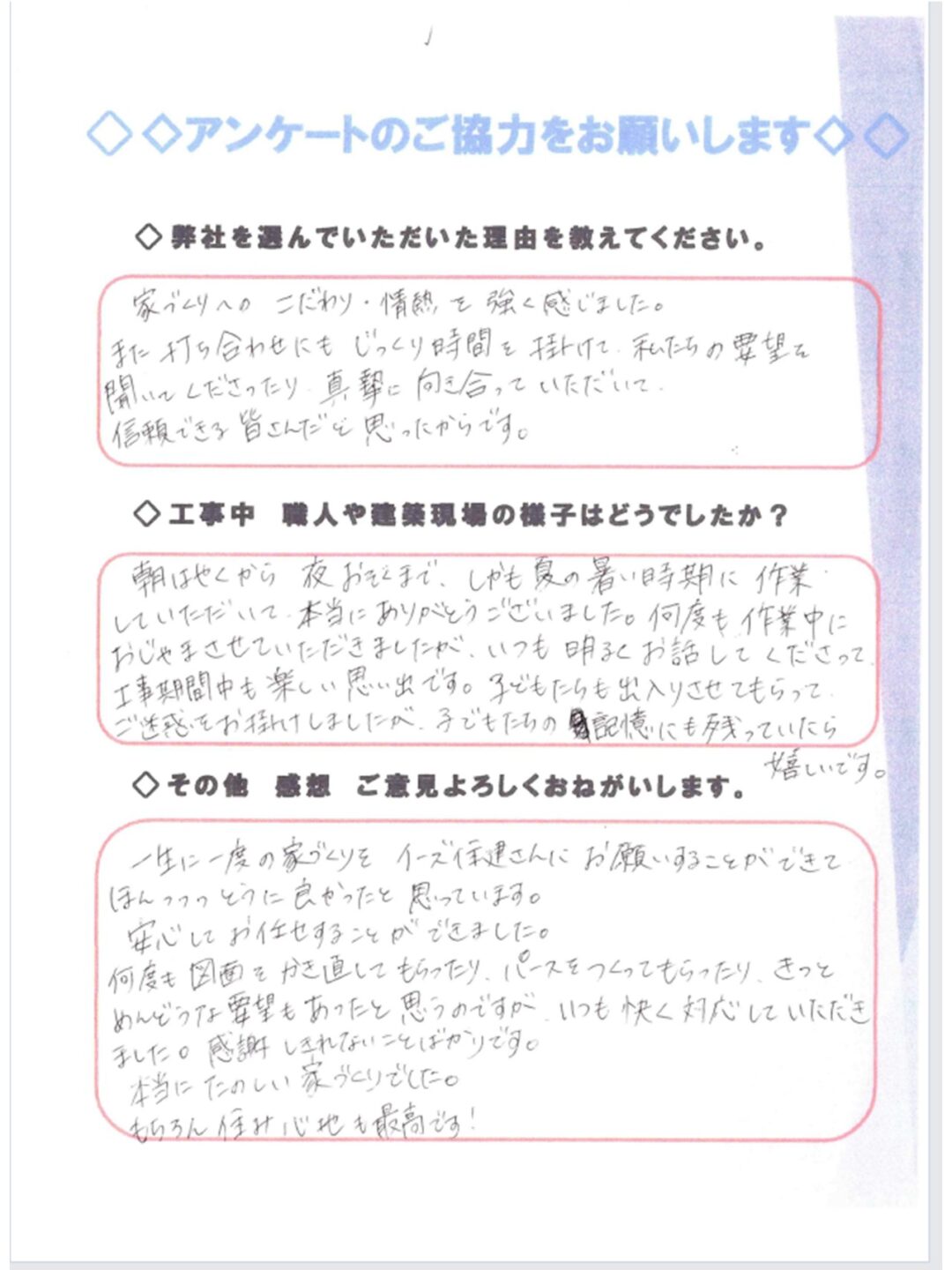 お引渡し後に施主様やご家族様からアンケートをいただきました!
