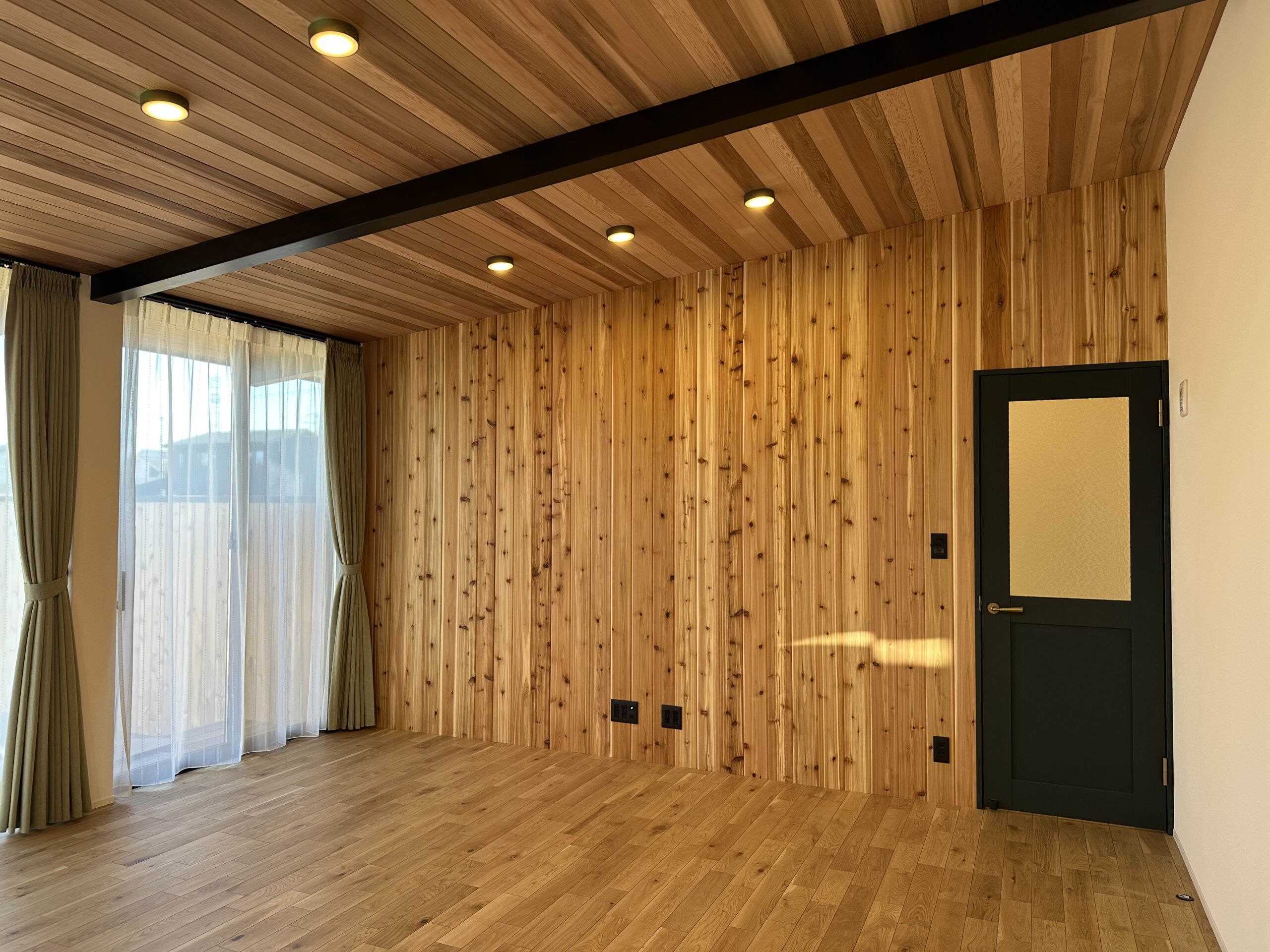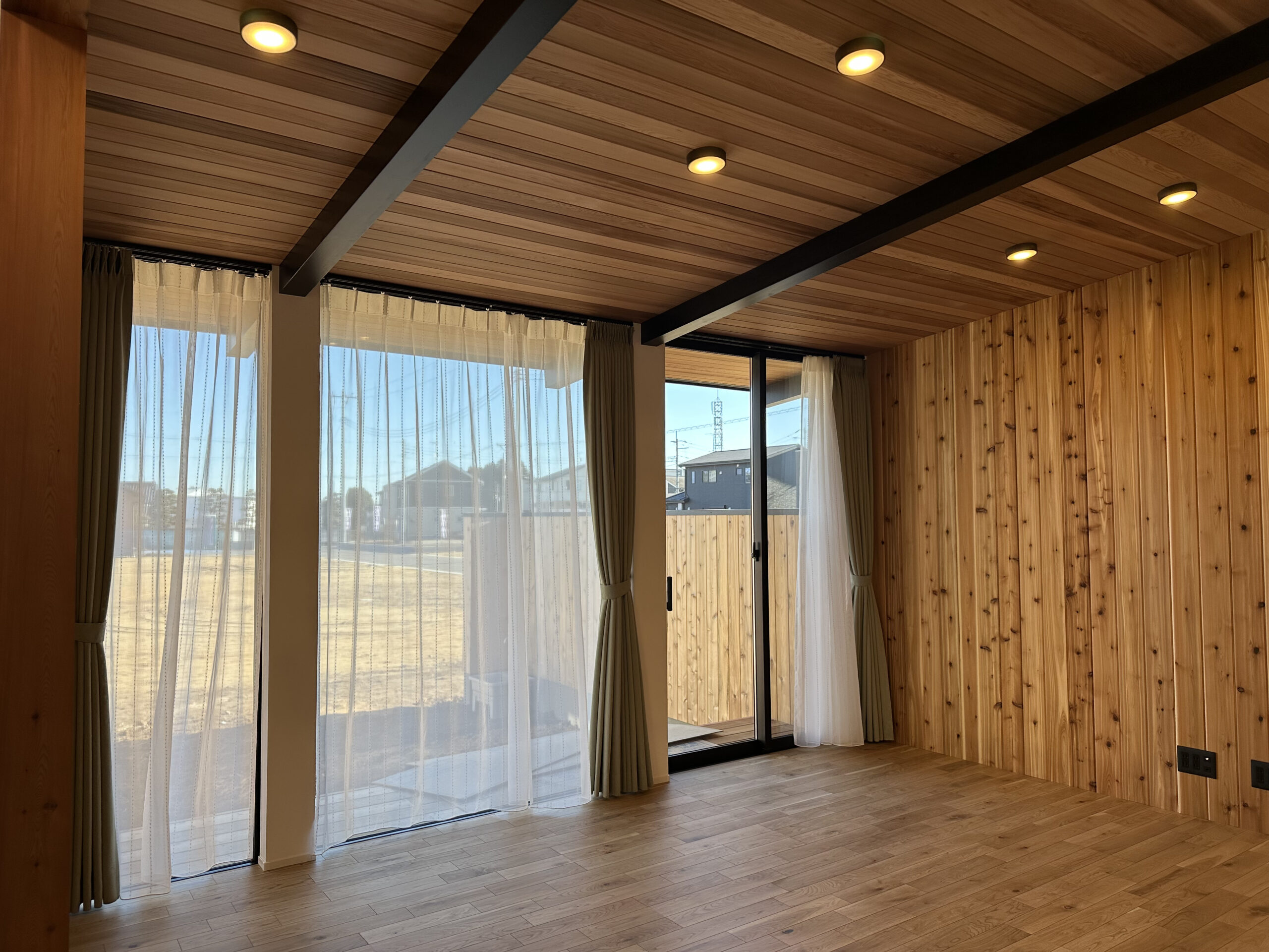 アメリカンローカルハウスの平屋をイメージした開放的なリビング、L字デッキで庭を囲むプランで、室内と屋外の一体感を演出。