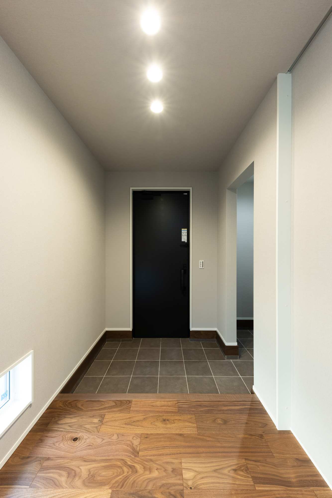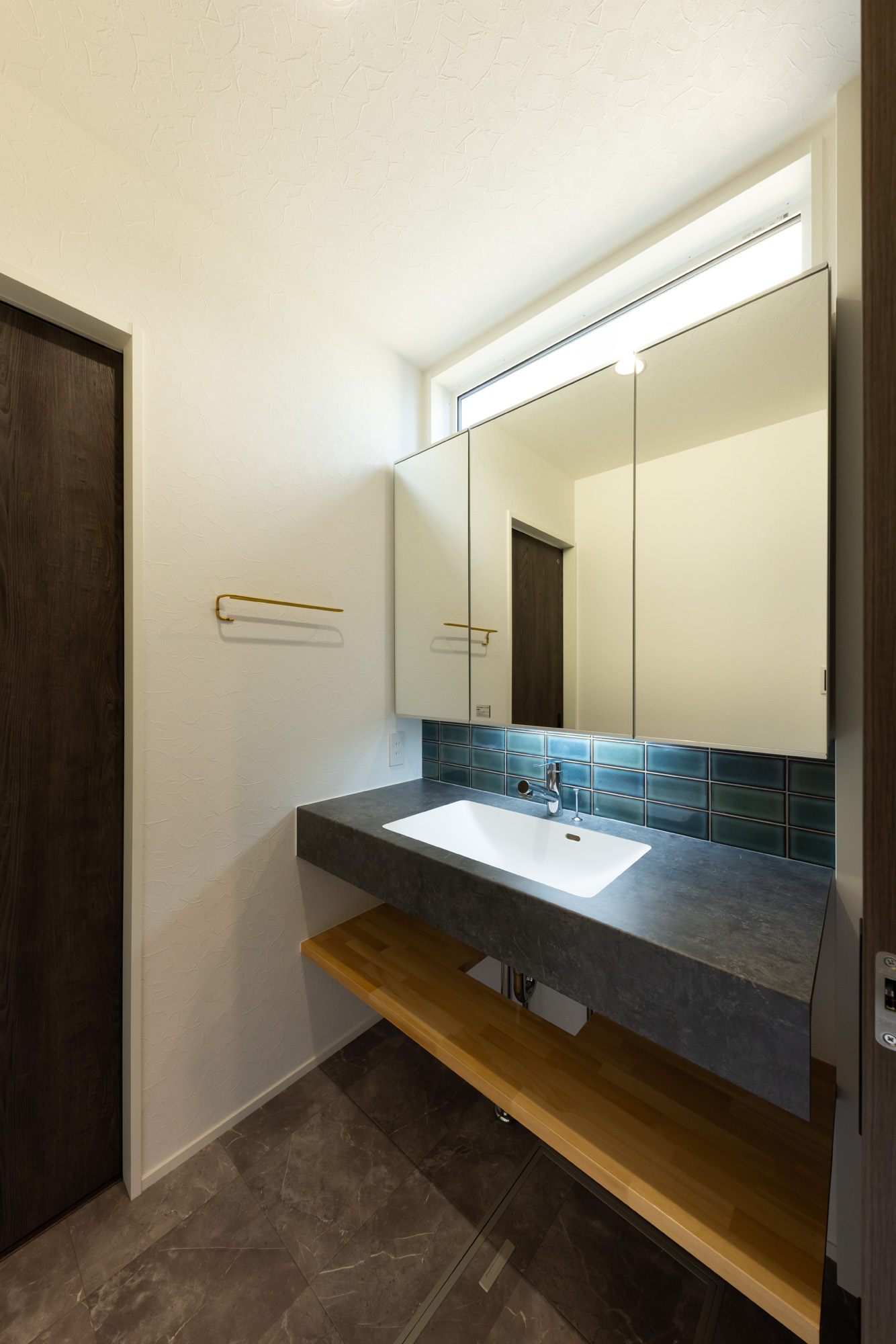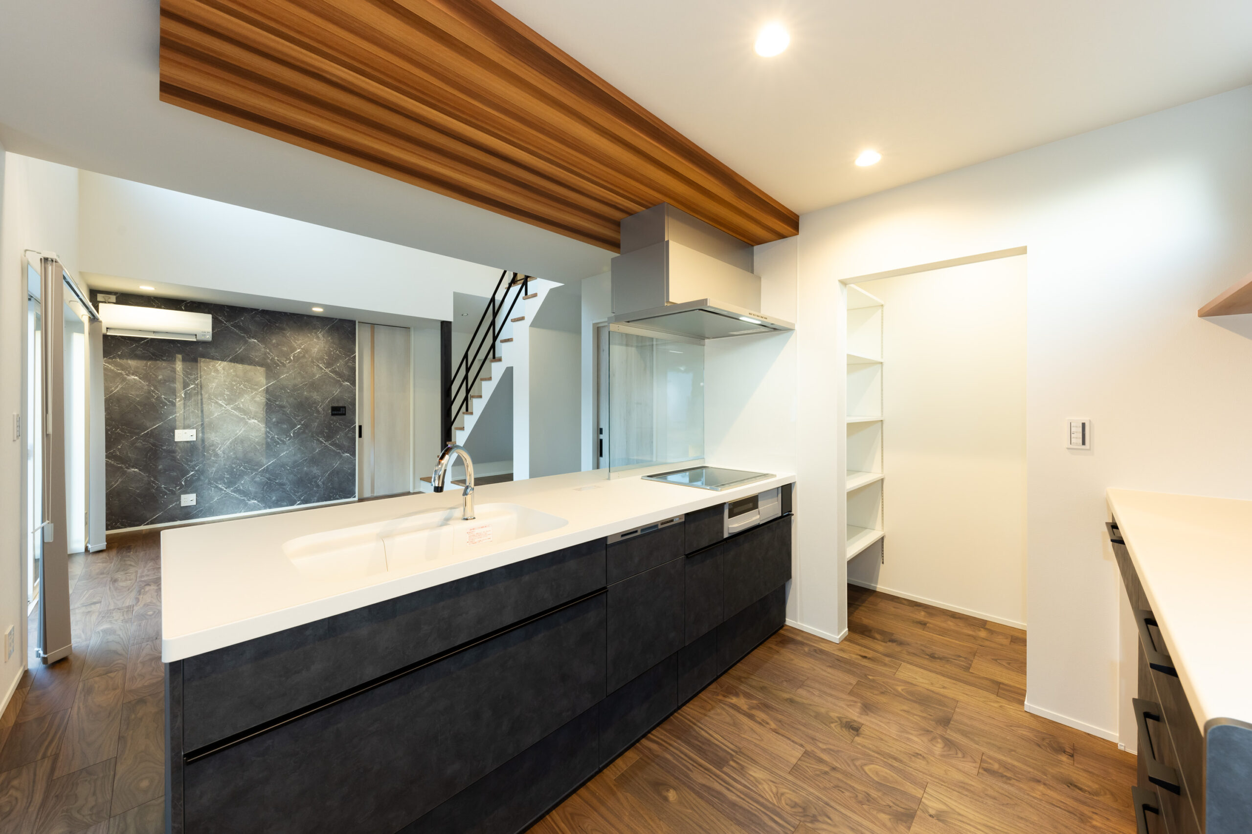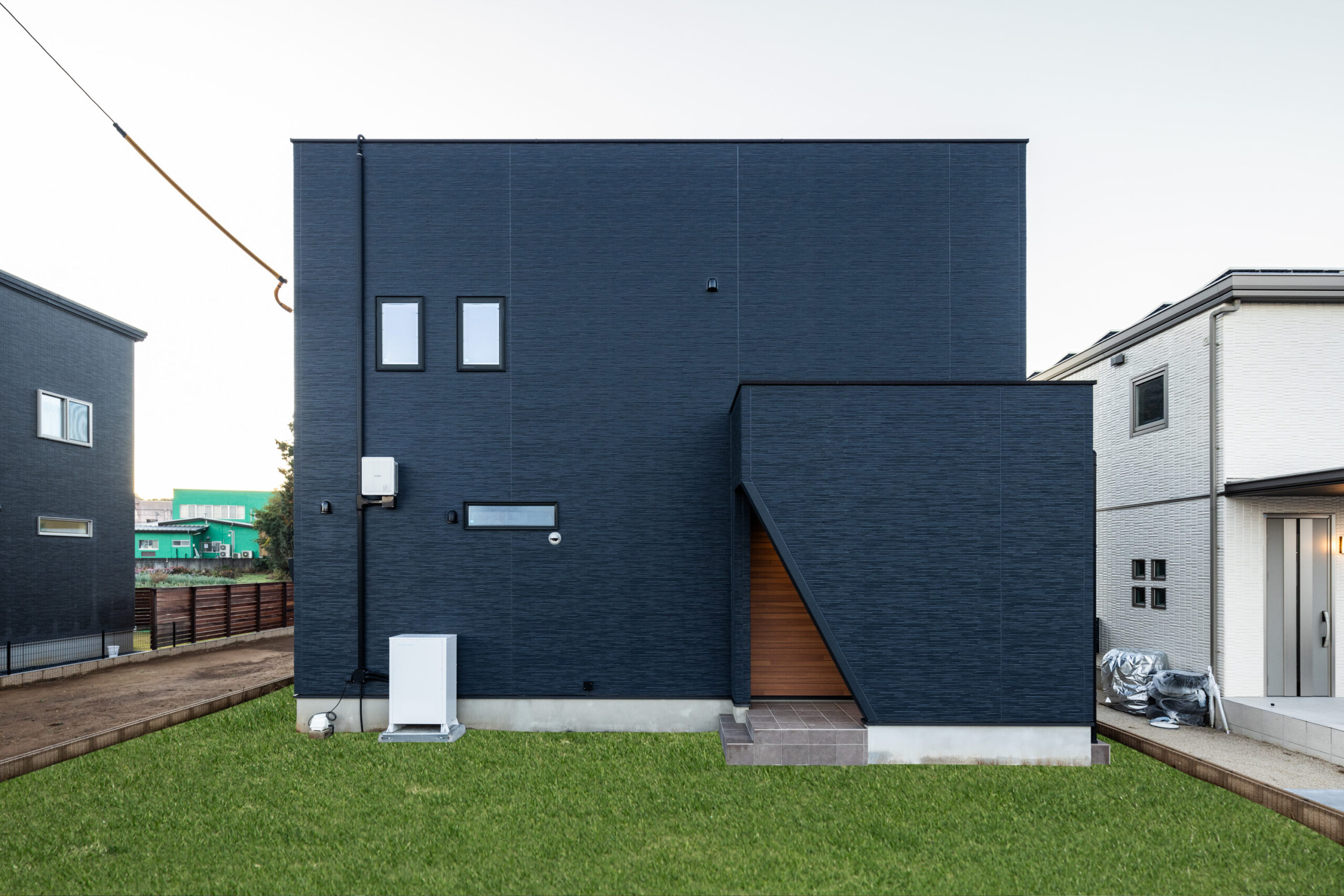 斜めにカットされた外壁により、プライバシーを保ちながらも存在感を放つ玄関ポーチが魅力的なモダンな外観。吹き抜けとアイアン手摺の造作スリット階段がより開放感を感じさせるLDKは、階段下にヌックを設けることで、秘密基地感覚で自分時間を楽しめます。休日はリビングダイニングから地続きに繋がるタイルデッキでBBQを楽しんだりできるのもポイントの一つです。アイアン手摺で開放感を感じる2階ホール、お仕事や読書に集中できる書斎など、ご家族のこだわりが詰まったお住まいが完成しました。