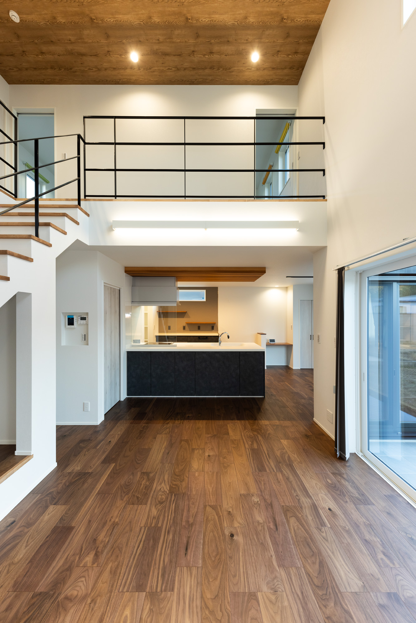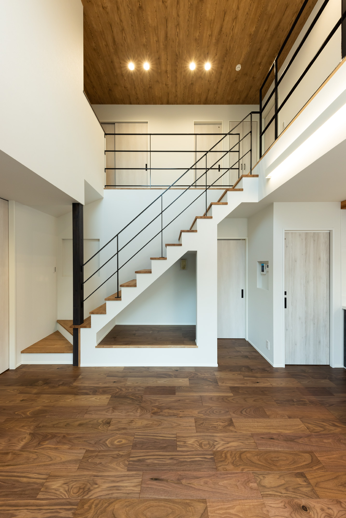 ヌックと吹き抜け、造作階段のあるモダンなお住まい