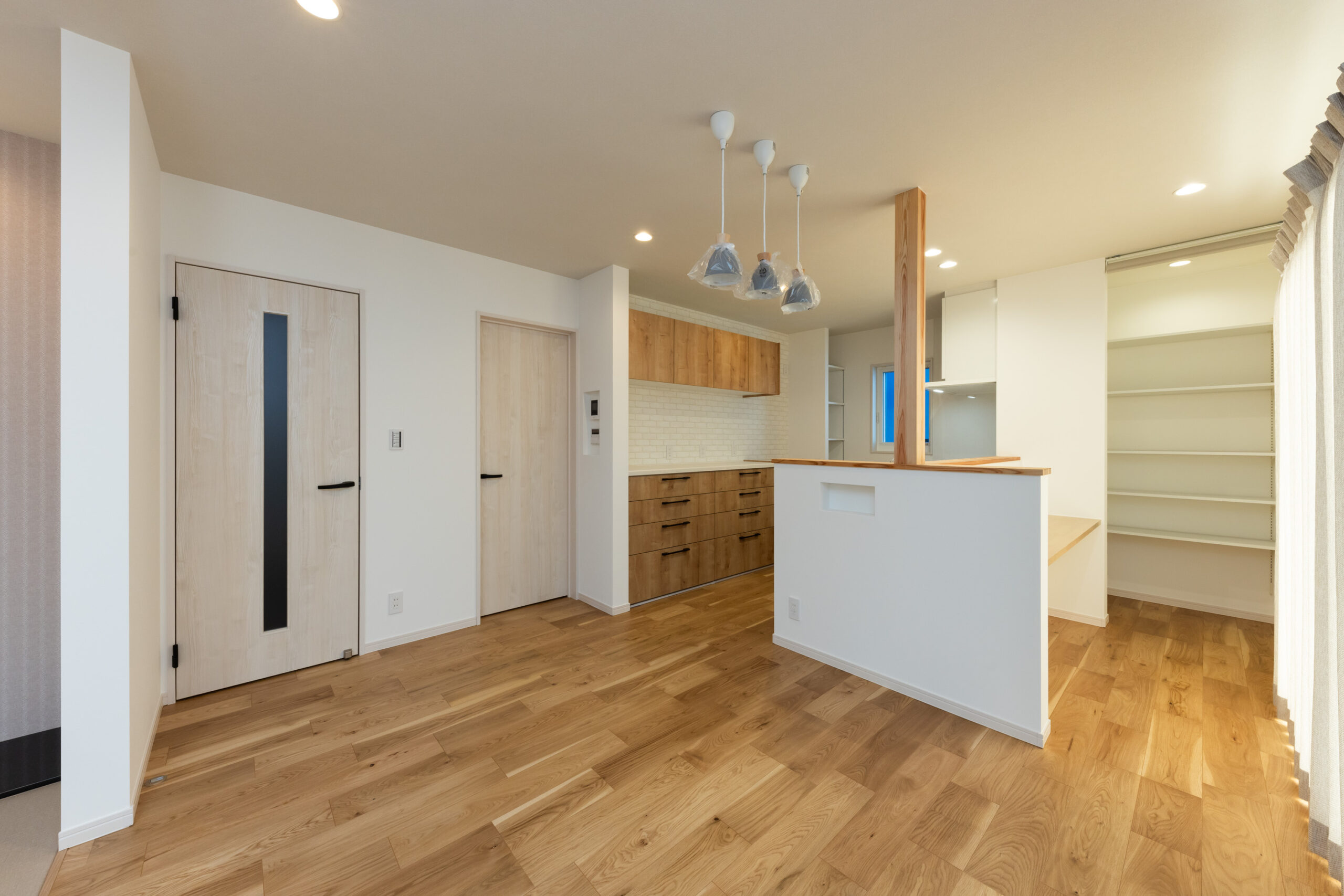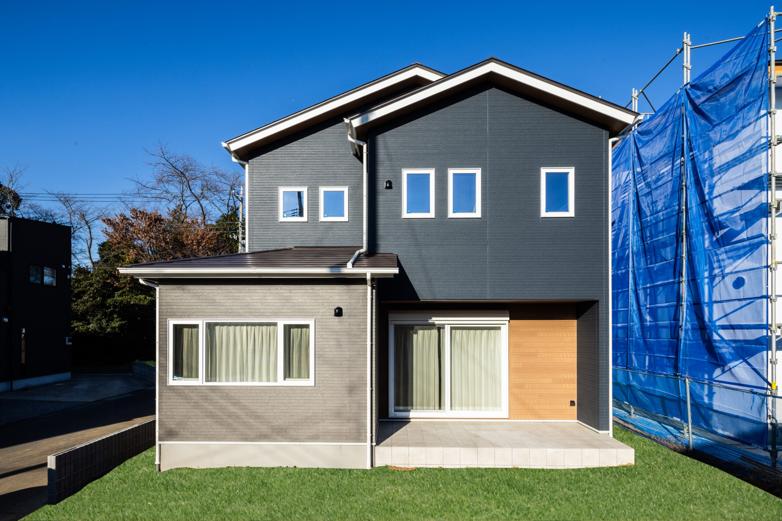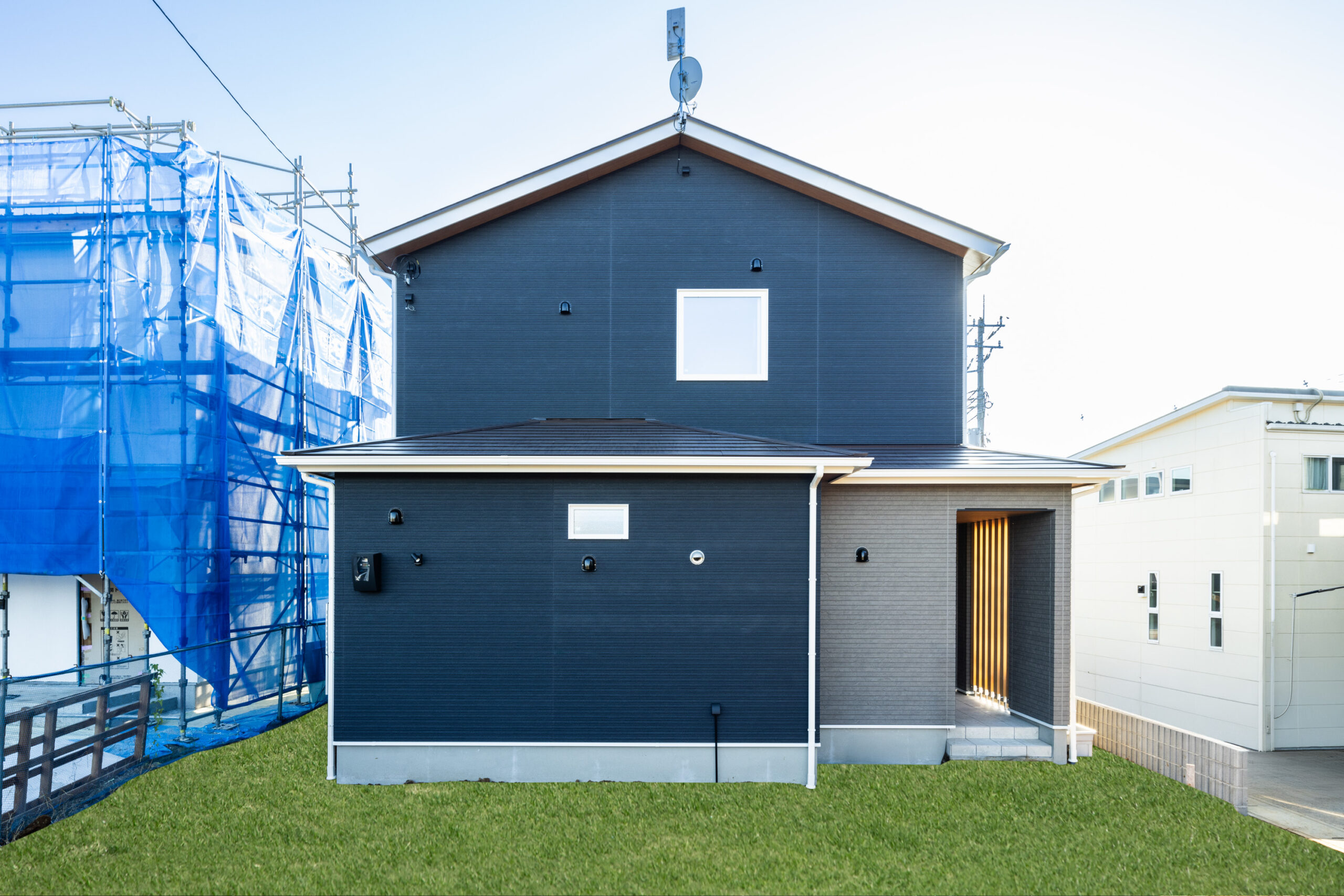 紺、グレー、ウッド調の外壁がコントラストとなった外観。室内は白を基調に、木目やクリーム色で空間を統一することでナチュラルな雰囲気の可愛らしい空間です。LDKには、化粧柱で仕切りをつくらずに空間を分けた和室を設けることで、ナチュラルテイストを崩すことなく和を感じることができます。キッチン向かいの造作カウンターで勉強をするお子様の様子を眺めながら家事をできるのも奥様の工夫ポイントの一つです。また、1階洗面脱衣室から2階へ上り、サンルームで室内干しをした後そのまま隣のウォークインクローゼットへ収納できる動線が家事ラクを実現します。生活のしやすさを考えたお住まいが完成しました。