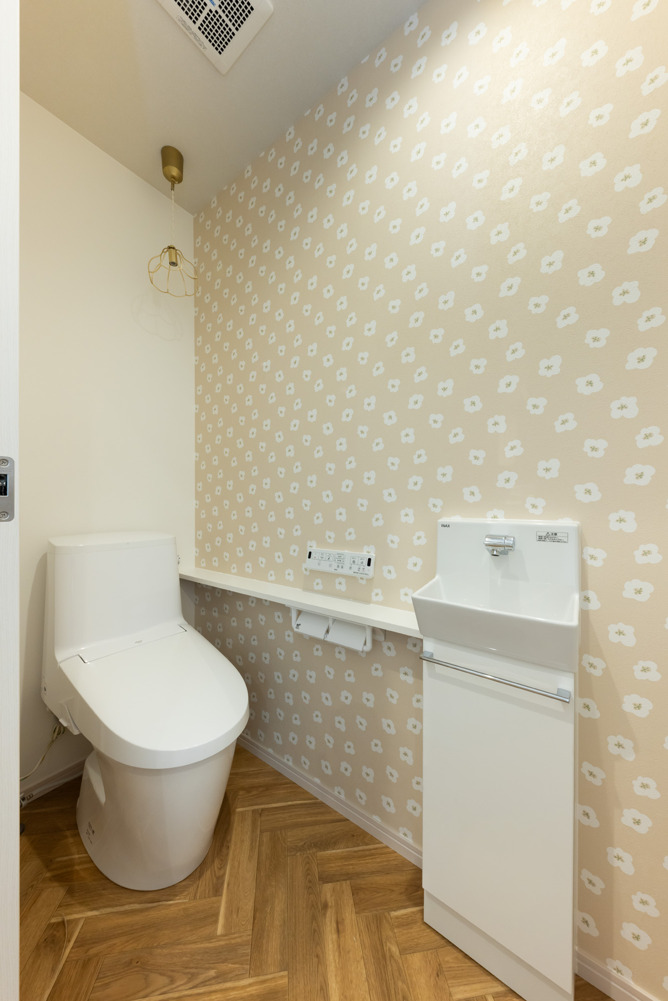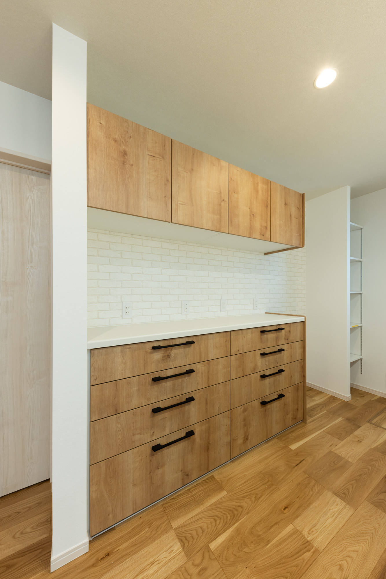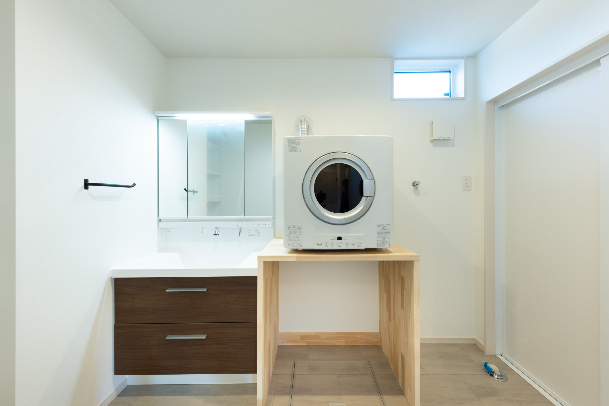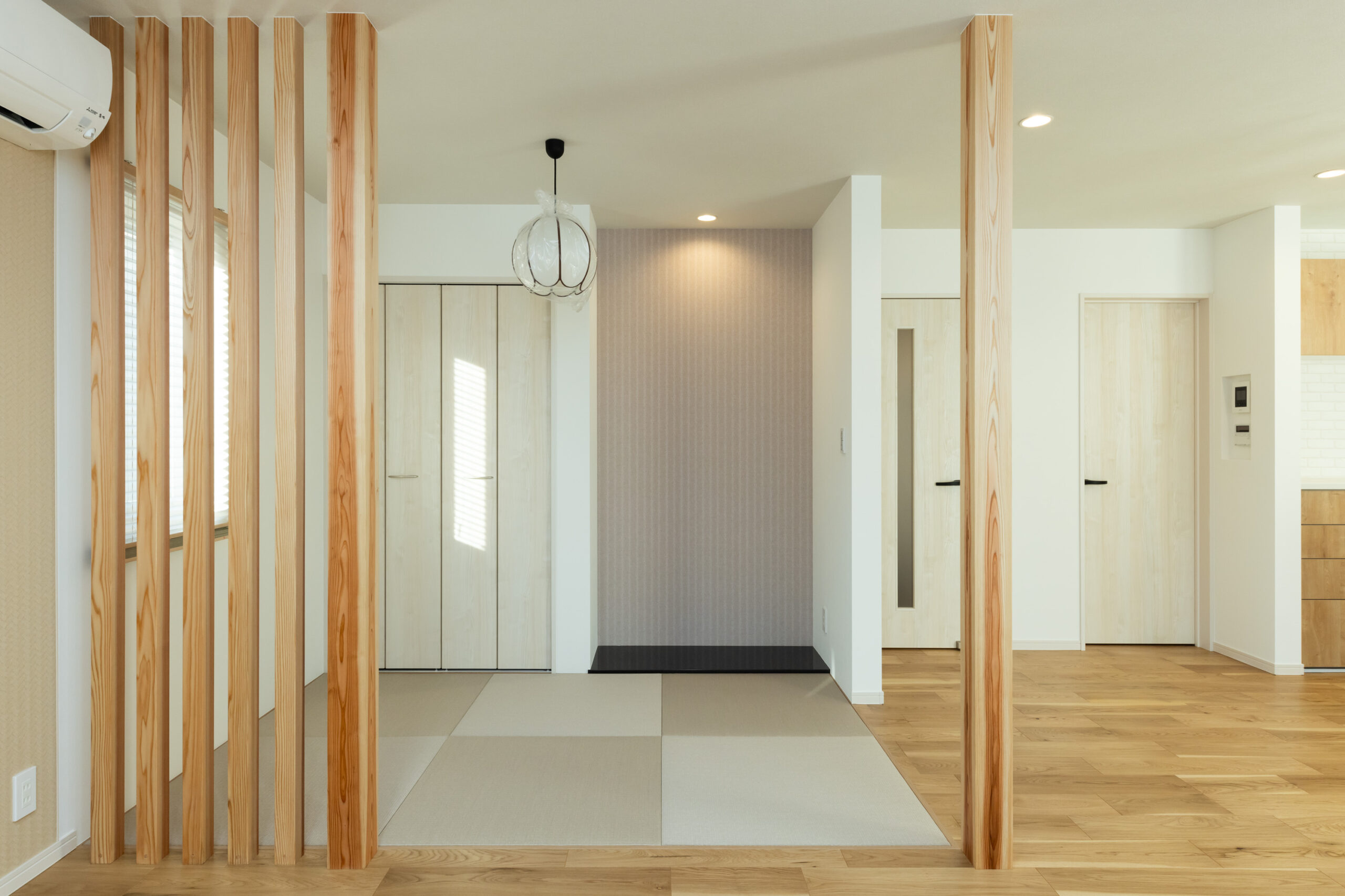 紺、グレー、ウッド調の外壁がコントラストとなった外観。室内は白を基調に、木目やクリーム色で空間を統一することでナチュラルな雰囲気の可愛らしい空間です。LDKには、化粧柱で仕切りをつくらずに空間を分けた和室を設けることで、ナチュラルテイストを崩すことなく和を感じることができます。キッチン向かいの造作カウンターで勉強をするお子様の様子を眺めながら家事をできるのも奥様の工夫ポイントの一つです。また、1階洗面脱衣室から2階へ上り、サンルームで室内干しをした後そのまま隣のウォークインクローゼットへ収納できる動線が家事ラクを実現します。生活のしやすさを考えたお住まいが完成しました。