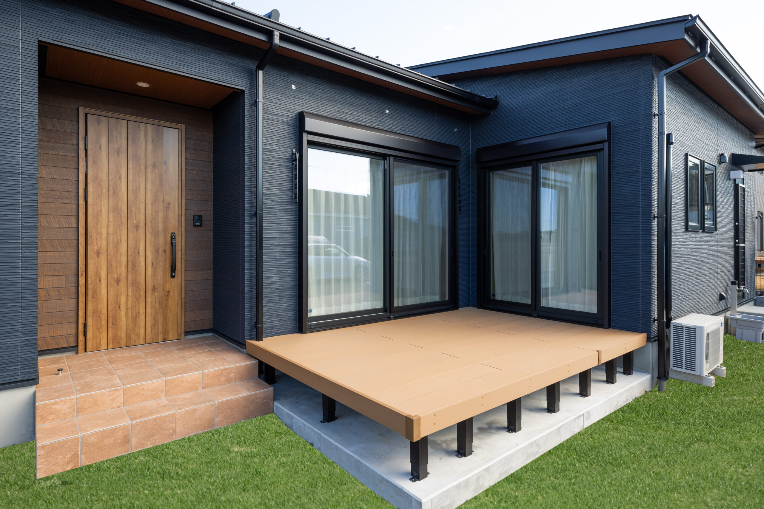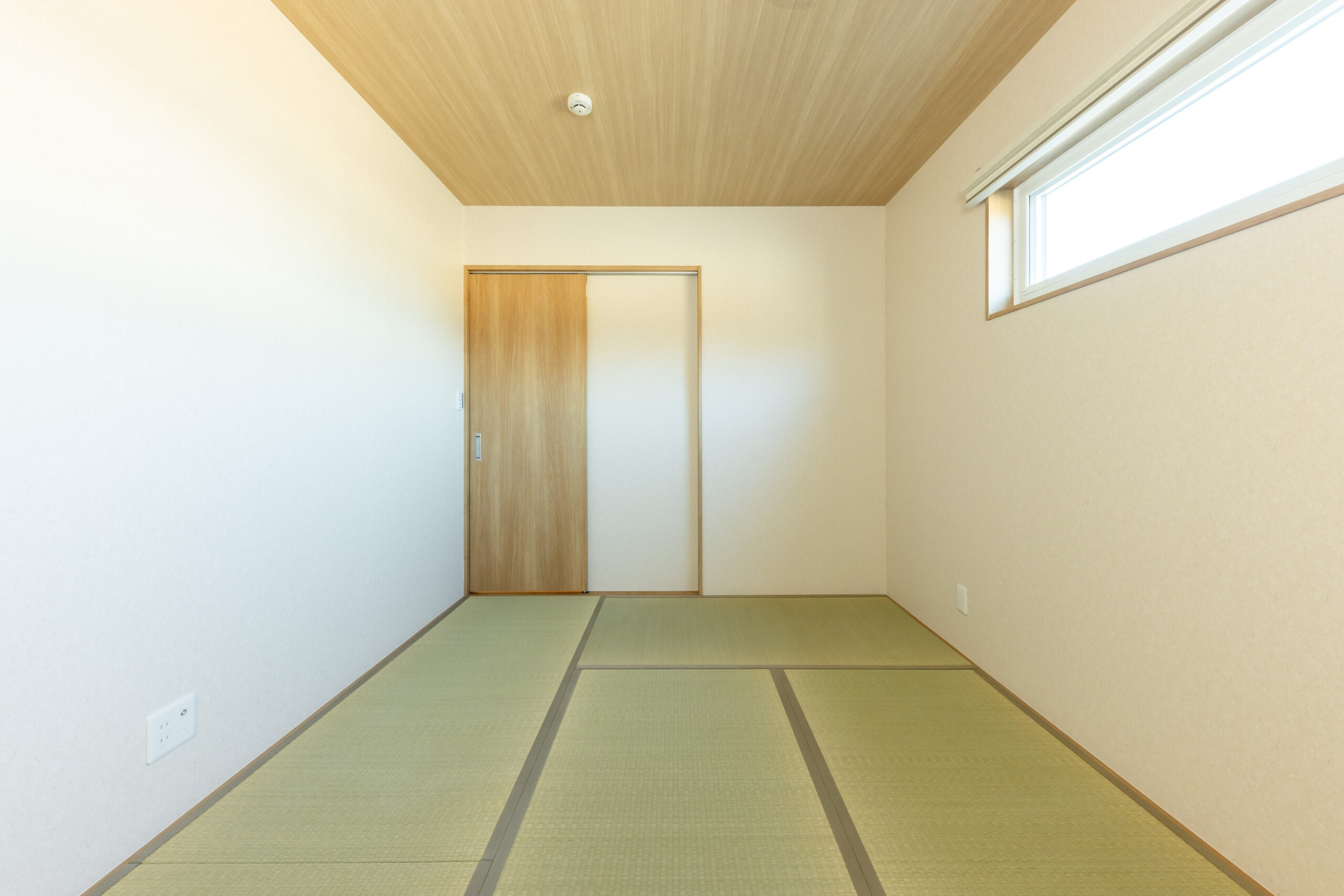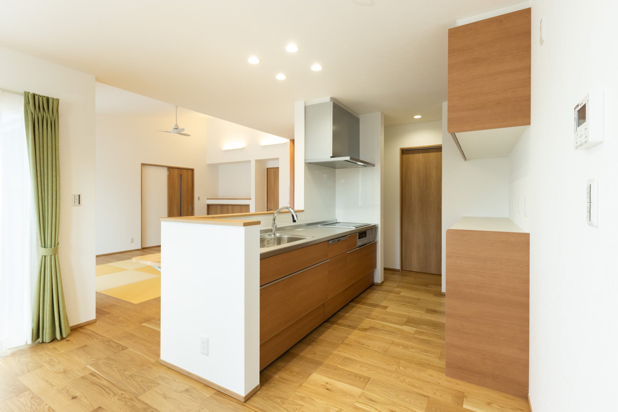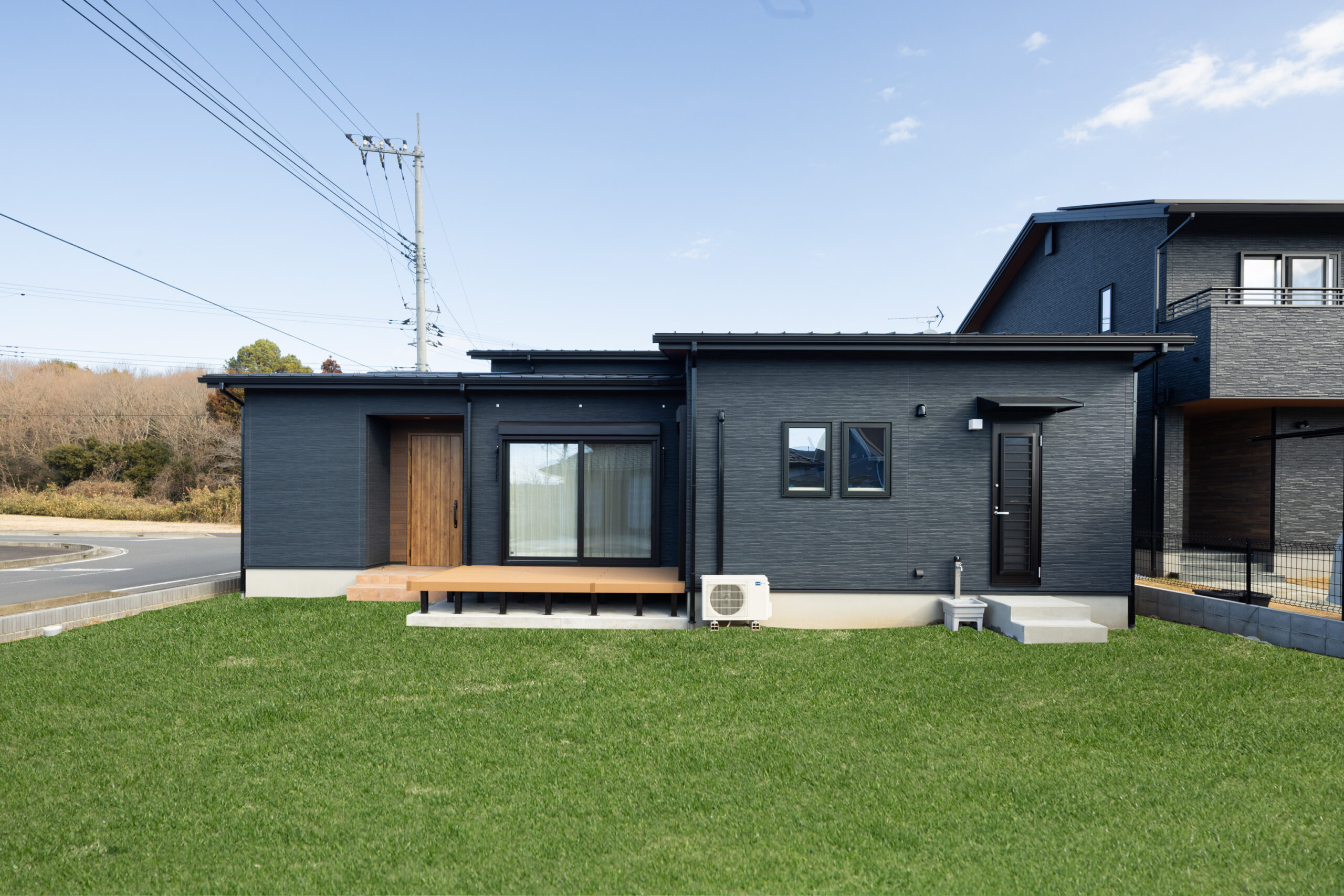 黒の外壁を基調に、玄関部分の壁面を木目調にすることでモダンな印象となった平屋の外観。勾配天井の開放感あるリビングには、中心部分に畳スペースを設けることで、家族みんなでゴロっとしながらTVを見たりして過ごせます。趣味の本を楽しめるキッチン向かいの造作カウンターは、隣の可動棚に本を収納できるのもポイントです。洗面脱衣室からファミリークローゼット、ランドリースペースまでを一直線に繋いだ間取りが家事ラクを実現します。玄関収納や収納付きの造作カウンター、小屋裏スペースなど収納力をアップする工夫があるのも魅力です。ご夫婦の寝室は、イ草の畳にするなど、遊び心のある和モダンなお住まいです。