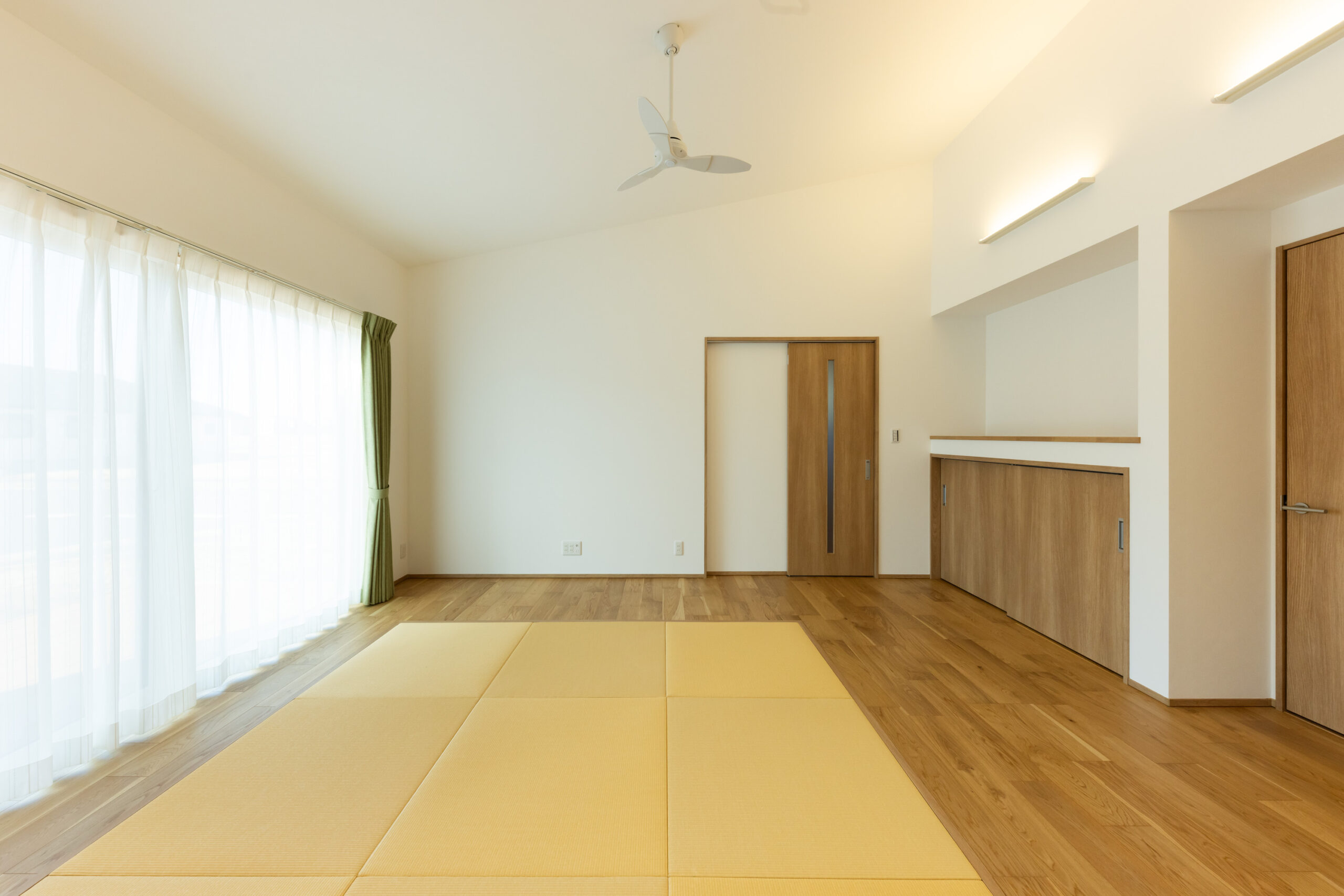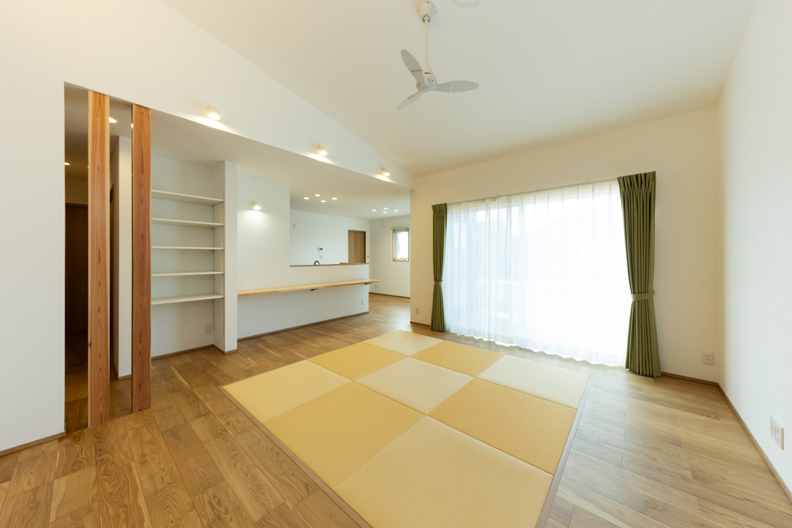 リビング中心に畳スペースを配置した遊び心感じる和モダンの平屋