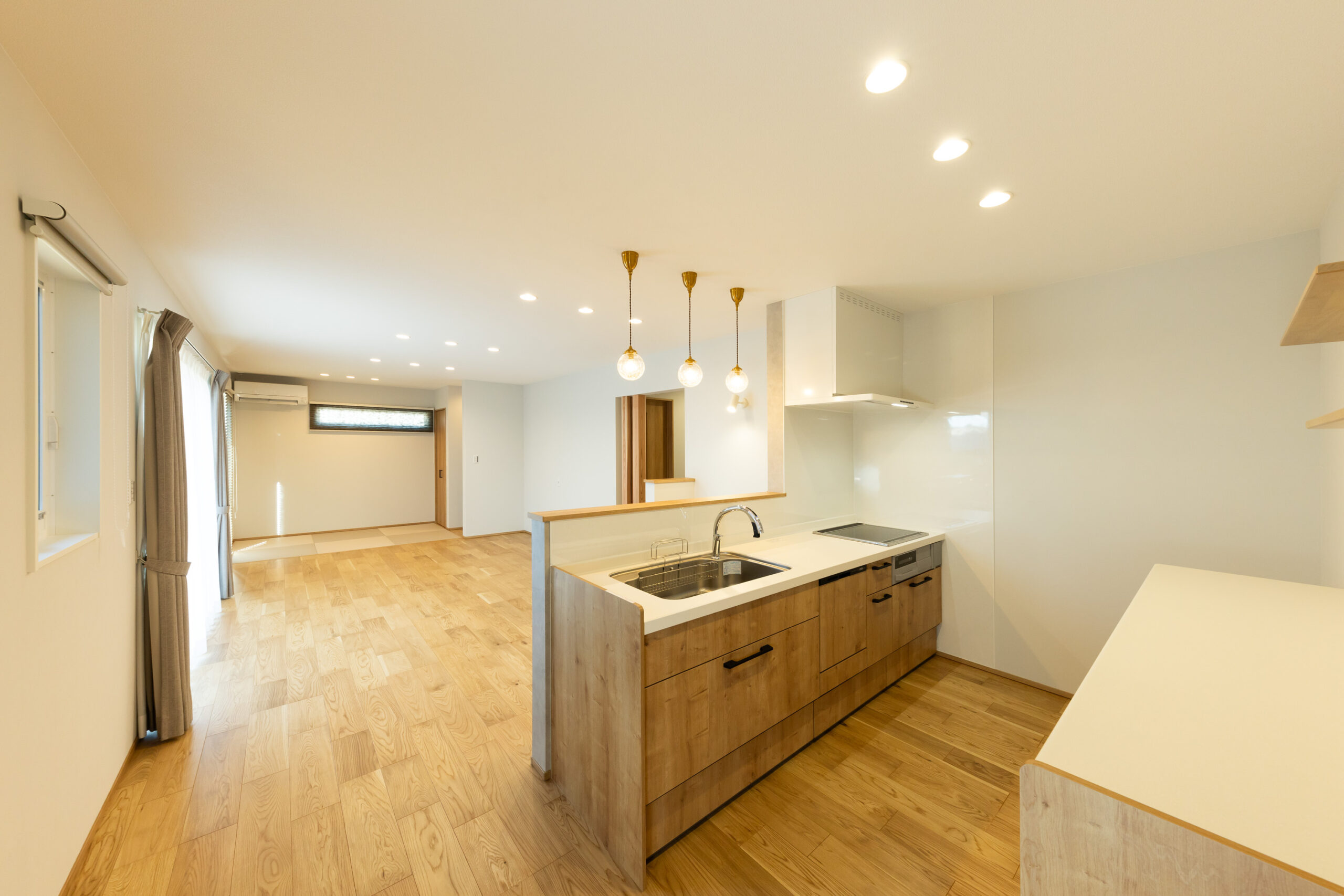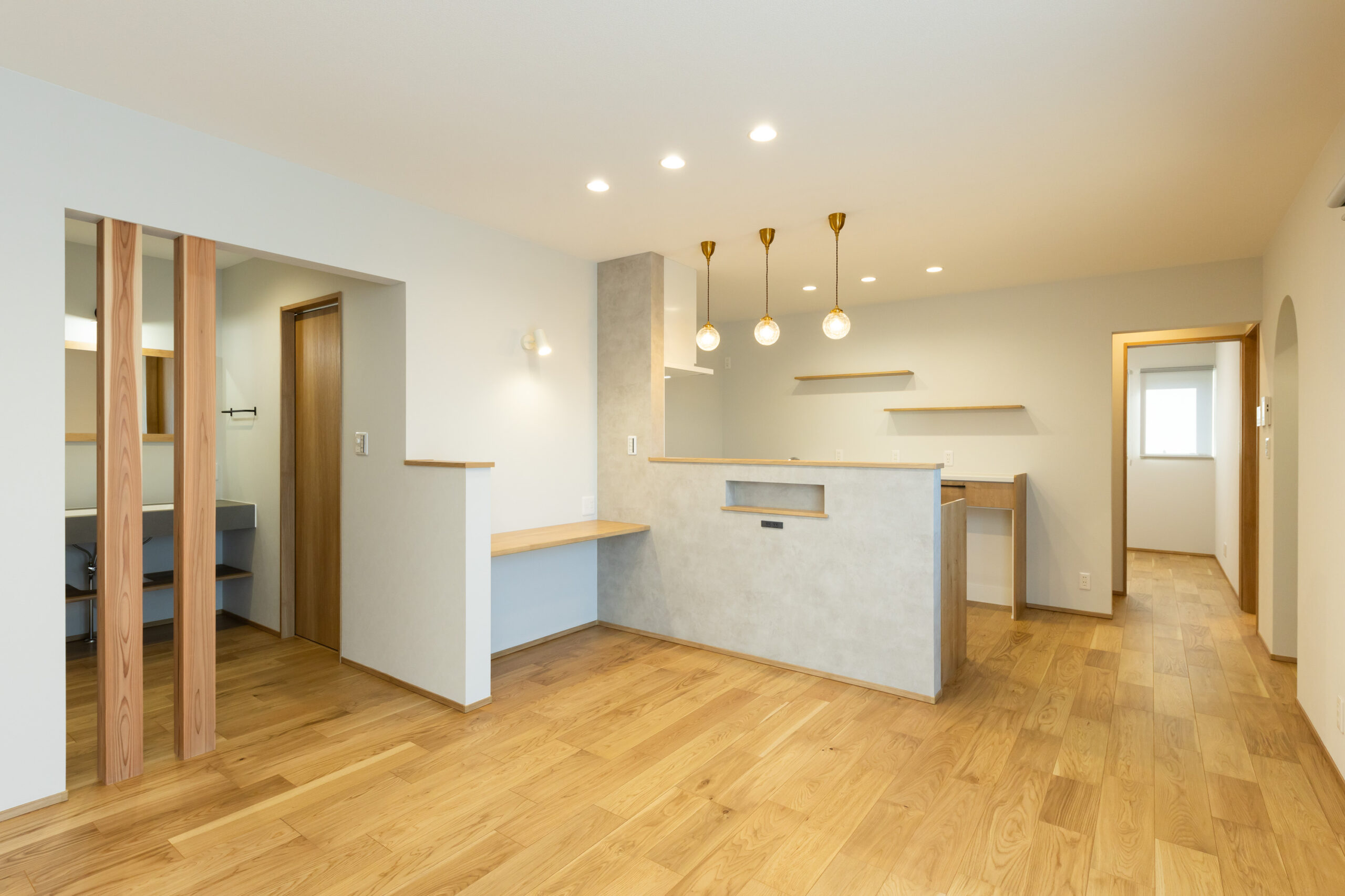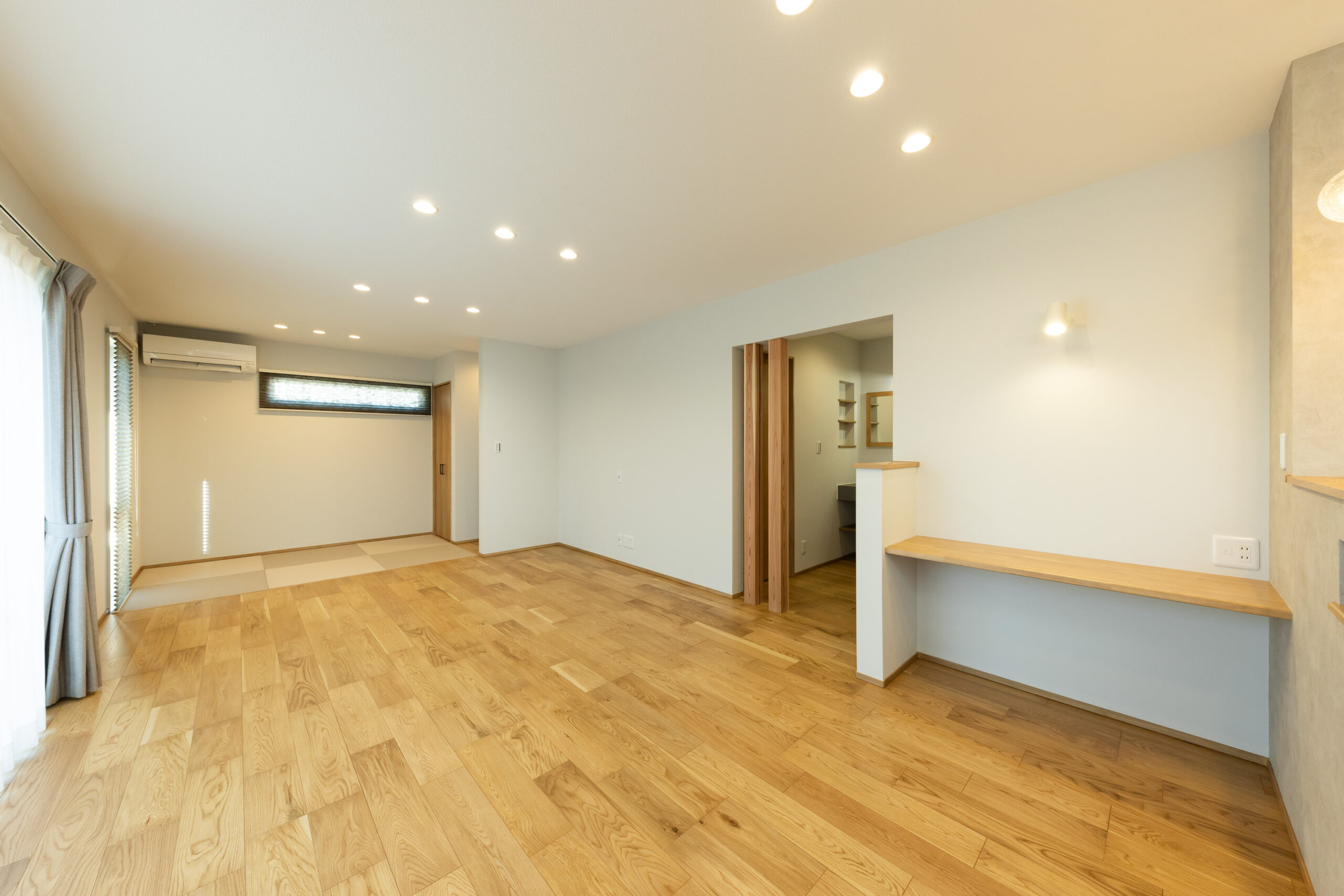 床や建具などをオークでまとめて、アクセントにくすみカラーを使用した、大人かわいい平屋。LDKの一角の畳コーナーは安心してお子様が遊んだり、寝転んだりできる特別空間に。ご家族で並んで使用できる広い造作洗面台や、ナチュラルな雰囲気をより感じる化粧柱など、お施主様のこだわりが細部まで感じられます。お住まい全体をナチュラルにまとめた、どこにいても心がホッと休まるお住まいが完成しました。