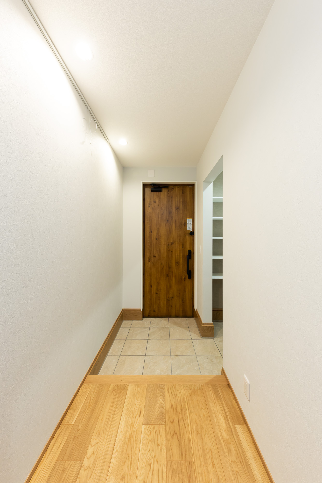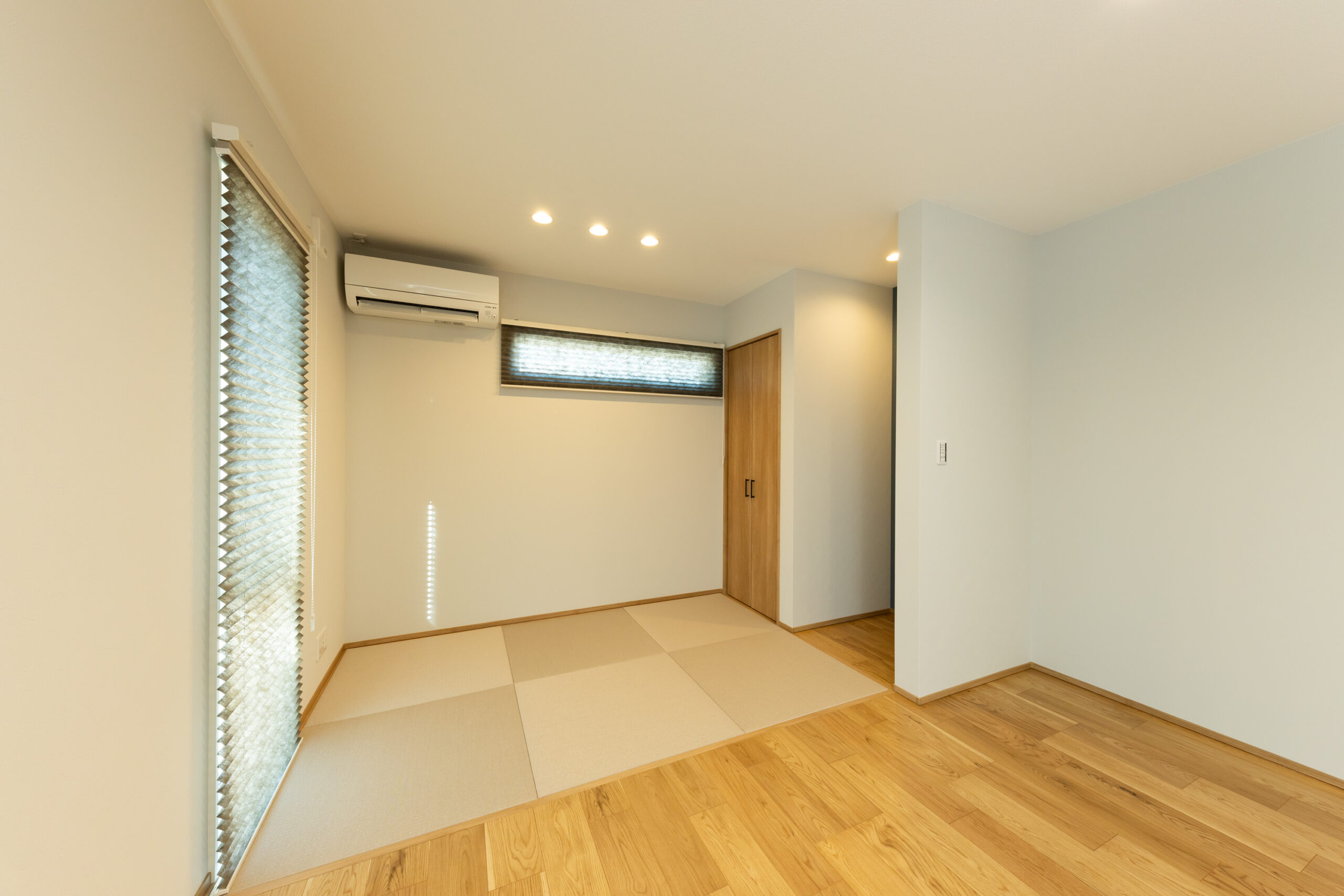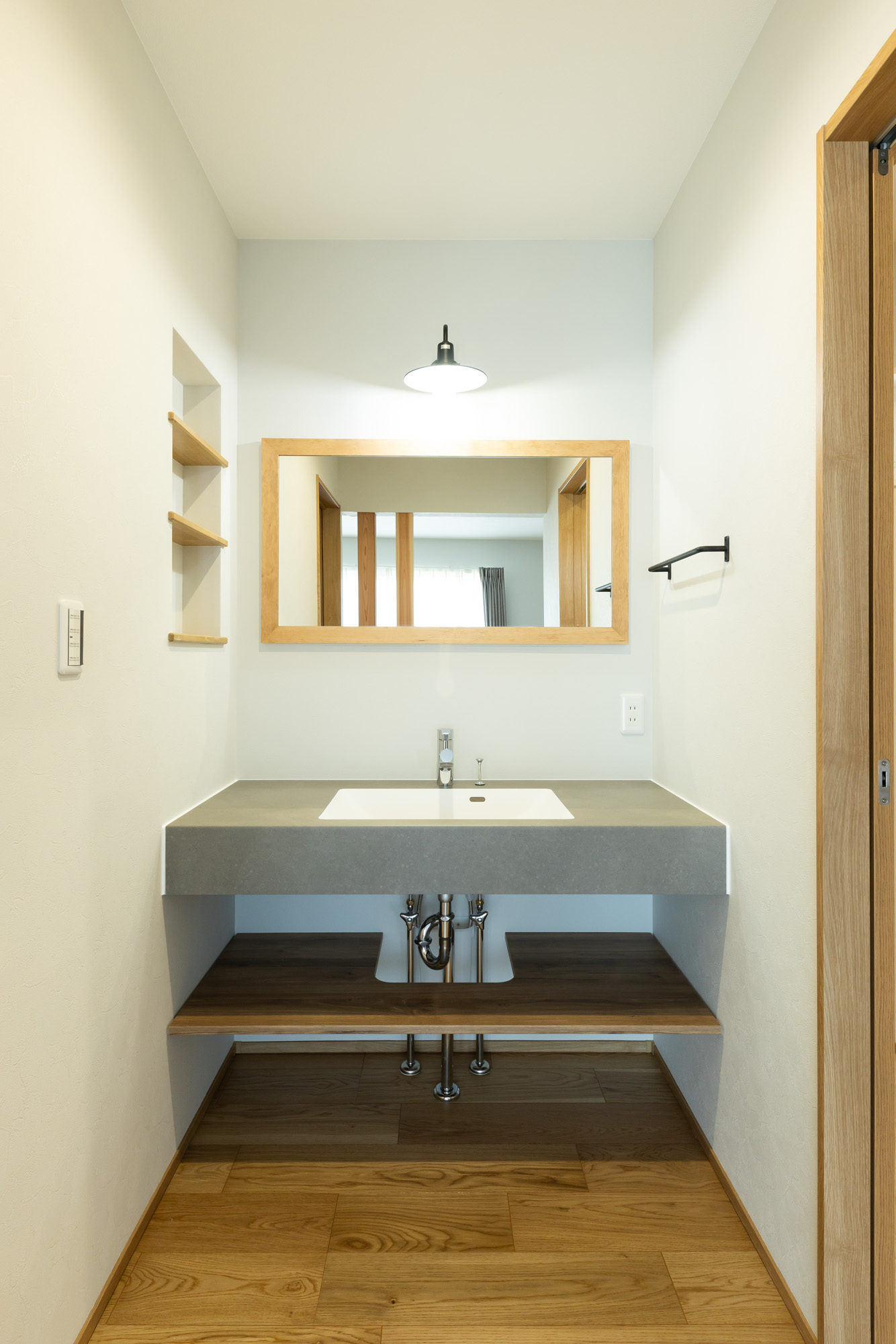 床や建具などをオークでまとめて、アクセントにくすみカラーを使用した、大人かわいい平屋。LDKの一角の畳コーナーは安心してお子様が遊んだり、寝転んだりできる特別空間に。ご家族で並んで使用できる広い造作洗面台や、ナチュラルな雰囲気をより感じる化粧柱など、お施主様のこだわりが細部まで感じられます。お住まい全体をナチュラルにまとめた、どこにいても心がホッと休まるお住まいが完成しました。