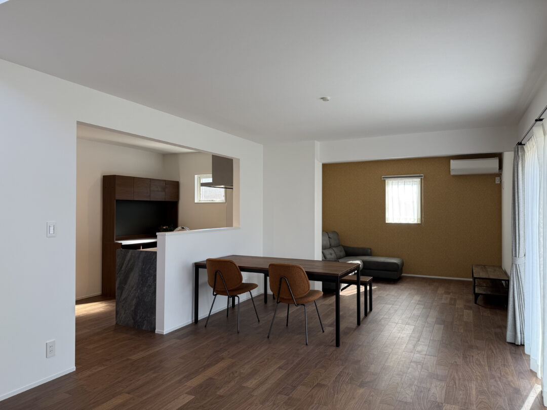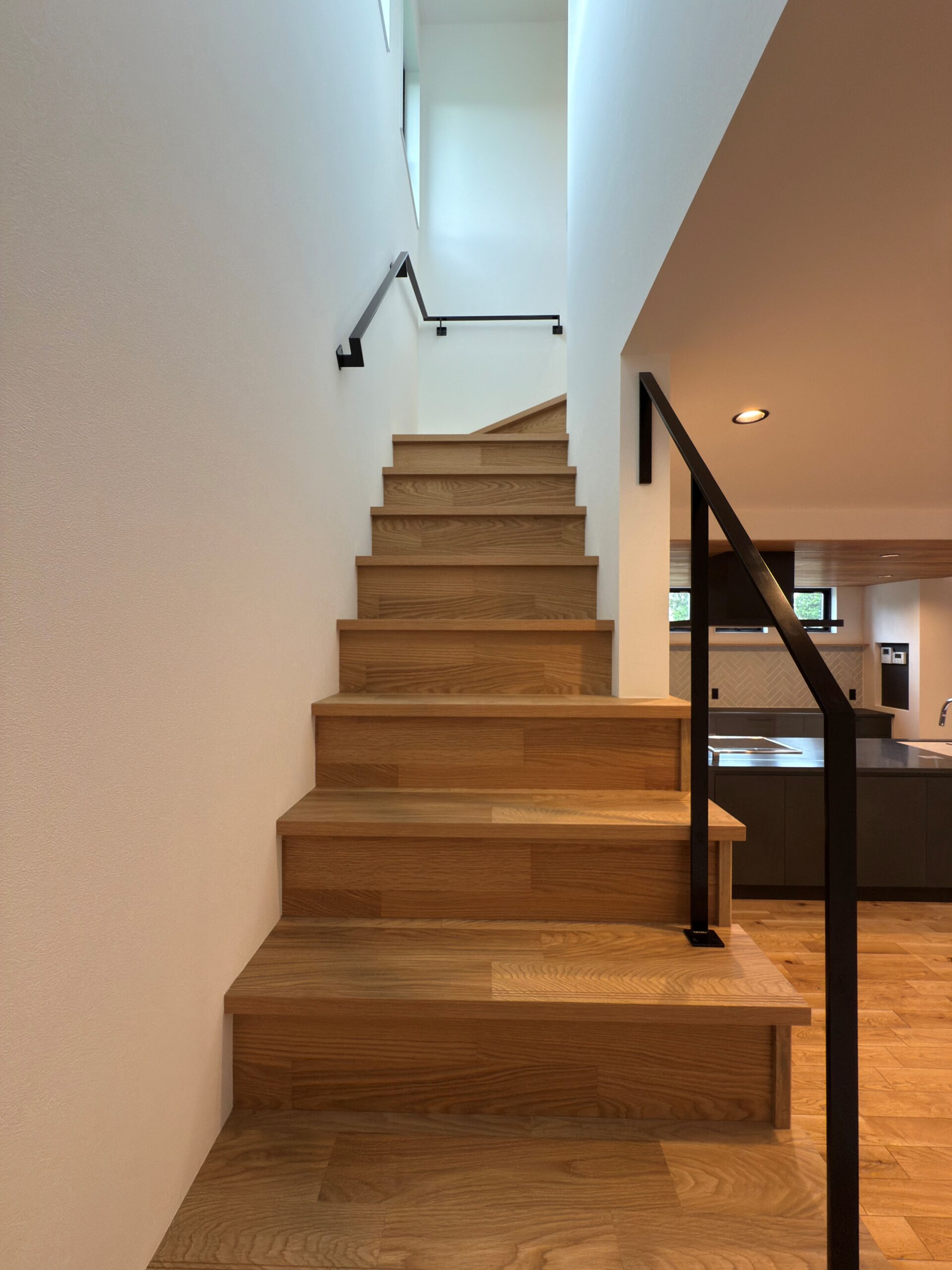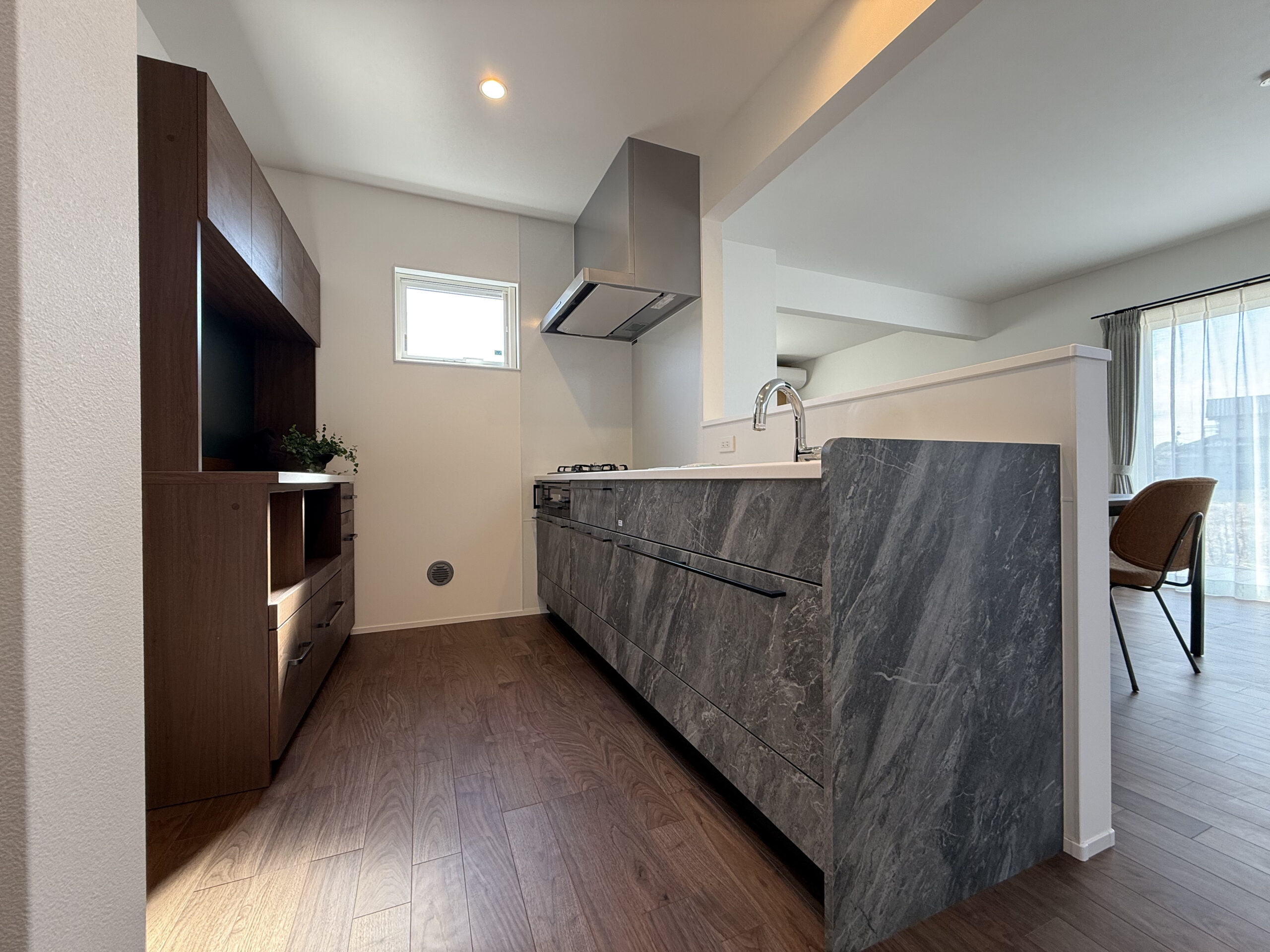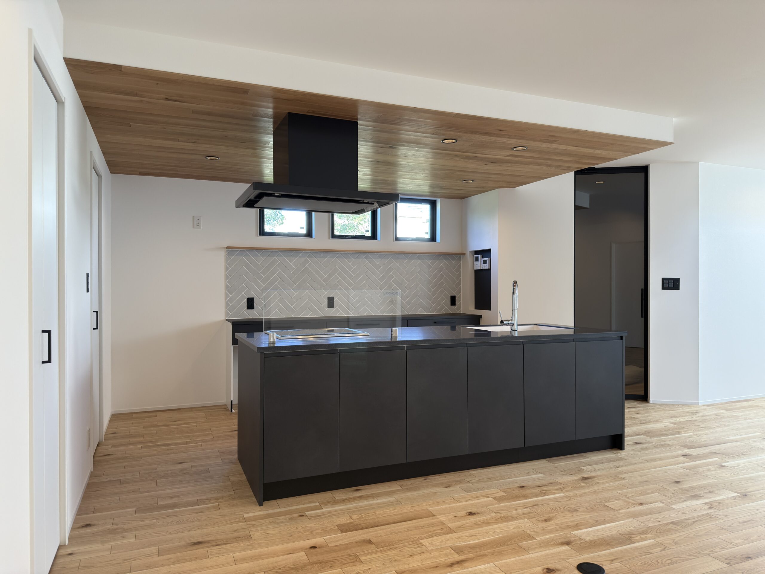 T様邸の1階部分はLDK、洗面、ランドリー、WICがすべて1階にまとまっており、「洗う→干す→しまう」が一直線で完結する家事ラク動線を実現。まるで平屋のように、1階だけで生活が完結できる動線が魅力です。さらに、ゆとりあるLDK(27.7帖)+回遊性のあるアイランドキッチンは家族とのつながりを意識したLDK中心の暮らしを実現しました。
