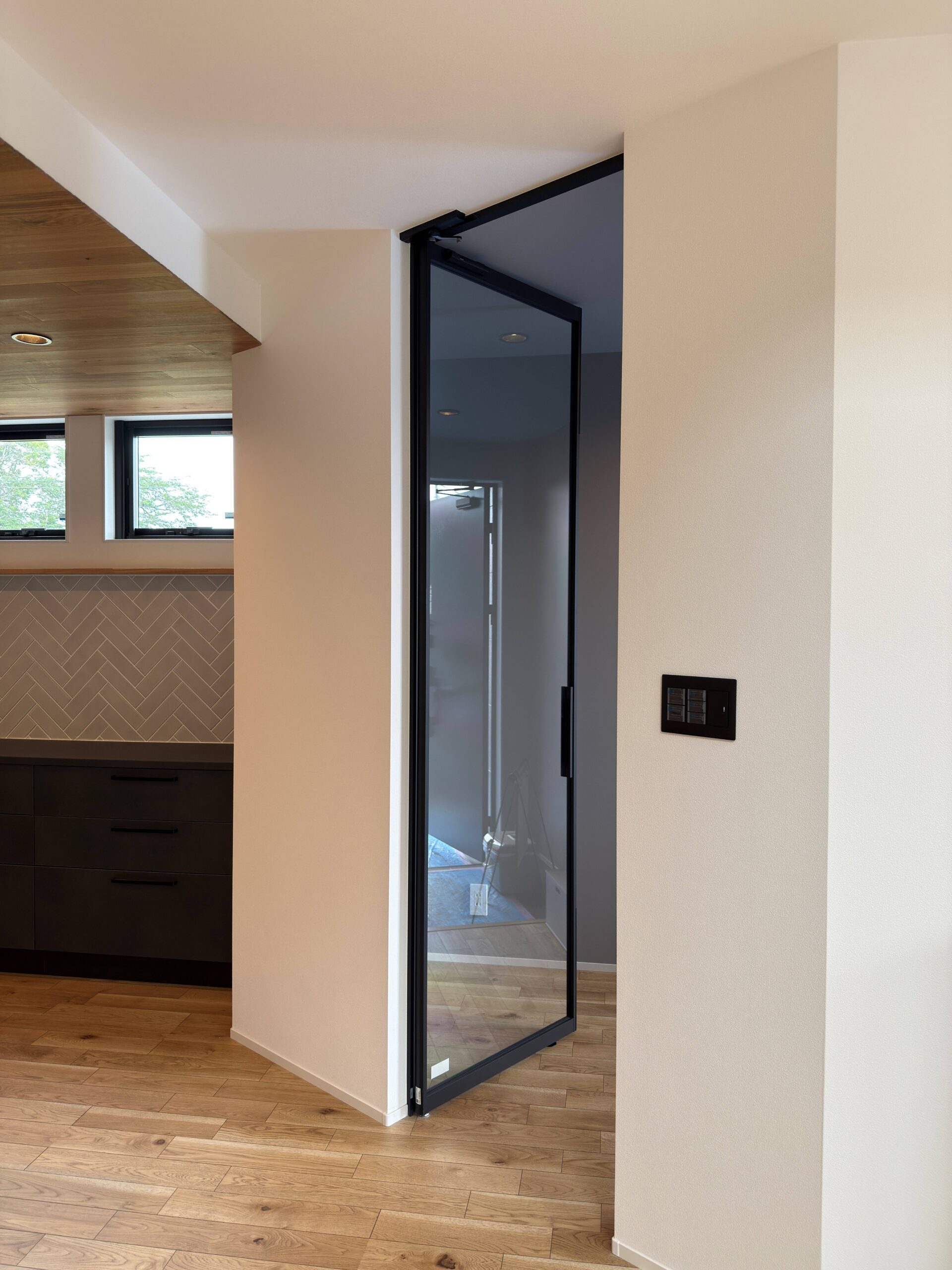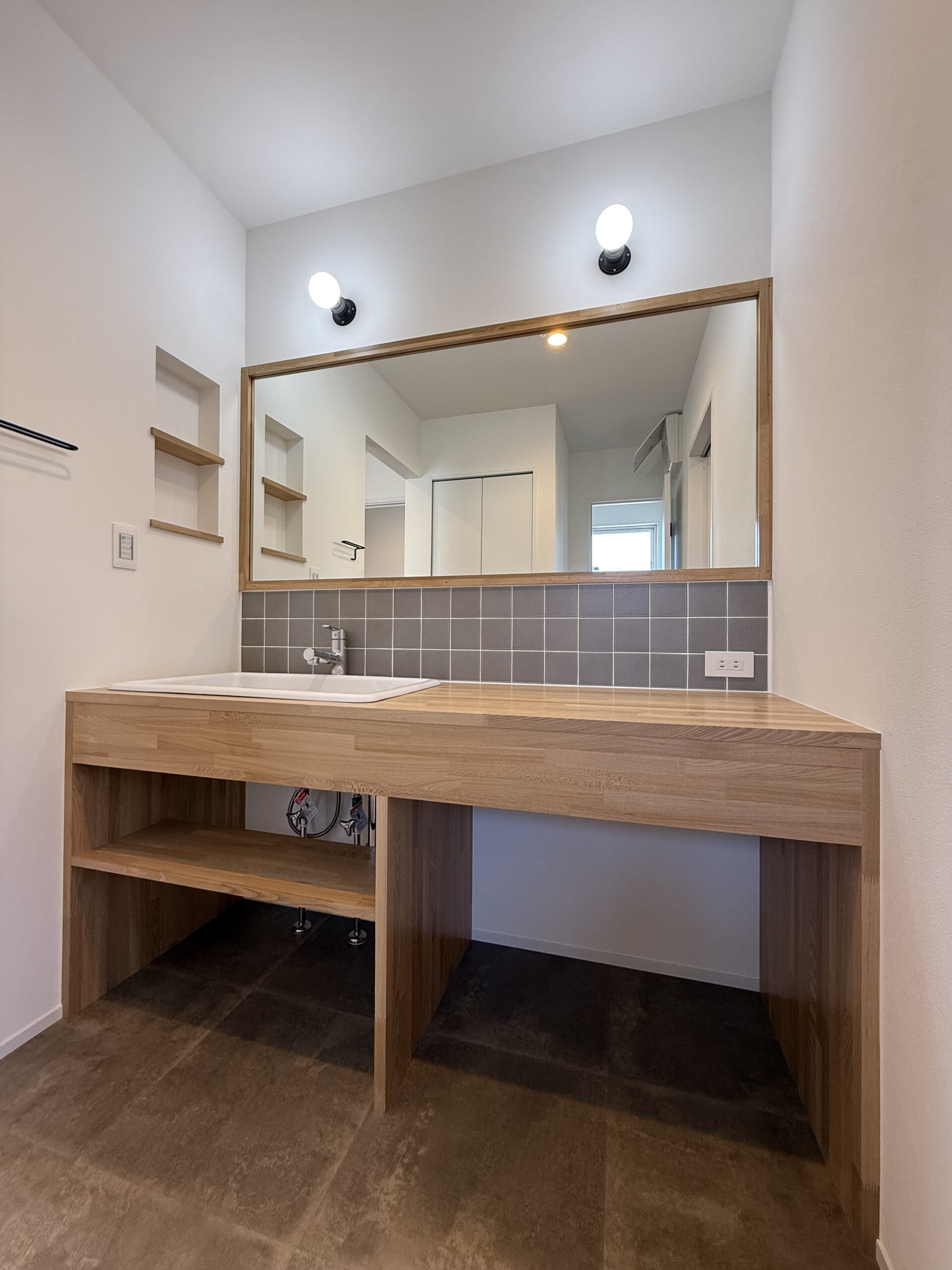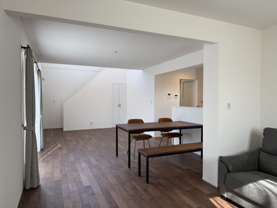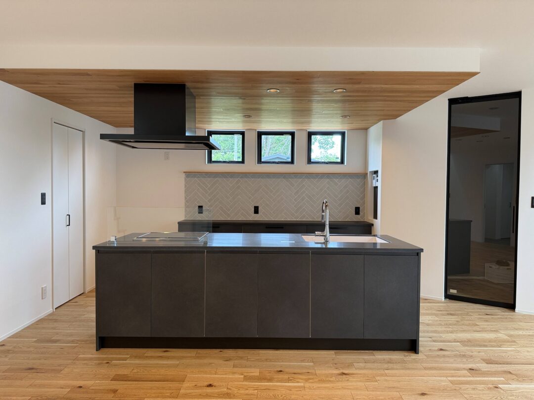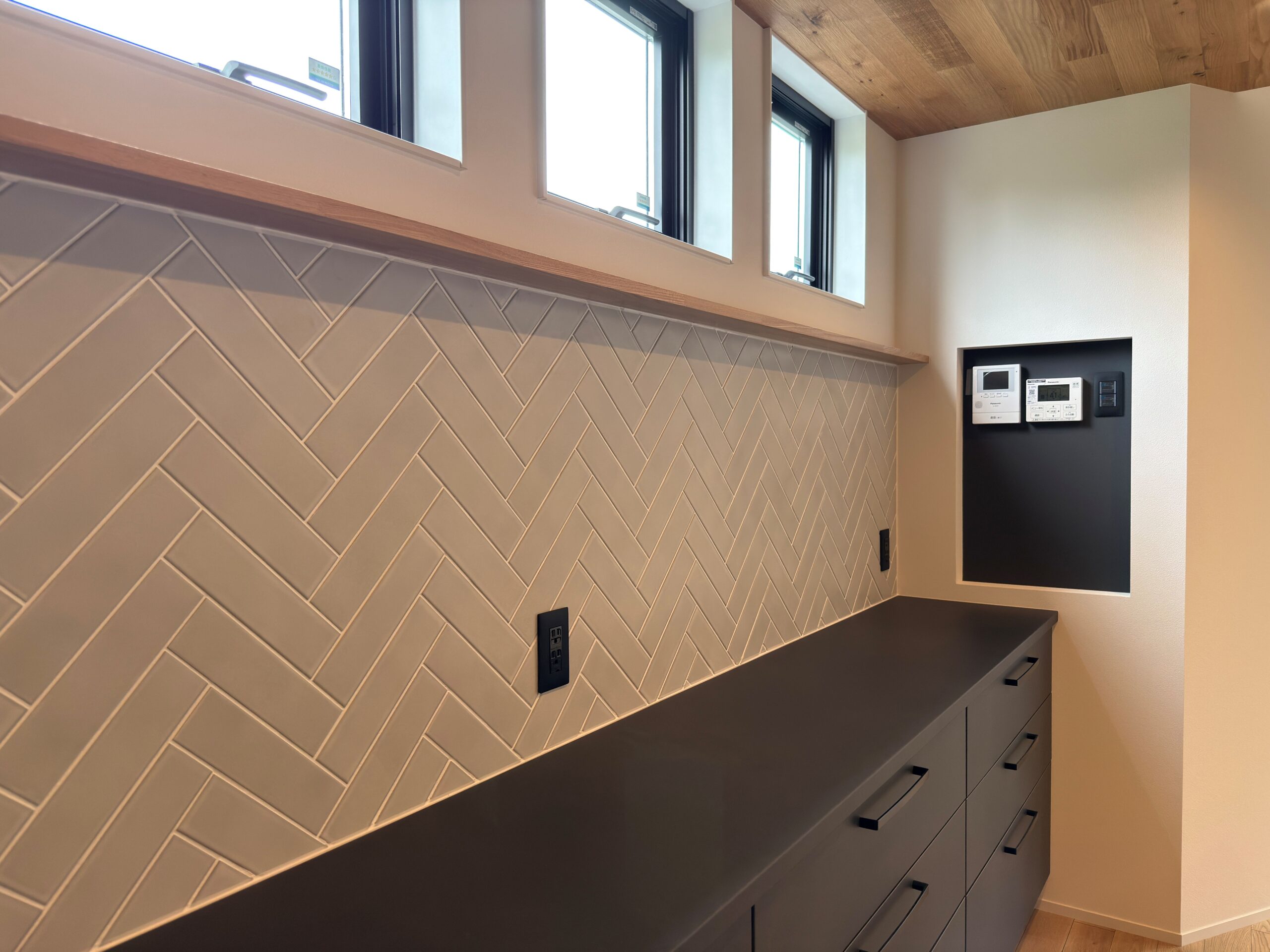 T様邸の1階部分はLDK、洗面、ランドリー、WICがすべて1階にまとまっており、「洗う→干す→しまう」が一直線で完結する家事ラク動線を実現。まるで平屋のように、1階だけで生活が完結できる動線が魅力です。さらに、ゆとりあるLDK(27.7帖)+回遊性のあるアイランドキッチンは家族とのつながりを意識したLDK中心の暮らしを実現しました。