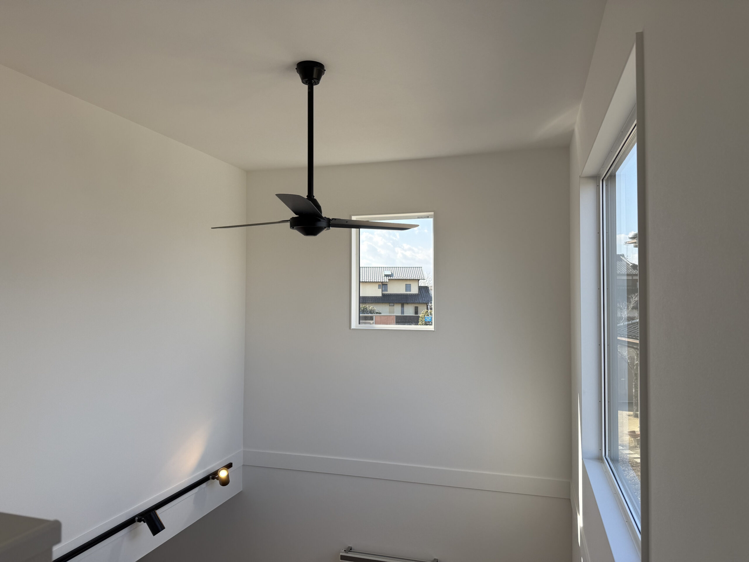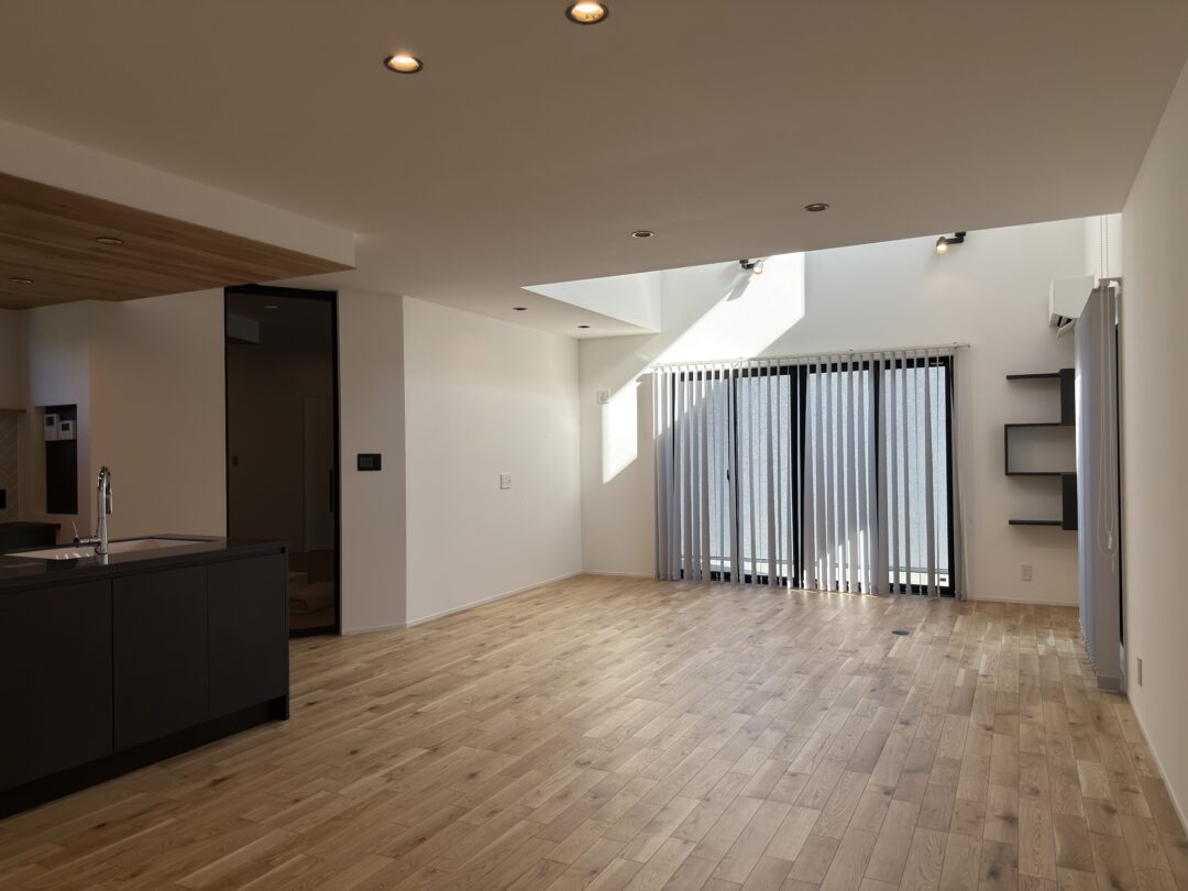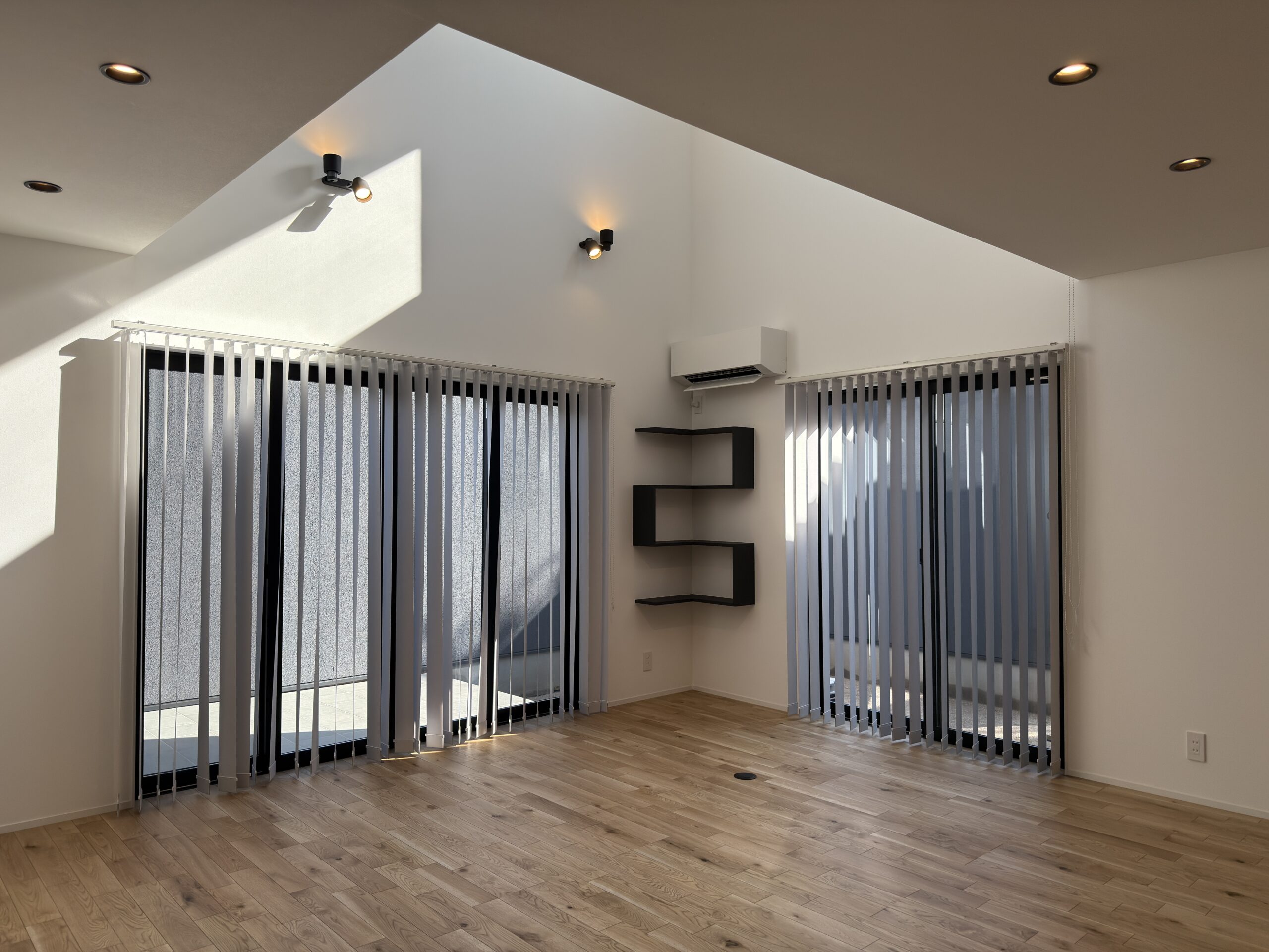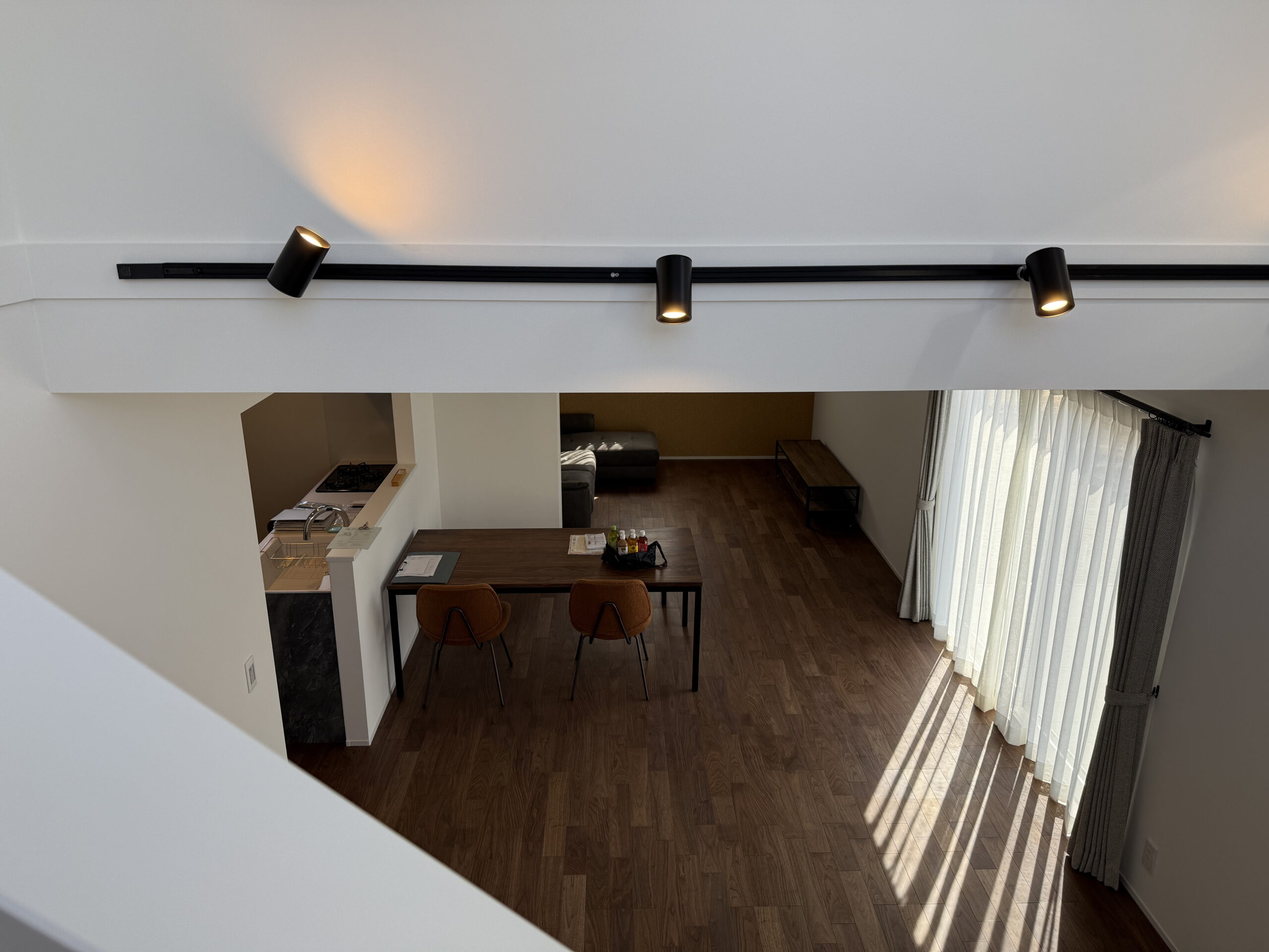 天井まで届く大きな吹き抜けと高窓から、やわらかな自然光がたっぷり入る心地よいリビング空間。日中は照明いらずの明るさで、時間帯によって変化する光と影の表情も楽しめます。空間に広がりを感じさせる縦の開放感と、無垢調の床材がもたらすぬくもりが心地よく調和しています。また、視線の抜けを活かしながらも、外塀でしっかりとプライバシーを確保。周囲の目を気にせず、思いきりリラックスできる空間です。