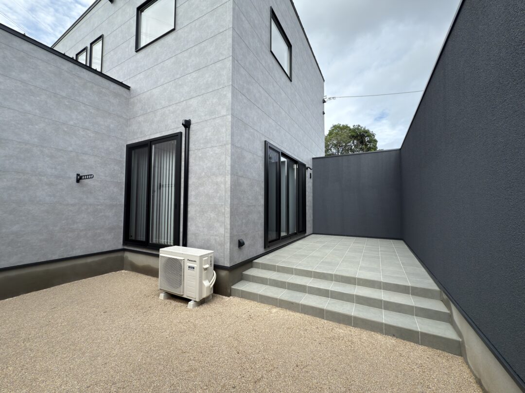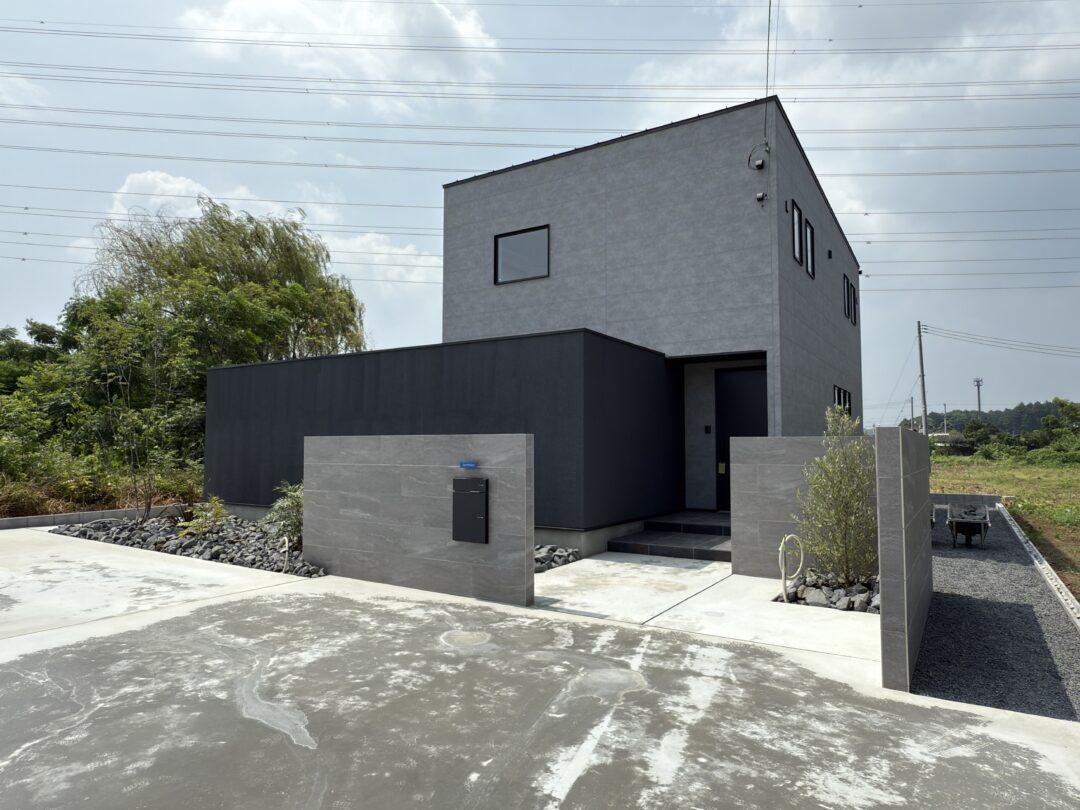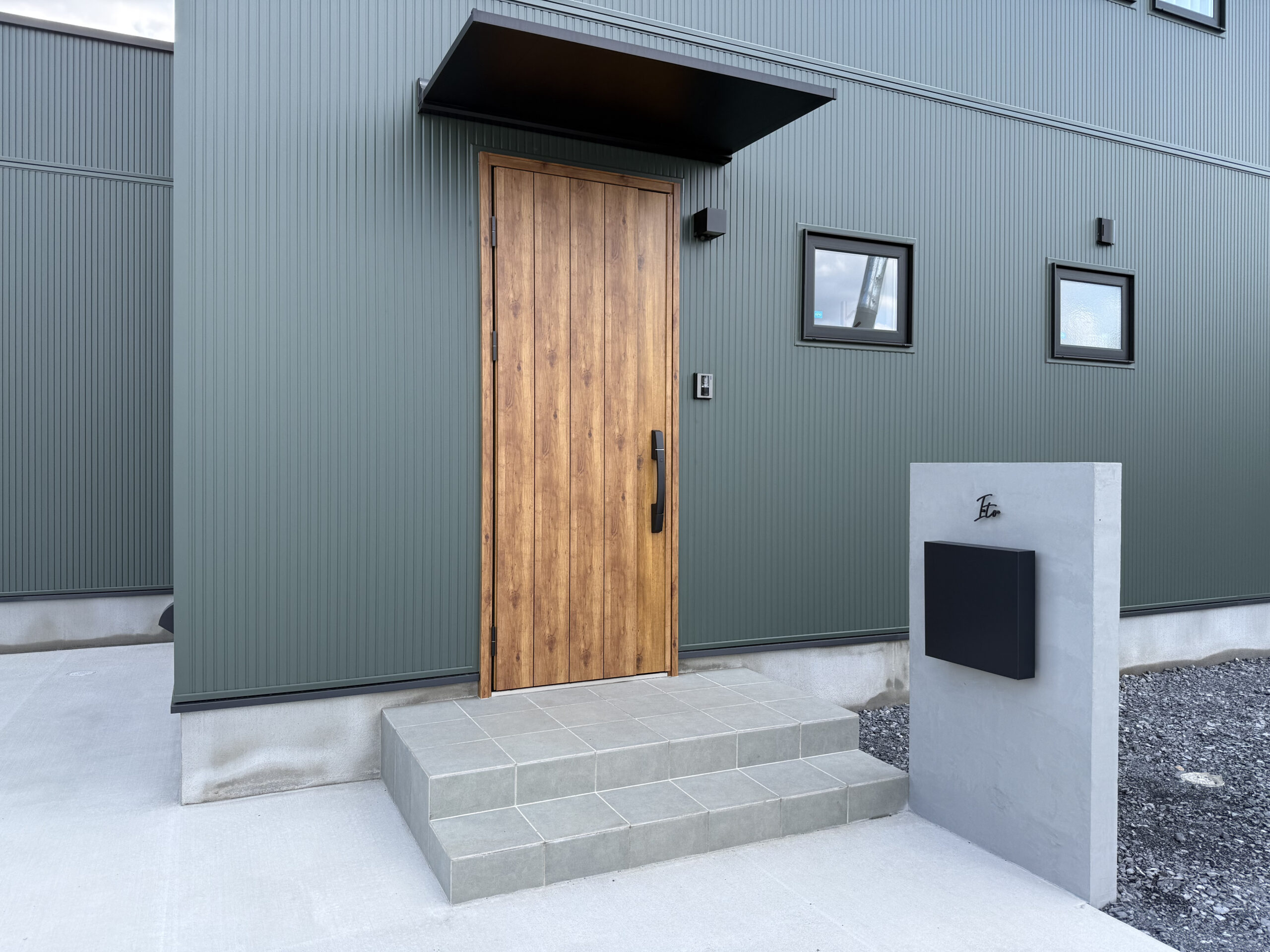 外壁はKMEW 「FLAT DESIGN PANEL」。モルタル柄に細かなドットが浮かび上がります。