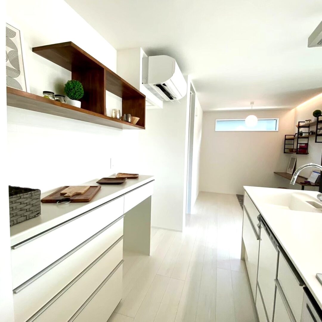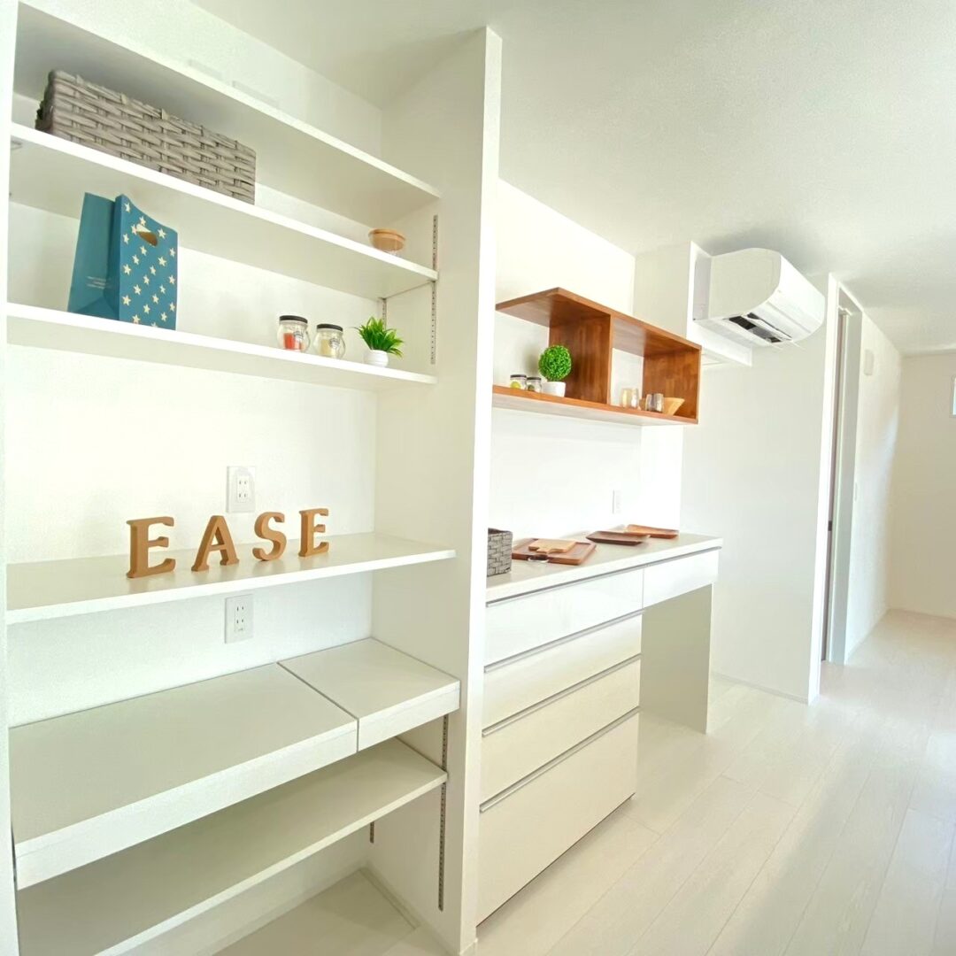 白を基調に木目の飾り棚が良いアクセントになってます。