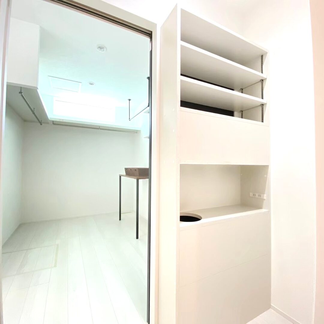 脱衣所とランドリールームが造作棚で繋がっているので、洗い物を運ぶ手間もなし!