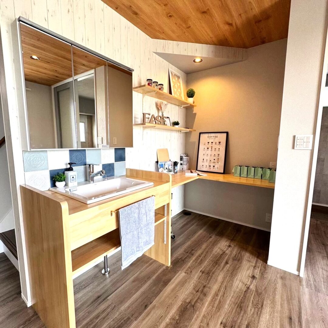 お客様こだわりの造作洗面はブルー系のタイルを使って海辺をイメージ
