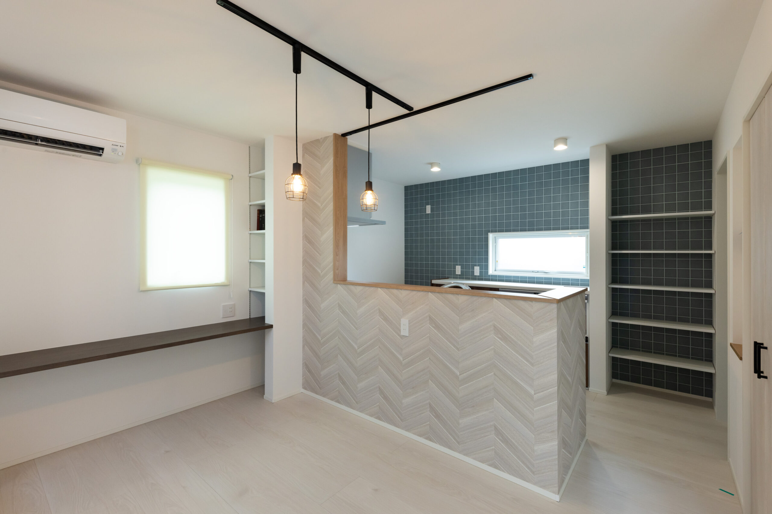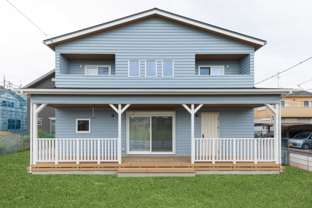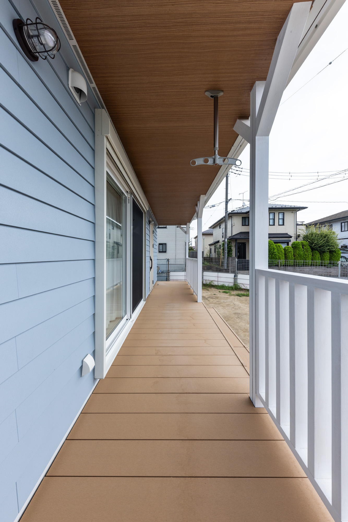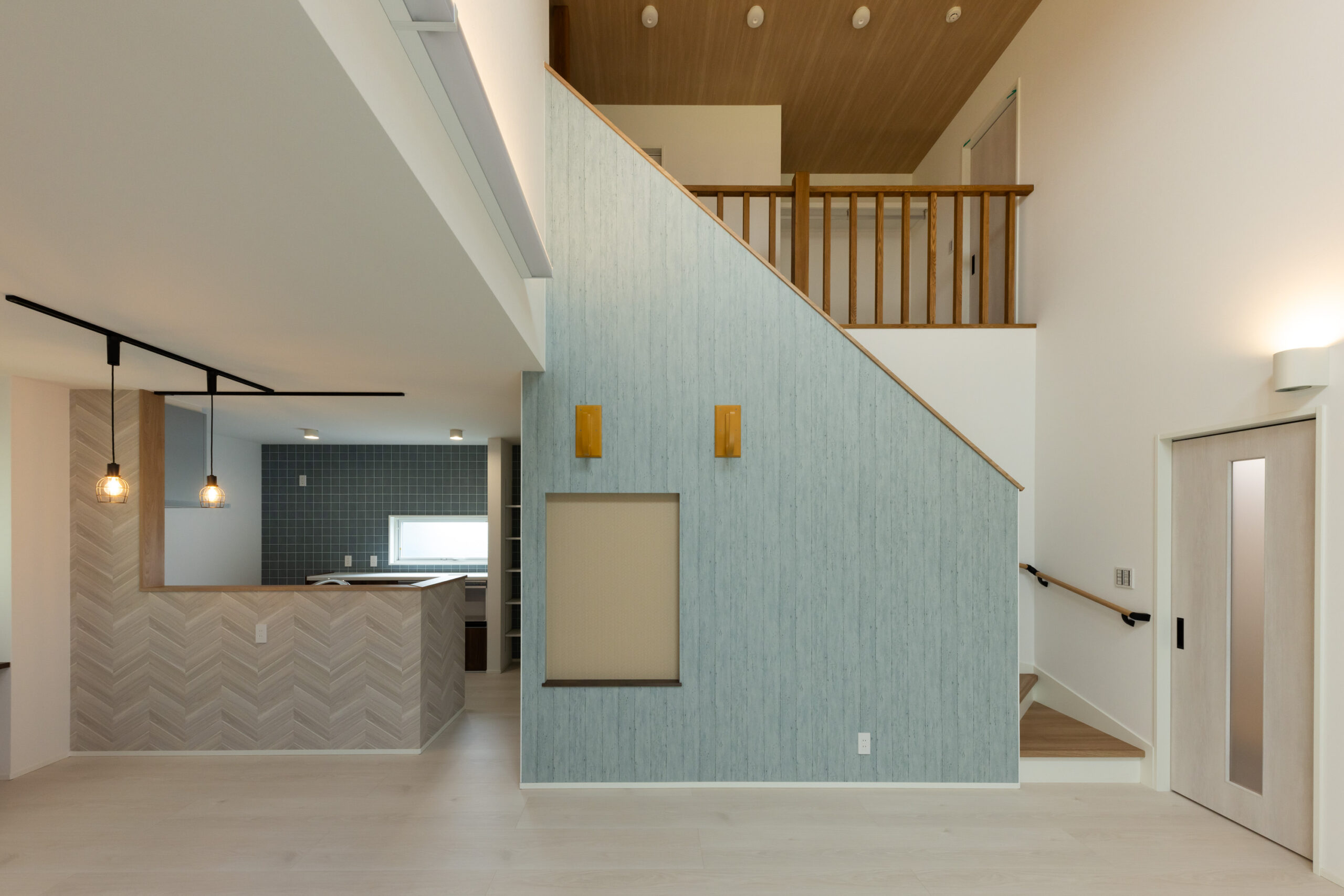 サーファーズスタイルのカバードポーチを設けた印象的な外観は、爽やかなライトブルーと陰影のある立体感が映えるラップサイディングを採用。明るい光が差し込む吹き抜けのLDKは全体に開放感を与え、2階部分には木製の手すりを使用することで、常に家族の気配が感じられる、安心感と心地よさを大切にした空間となりました。キッチンからパントリー、ランドリー、バスルームまでが一直線につながる動線設計で、日々の家事もスムーズに。収納力も抜群で、広々とした玄関収納やパントリーが毎日の暮らしを支えます。また南国リゾートを思わせるトイレのクロスや、玄関・脱衣所・トイレからもアクセスしやすい造作洗面台など、細やかな工夫も詰め込みました。趣味も家族時間も大切にできる、そんな理想の住まいです。