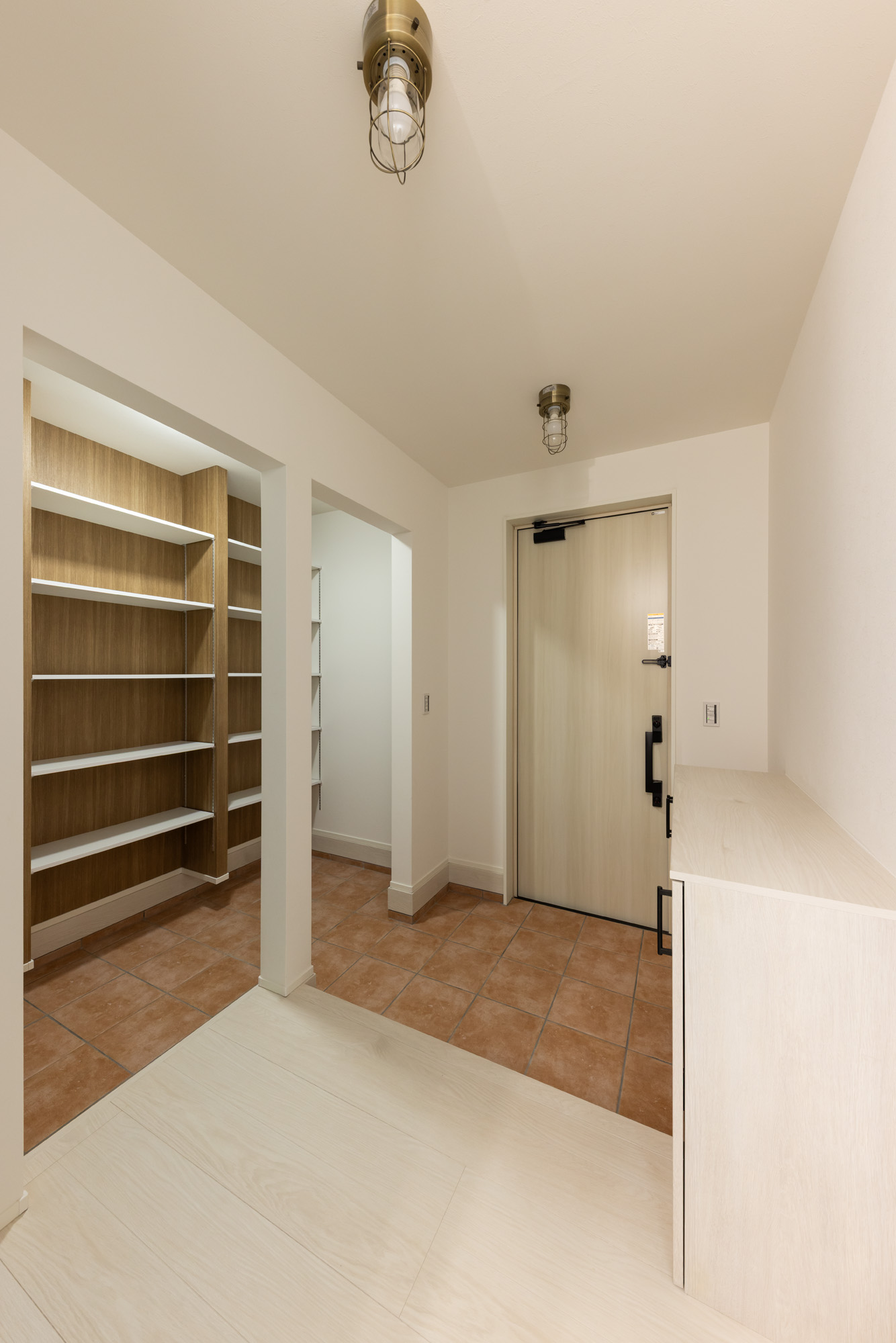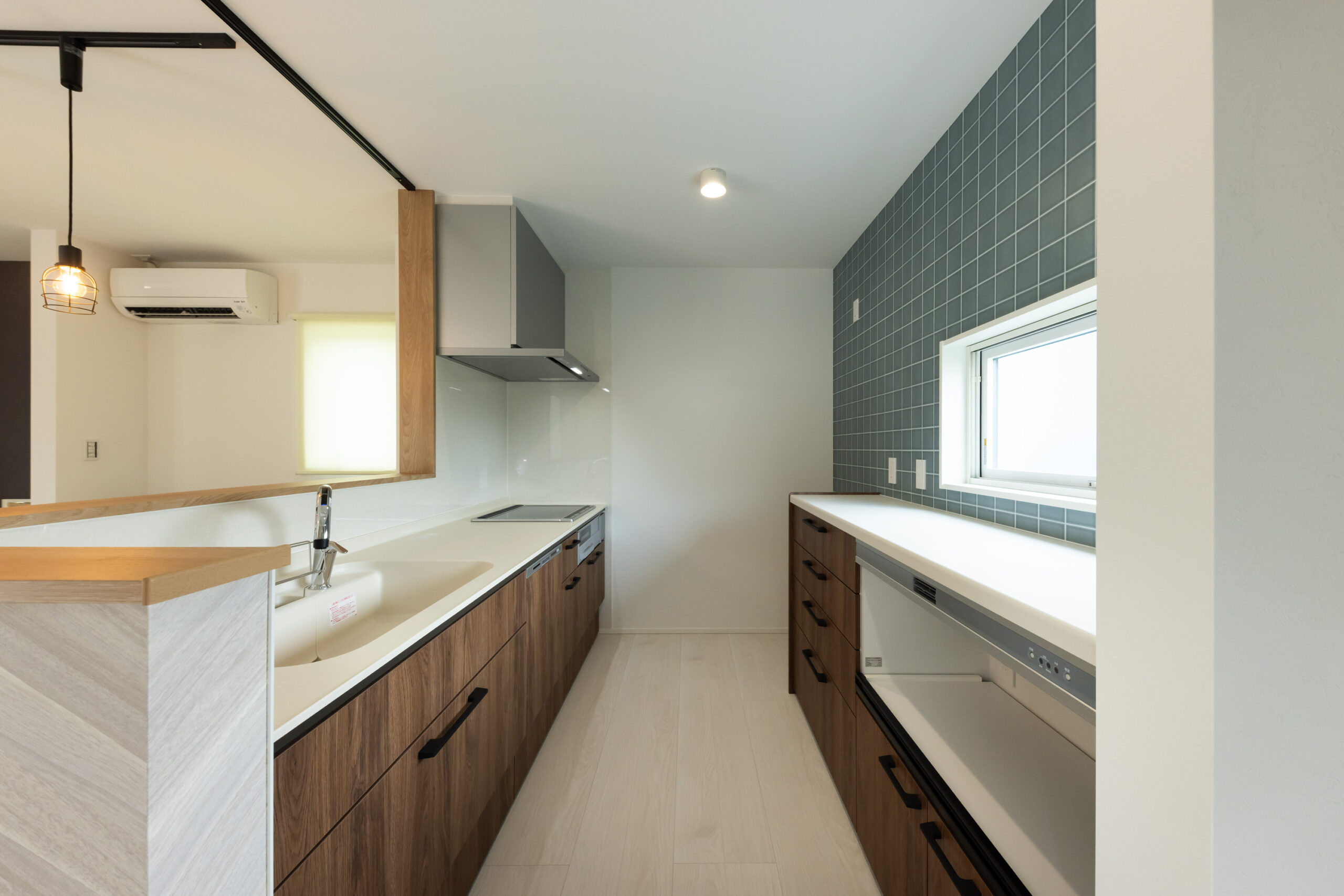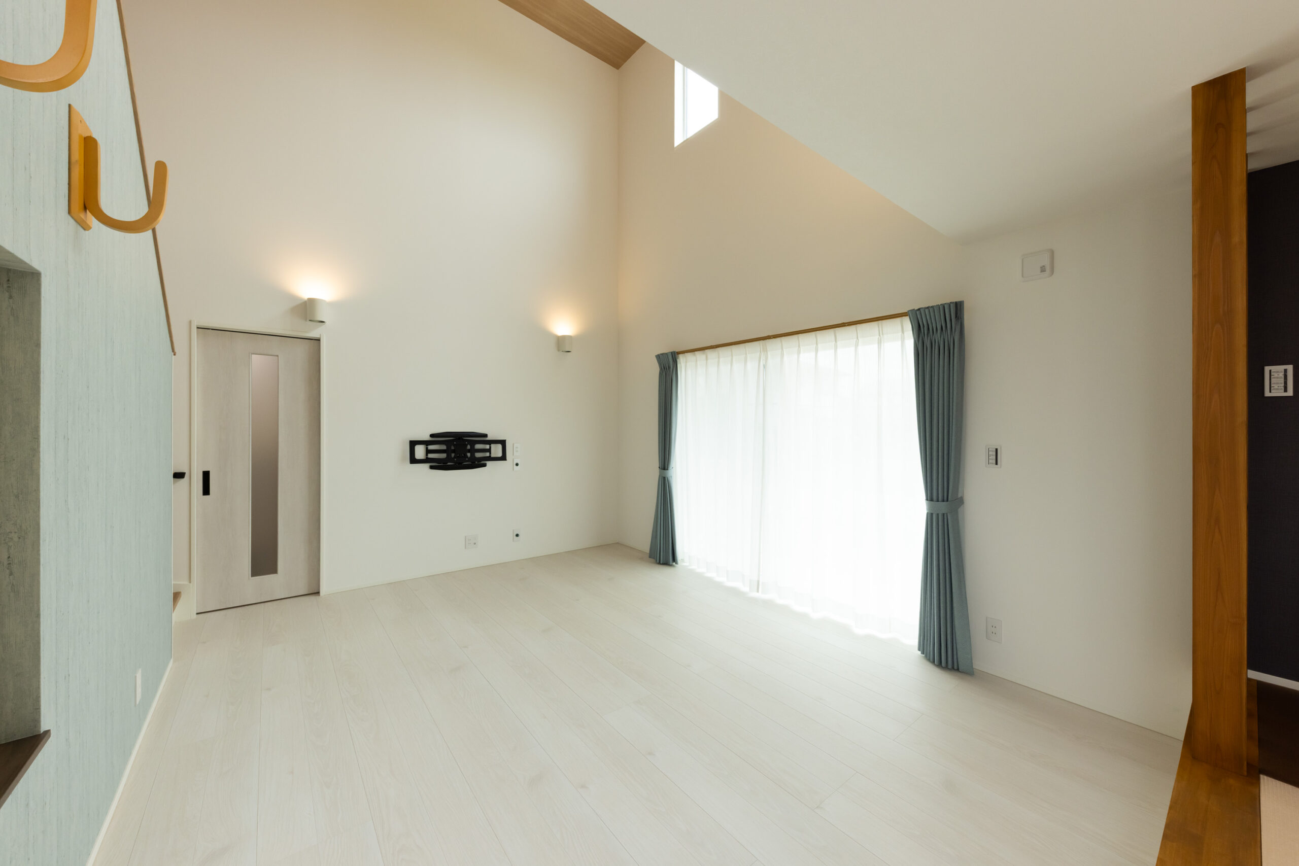 サーファーズスタイルのカバードポーチを設けた印象的な外観は、爽やかなライトブルーと陰影のある立体感が映えるラップサイディングを採用。明るい光が差し込む吹き抜けのLDKは全体に開放感を与え、2階部分には木製の手すりを使用することで、常に家族の気配が感じられる、安心感と心地よさを大切にした空間となりました。キッチンからパントリー、ランドリー、バスルームまでが一直線につながる動線設計で、日々の家事もスムーズに。収納力も抜群で、広々とした玄関収納やパントリーが毎日の暮らしを支えます。また南国リゾートを思わせるトイレのクロスや、玄関・脱衣所・トイレからもアクセスしやすい造作洗面台など、細やかな工夫も詰め込みました。趣味も家族時間も大切にできる、そんな理想の住まいです。