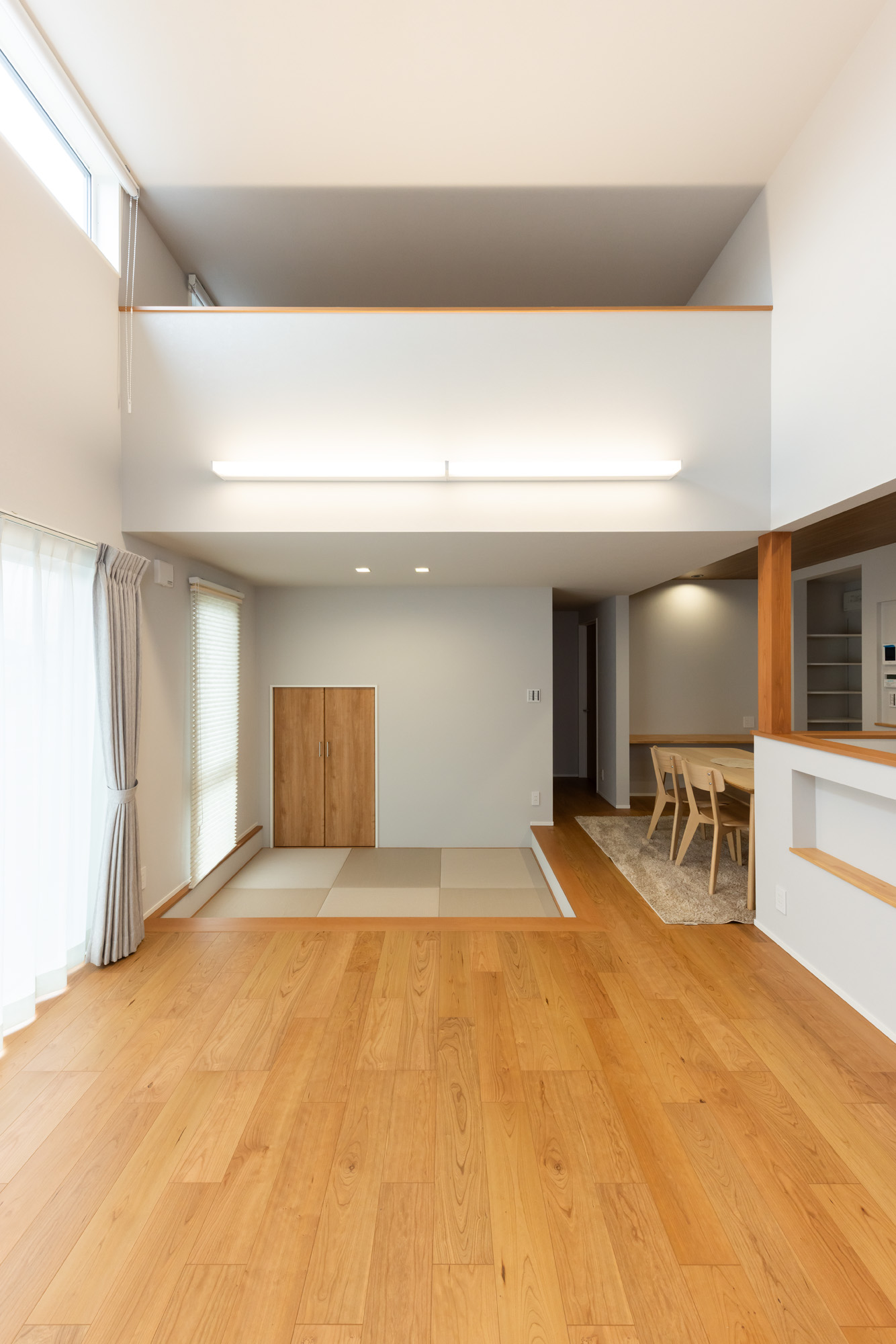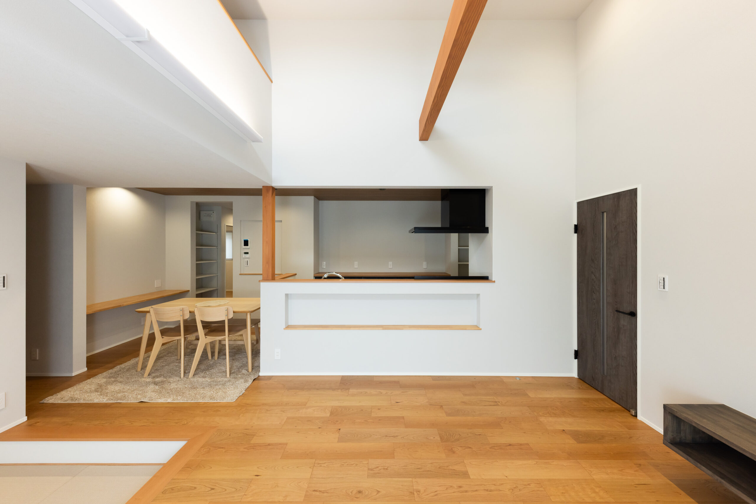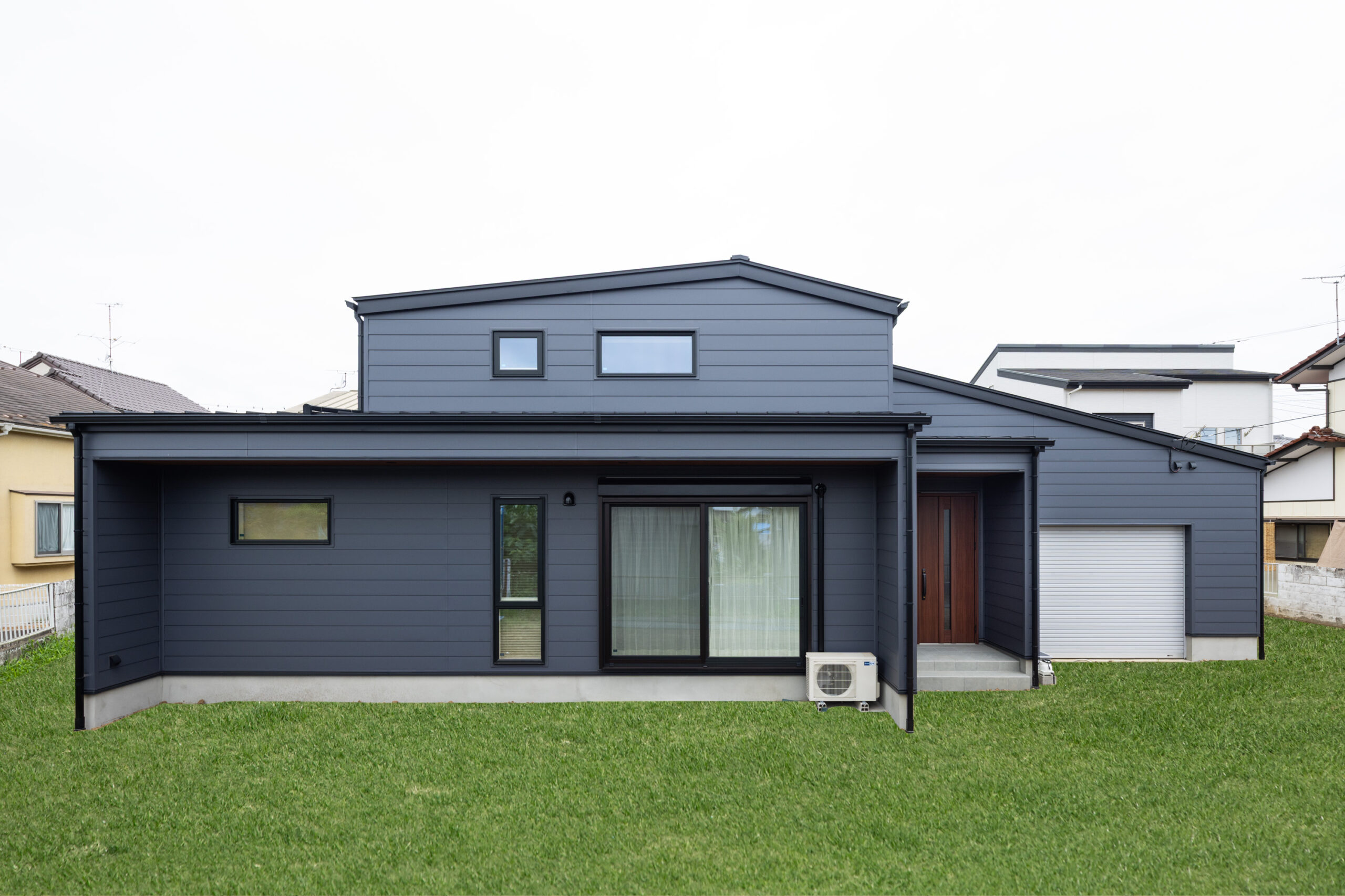 ダークグレーの外壁が落ち着きを演出するモダンな外観。シンプルながらも木のあたたかさを感じることができる室内の中心には、ペニンシュラ型のキッチンがあり、その正面にはスキップフロアの畳スペースを配置。家事をしながら子供の遊ぶ様子を見守れる空間を演出しました。また、リビングは明るく開放的な吹き抜け天井となっており、さらに生活空間にゆとりと遊び心を加えるロフトスペースも魅力のひとつです。さらに愛車を守るインナーガレージは雨の日でも濡れずに室内へ移動できる利便性も追求しました。大容量玄関収納やファミリークローゼット、パントリーなど効率的な動線設計は、ご家族の安心と日々の暮らしを快適にサポートするお住まいです。
