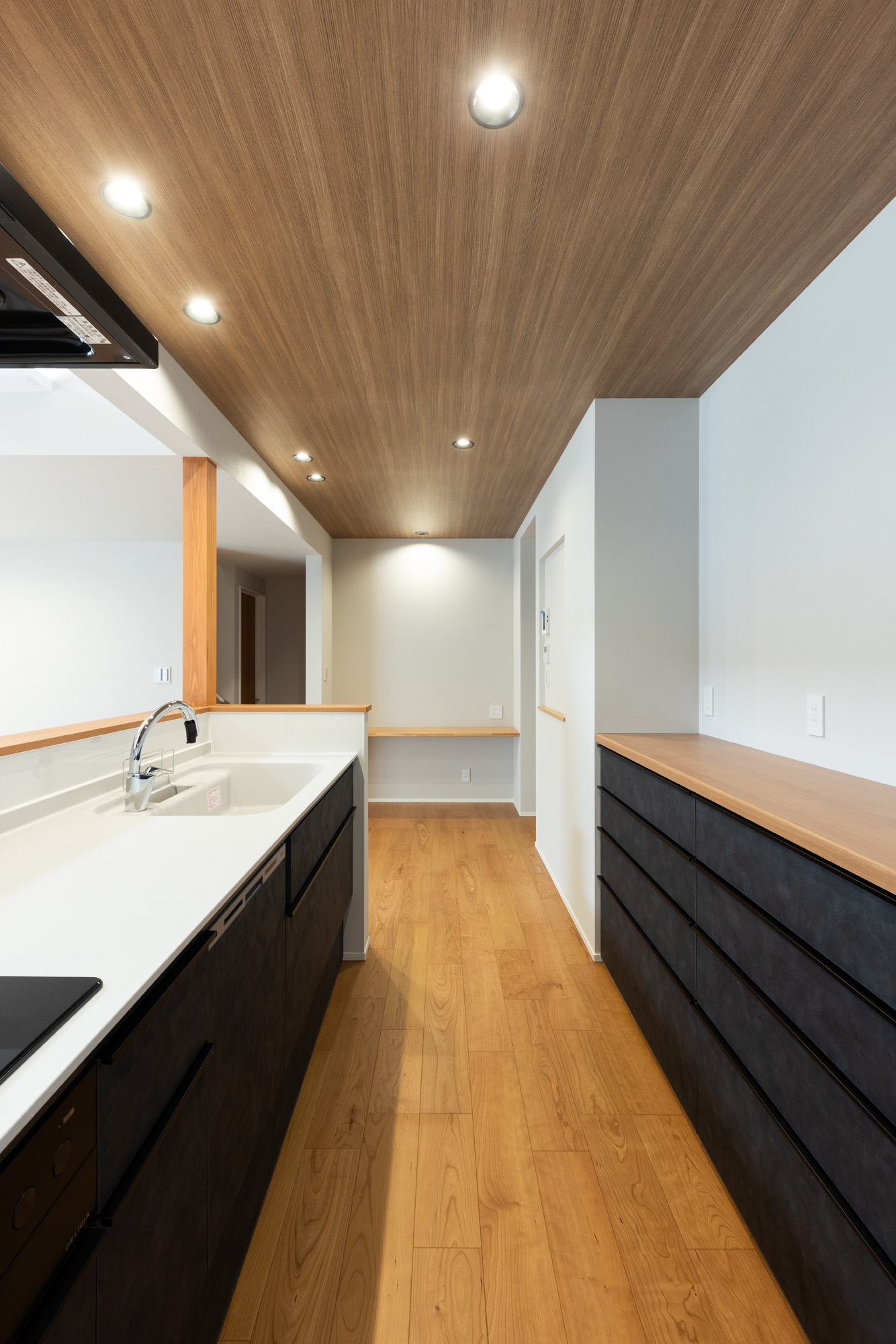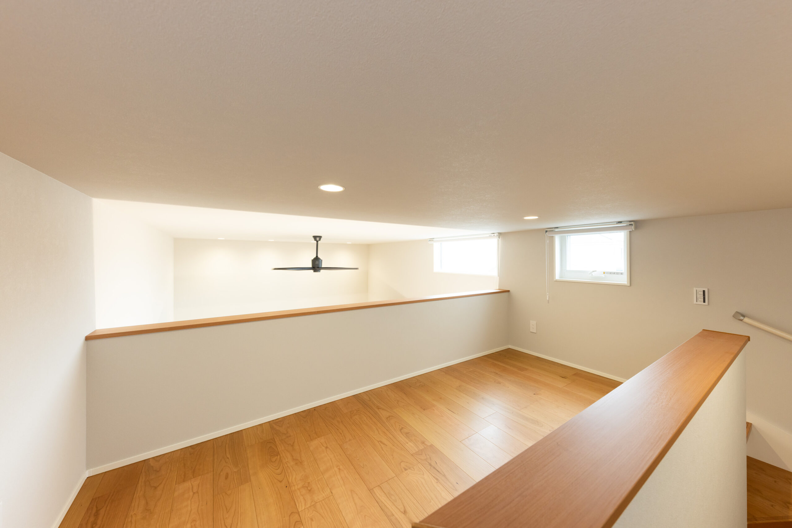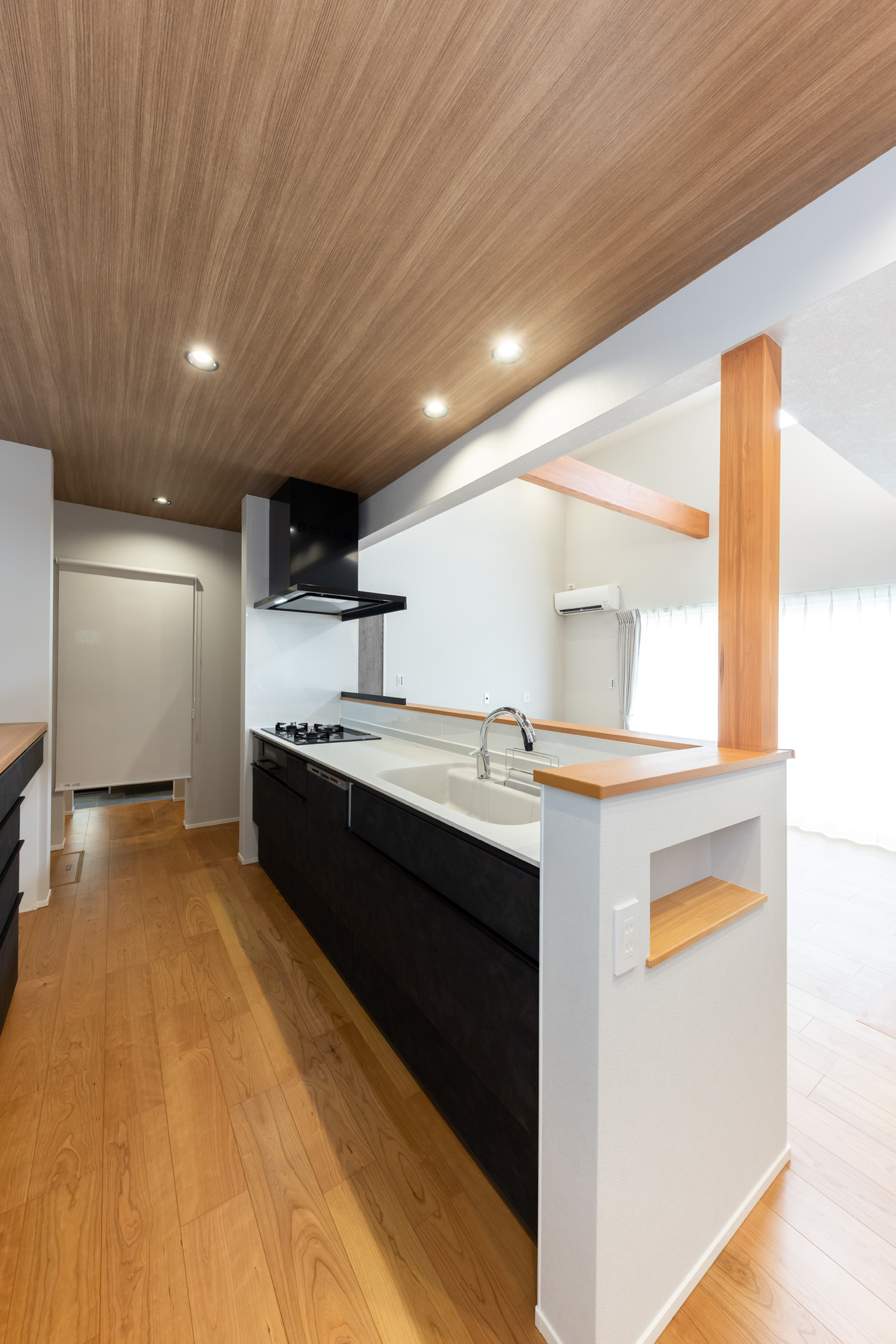 ダークグレーの外壁が落ち着きを演出するモダンな外観。シンプルながらも木のあたたかさを感じることができる室内の中心には、ペニンシュラ型のキッチンがあり、その正面にはスキップフロアの畳スペースを配置。家事をしながら子供の遊ぶ様子を見守れる空間を演出しました。また、リビングは明るく開放的な吹き抜け天井となっており、さらに生活空間にゆとりと遊び心を加えるロフトスペースも魅力のひとつです。さらに愛車を守るインナーガレージは雨の日でも濡れずに室内へ移動できる利便性も追求しました。大容量玄関収納やファミリークローゼット、パントリーなど効率的な動線設計は、ご家族の安心と日々の暮らしを快適にサポートするお住まいです。