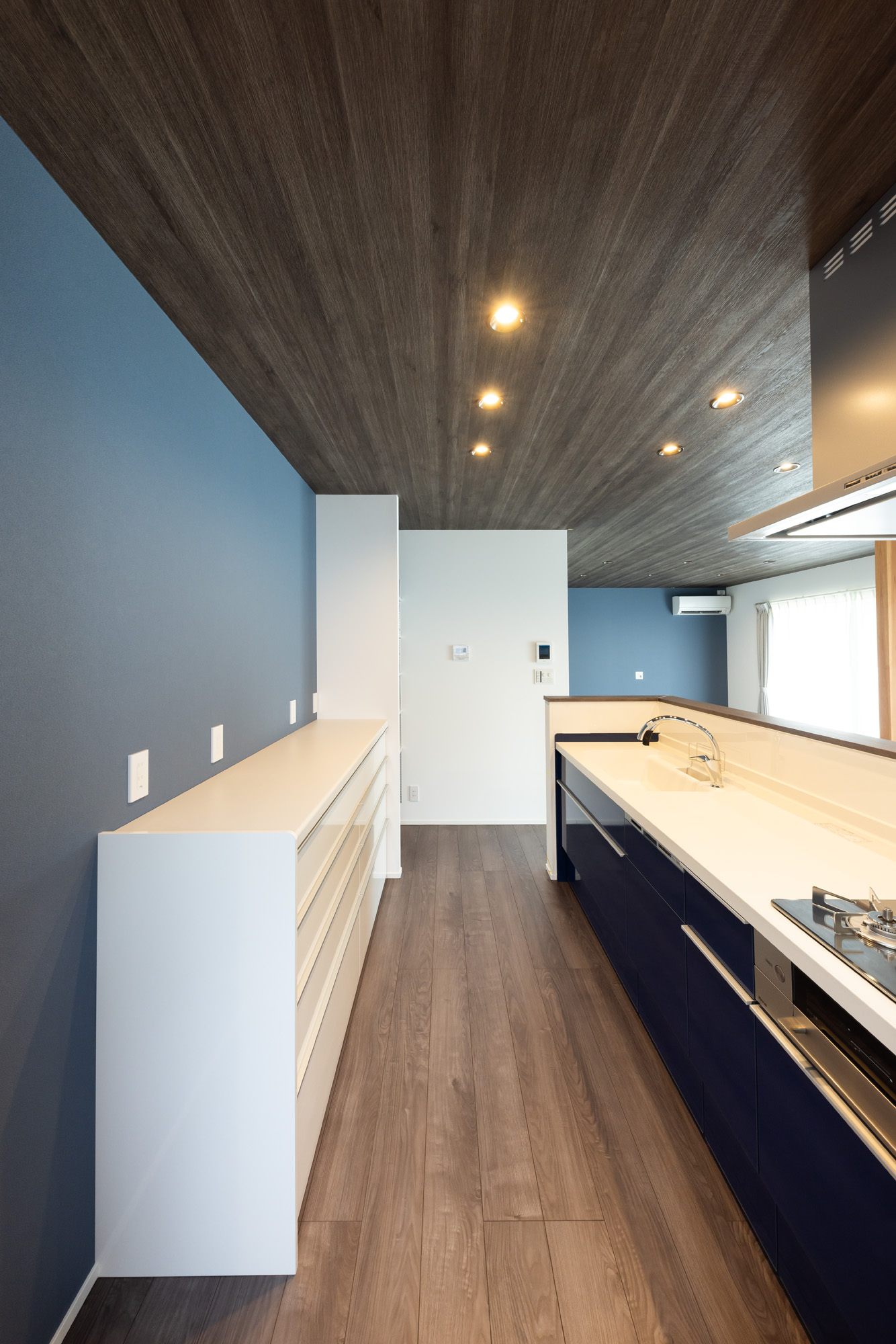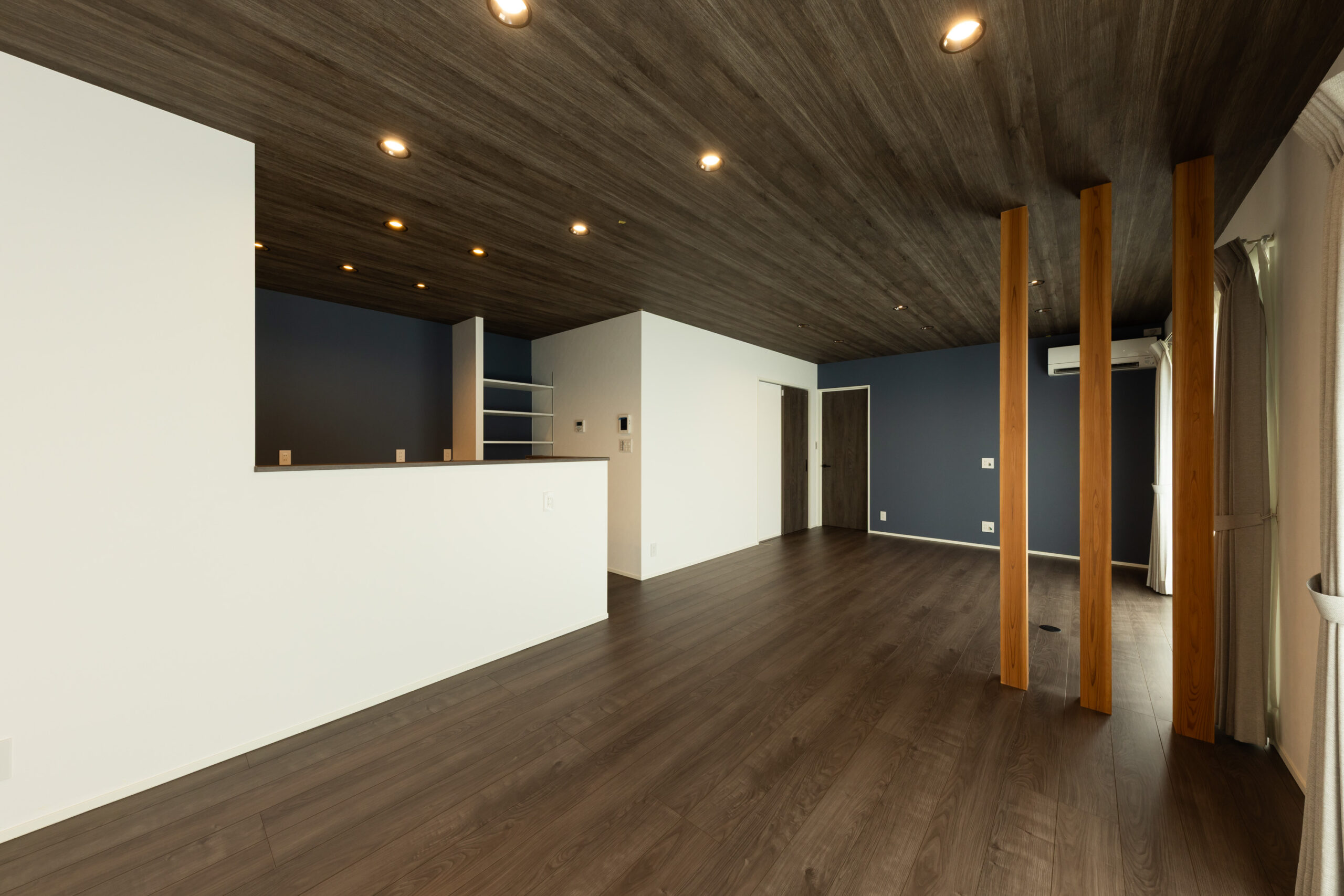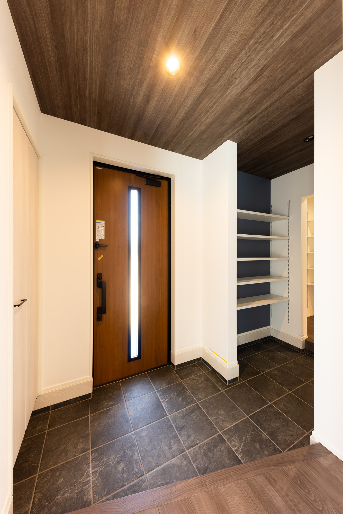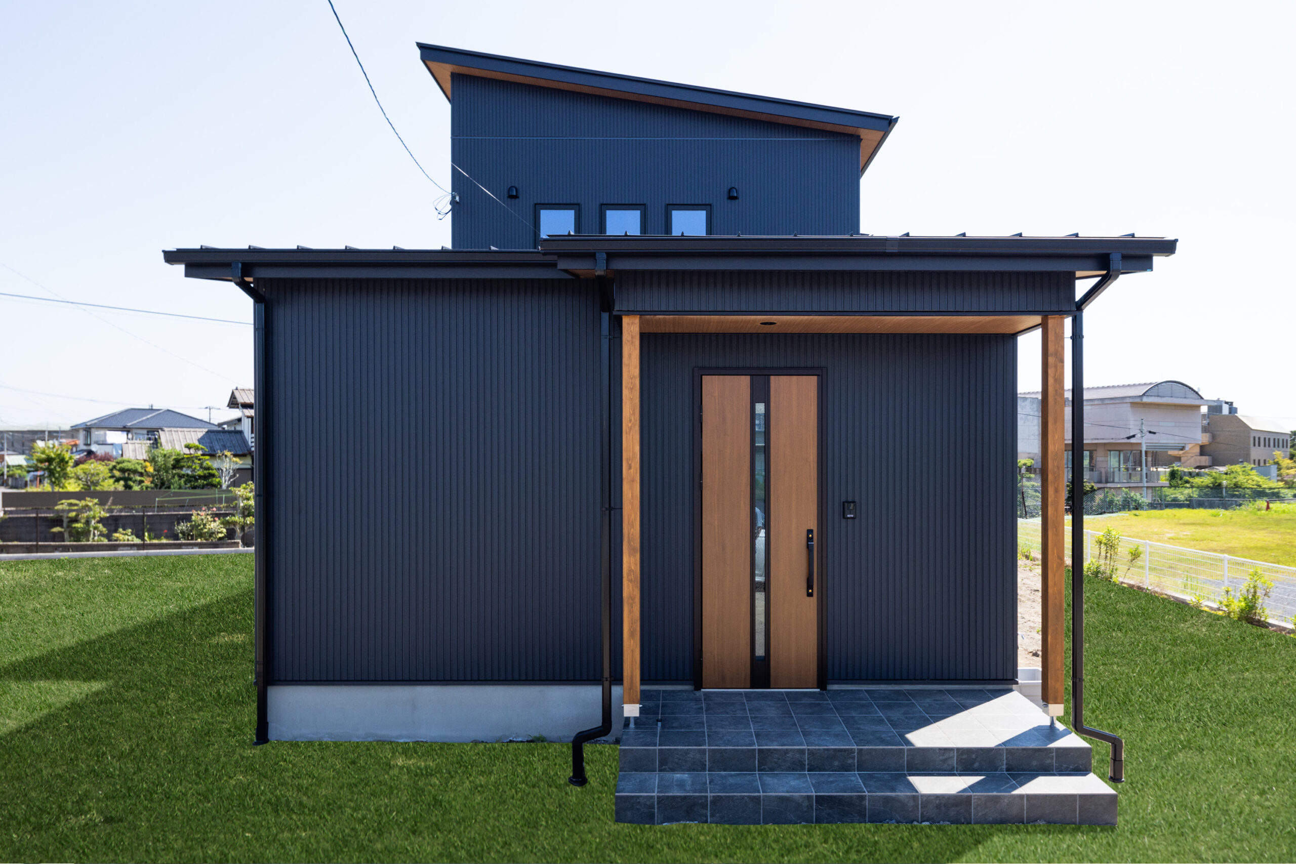 シックなネイビーの外観が印象的な住宅。木材で仕上げた玄関を開けると、木で統一されたあたたかみのある空間が広がります。明るく開放的なLDKの大きな引違戸からは、たっぷりの日差しが差し込みます。ペニンシュラ型のキッチンを採用することで、料理をしながら家族との会話を楽しめる工夫がなされています。リビングとは別に設けた書斎は、仕事や趣味に集中できるプライベート空間を演出しました。家の中に居ながら静かに作業ができ、暮らしの中に心地よいメリハリを生み出します。トイレやランドリールーム、子供部屋にアクセントクロスを取り入れ、暮らしに個性や遊び心をプラスしました。細部までこだわったデザインと機能が、家族の毎日をより豊かに彩ります。