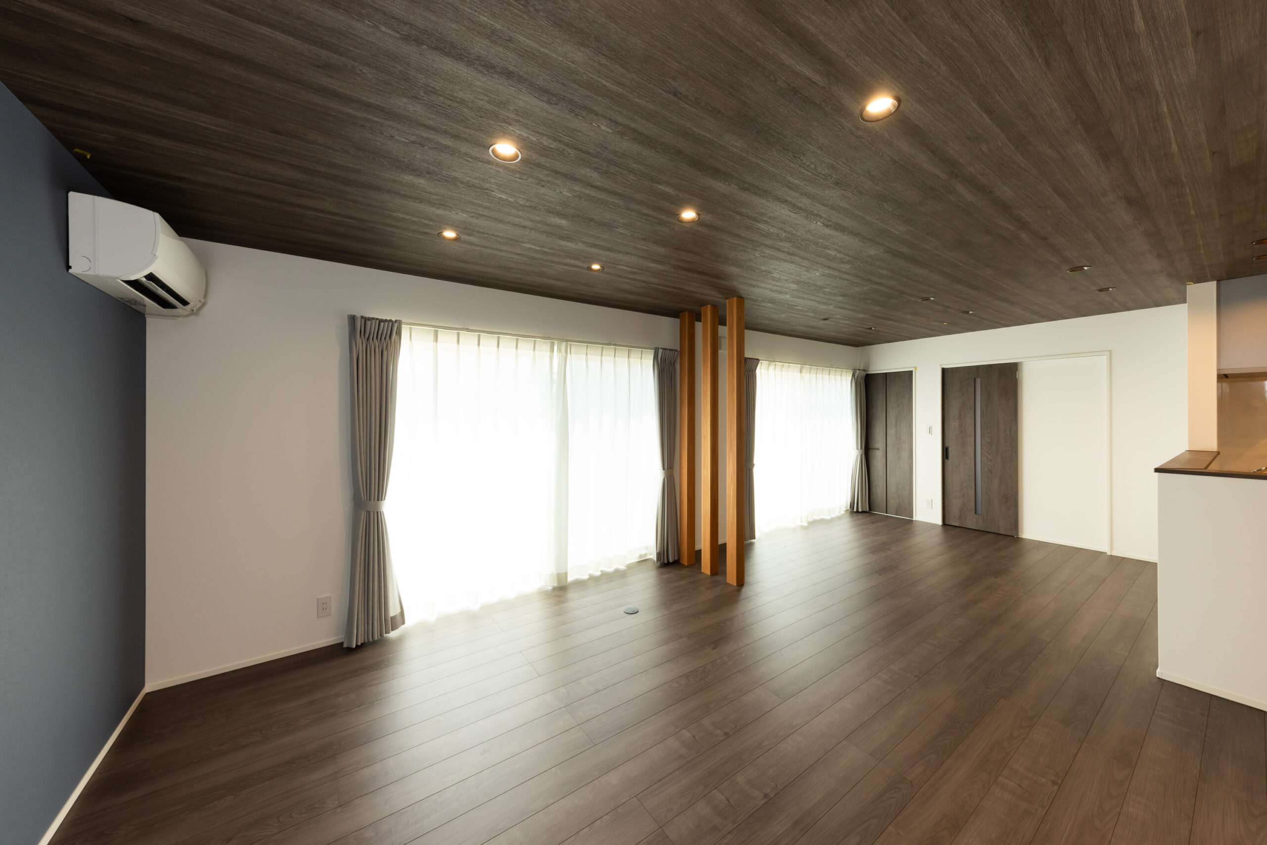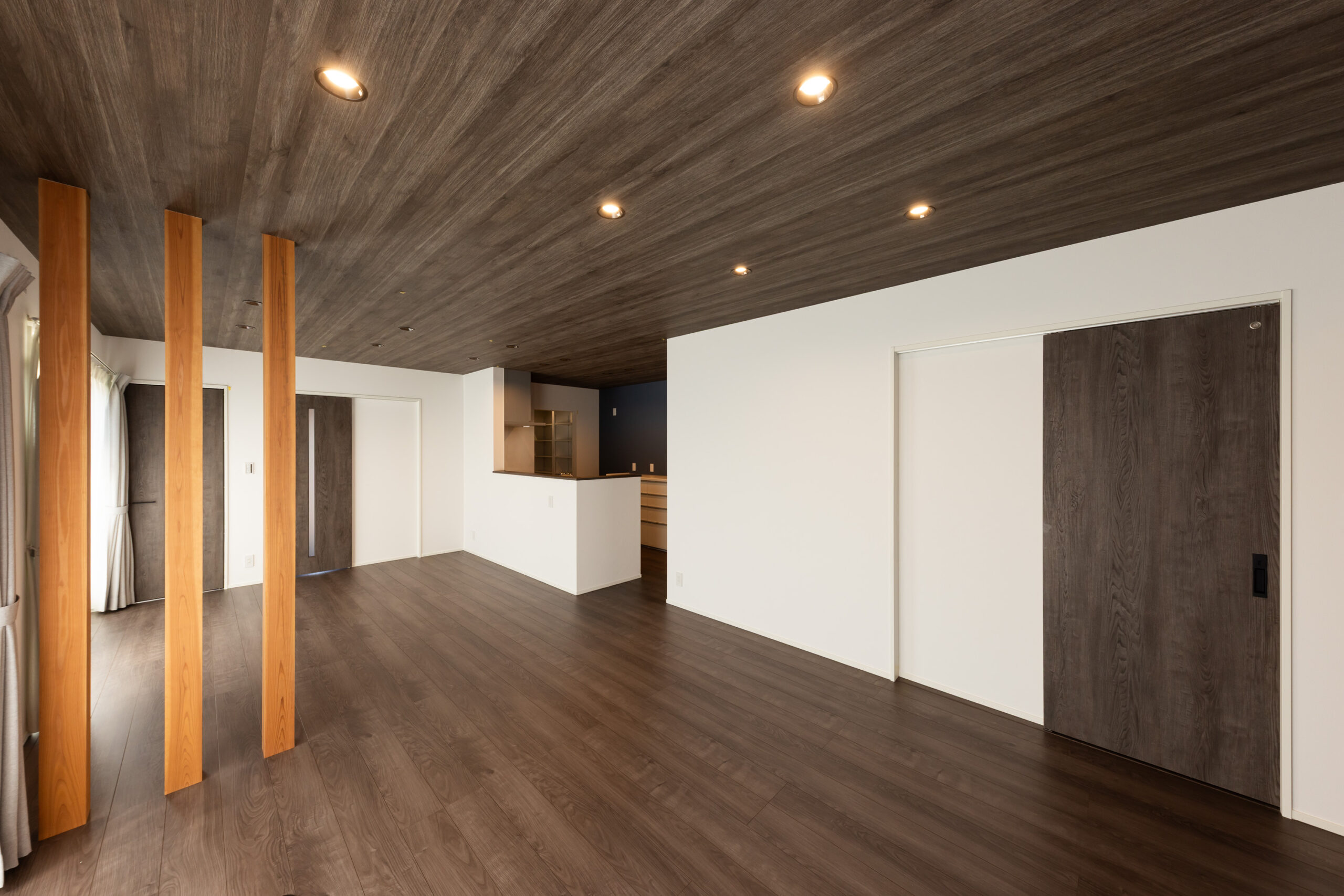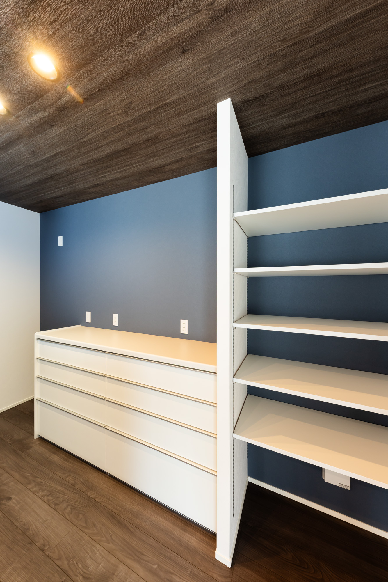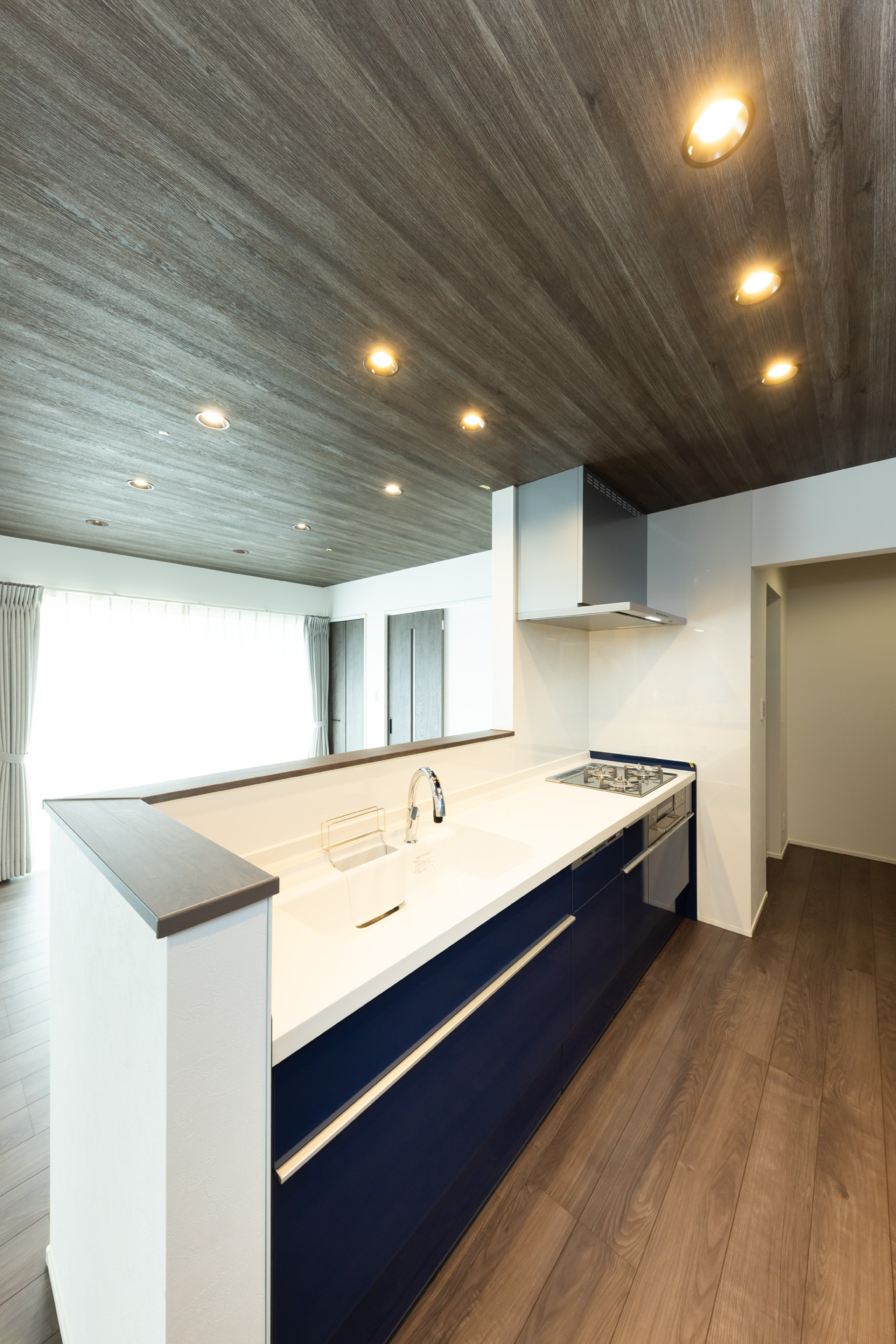 シックなネイビーの外観が印象的な住宅。木材で仕上げた玄関を開けると、木で統一されたあたたかみのある空間が広がります。明るく開放的なLDKの大きな引違戸からは、たっぷりの日差しが差し込みます。ペニンシュラ型のキッチンを採用することで、料理をしながら家族との会話を楽しめる工夫がなされています。リビングとは別に設けた書斎は、仕事や趣味に集中できるプライベート空間を演出しました。家の中に居ながら静かに作業ができ、暮らしの中に心地よいメリハリを生み出します。トイレやランドリールーム、子供部屋にアクセントクロスを取り入れ、暮らしに個性や遊び心をプラスしました。細部までこだわったデザインと機能が、家族の毎日をより豊かに彩ります。