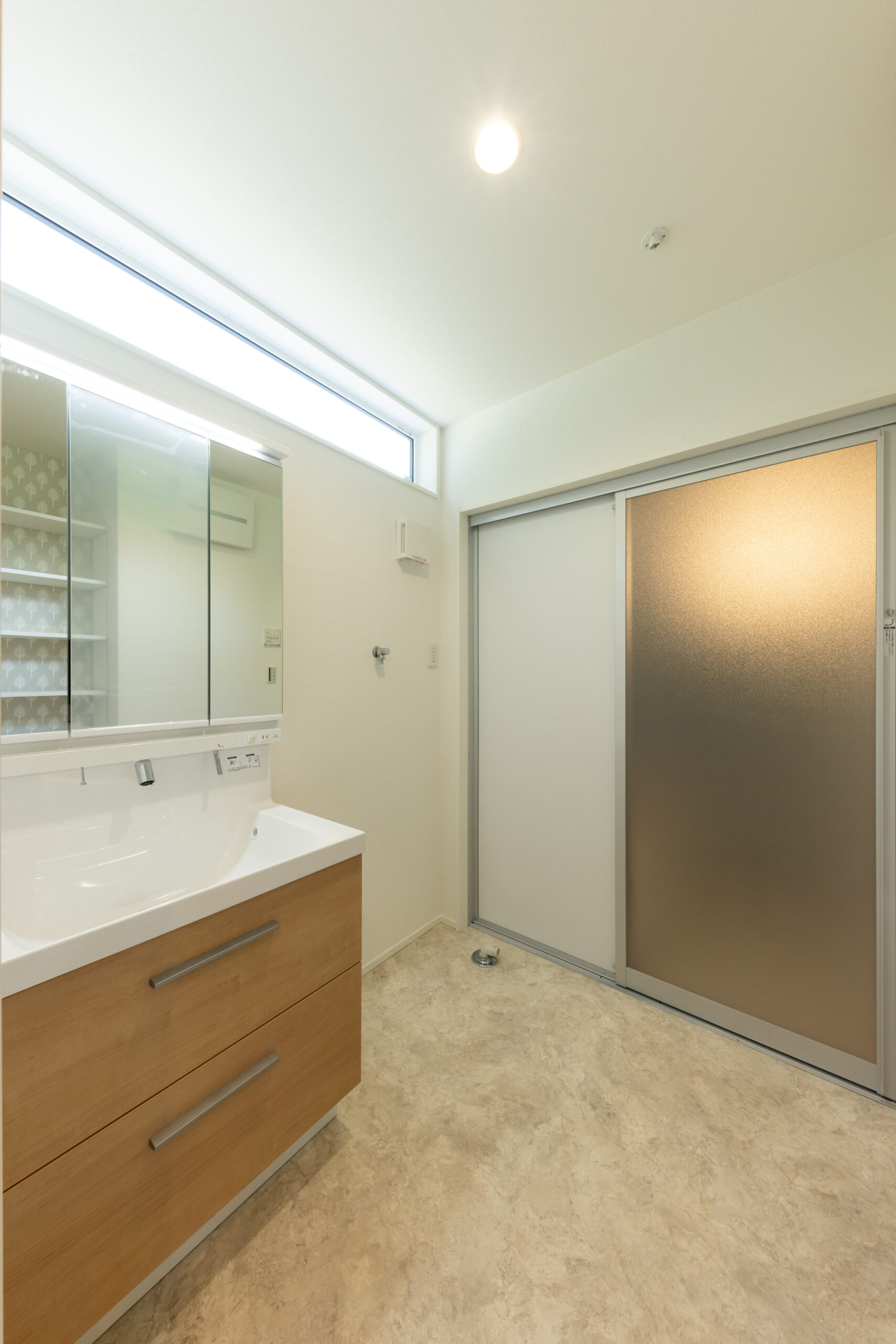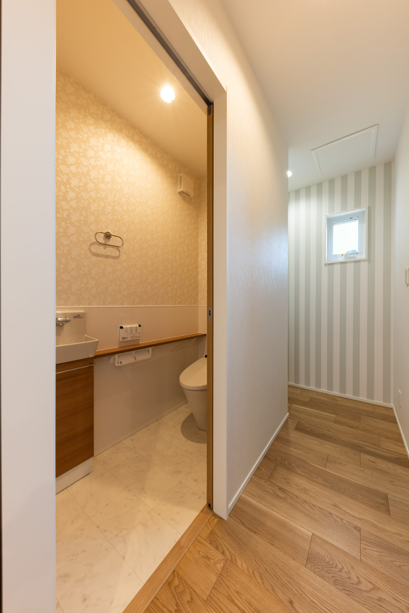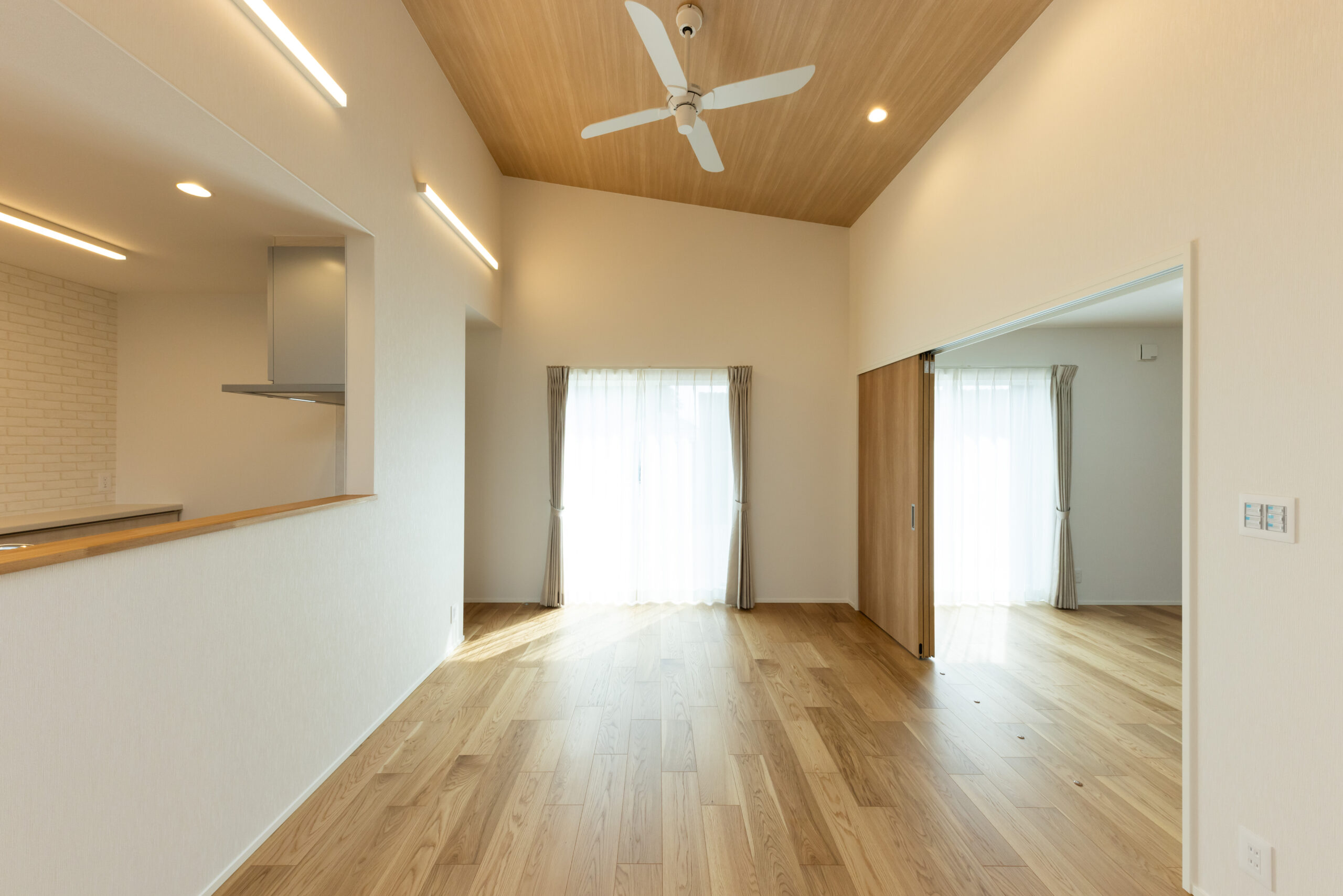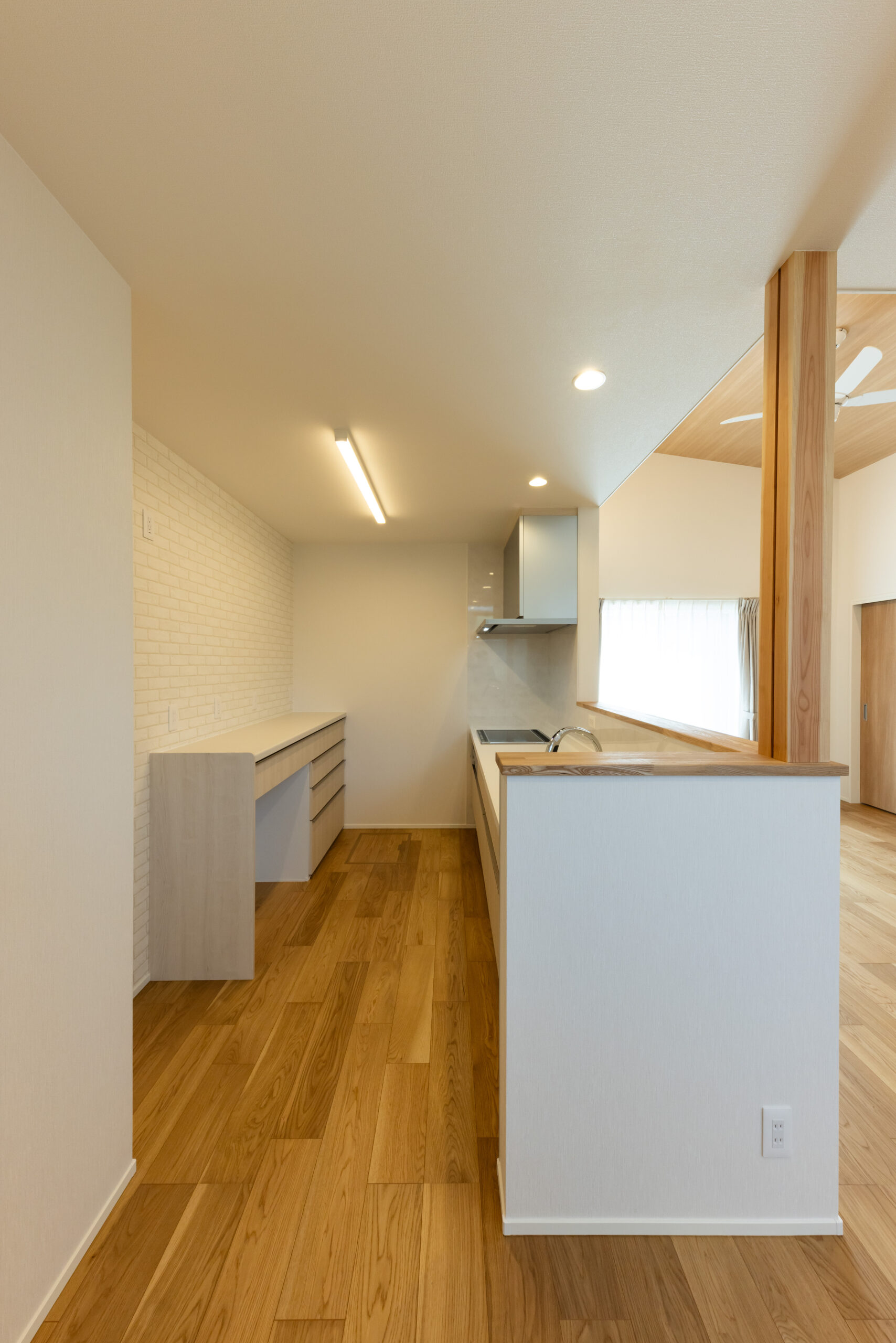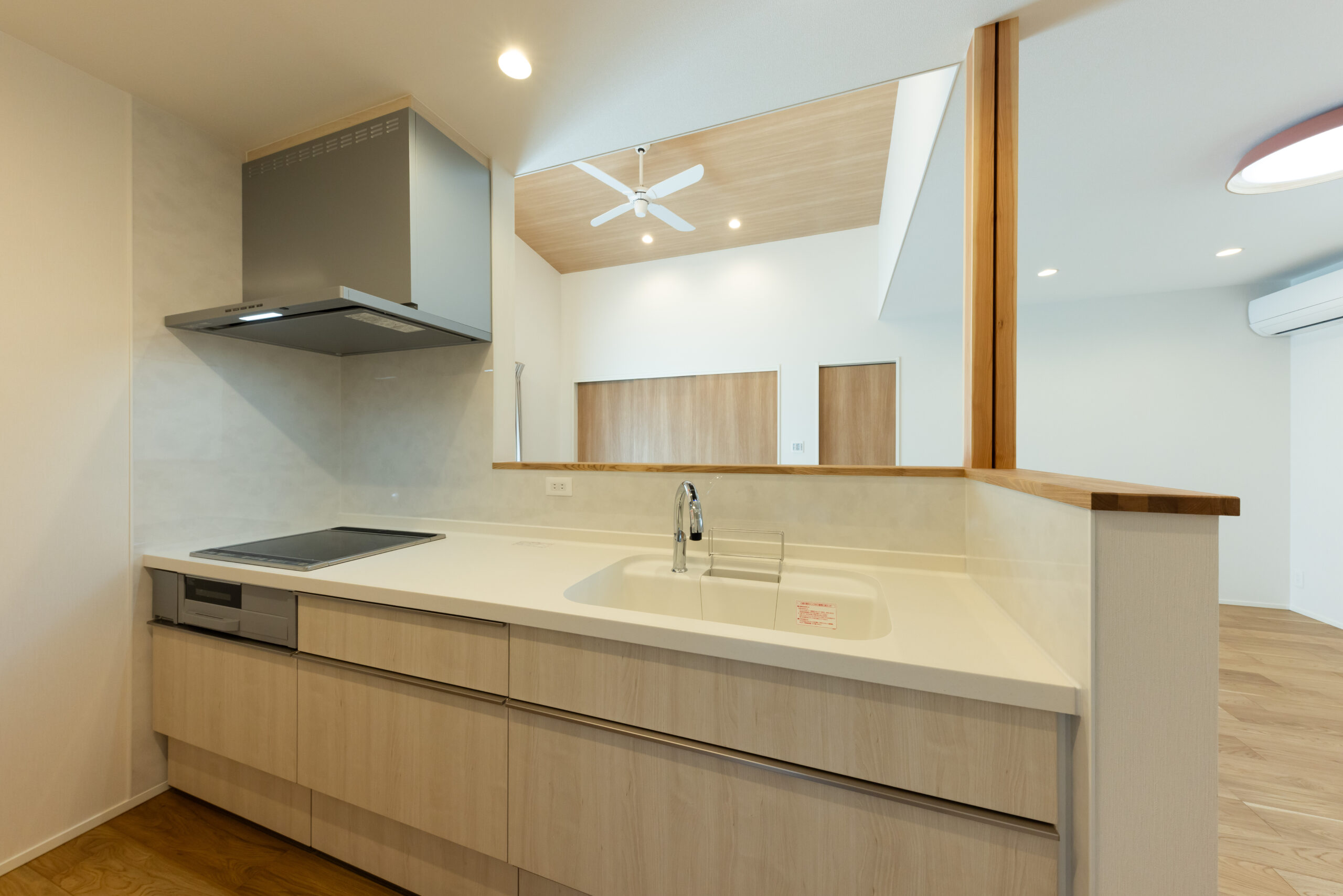 ベージュの外壁にダークブラウンの木目調を組み合わせた、落ち着きのあるモダンな外観が印象的なお住まい。室内は、窓からたっぷりと差し込む自然光と屋根の勾配天井により、光と開放感に満ちた心地よい空間が広がります。キッチンにはペニンシュラ型を採用し、料理をしながら家族と会話が楽しめる、つながりを大切にした暮らしを実現。さらに水まわりを一箇所にまとめ、廊下を介した動線設計により、家事効率の向上とプライバシーへの配慮も両立しています。家族一人ひとりの快適さと暮らしやすさを考え抜いた、理想のお住まいです。