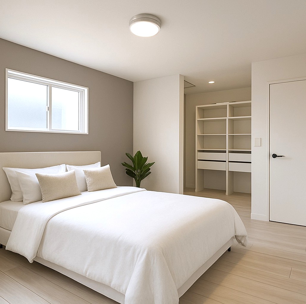 白基調の主寝室!空間を最大限利用したウォークインクローゼットを設置