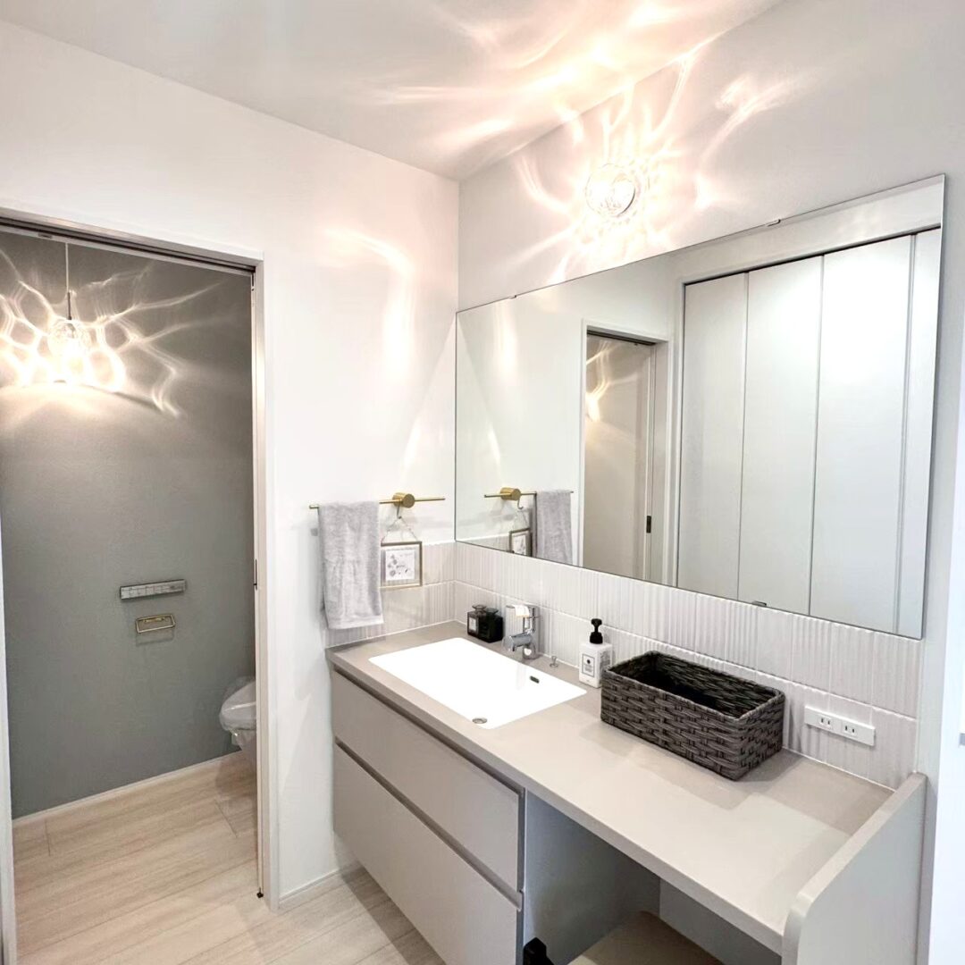 洗面スペースは、ホテルライクな清潔感とラグジュアリーな雰囲気を演出。すっきりとしたカウンターと大きなミラーで、日常の支度も特別な時間へ。