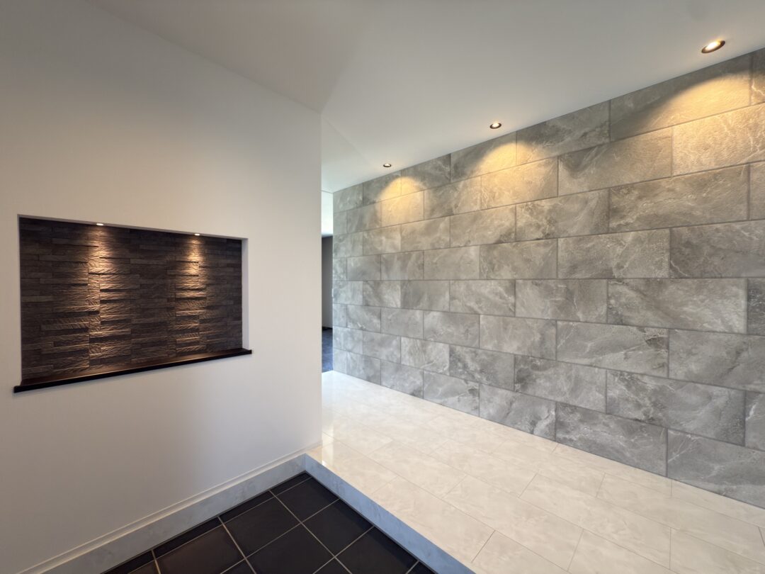 玄関ホールの正面とニッチにはアクセントにエコカラットを採用。 ダウンライトの陰影が質感を際立たせ、存在感のあるデザインにしました。 落ち着きのある上質な雰囲気でゲストをお迎えする、印象的なエントランスです。