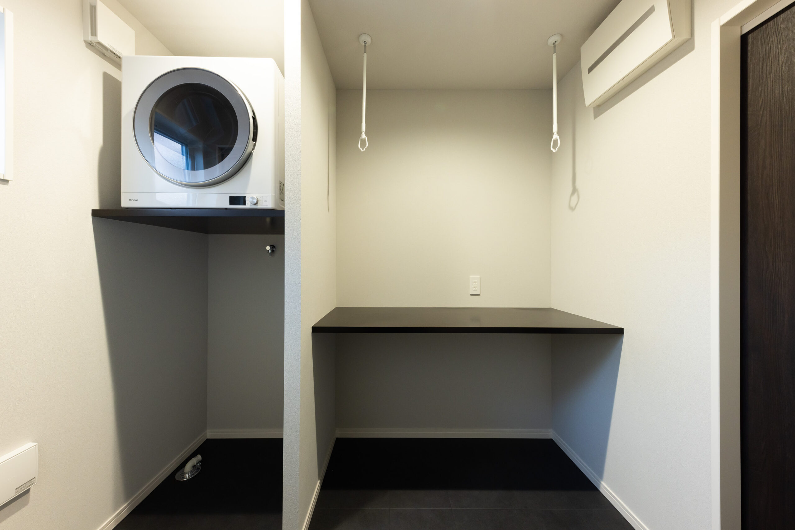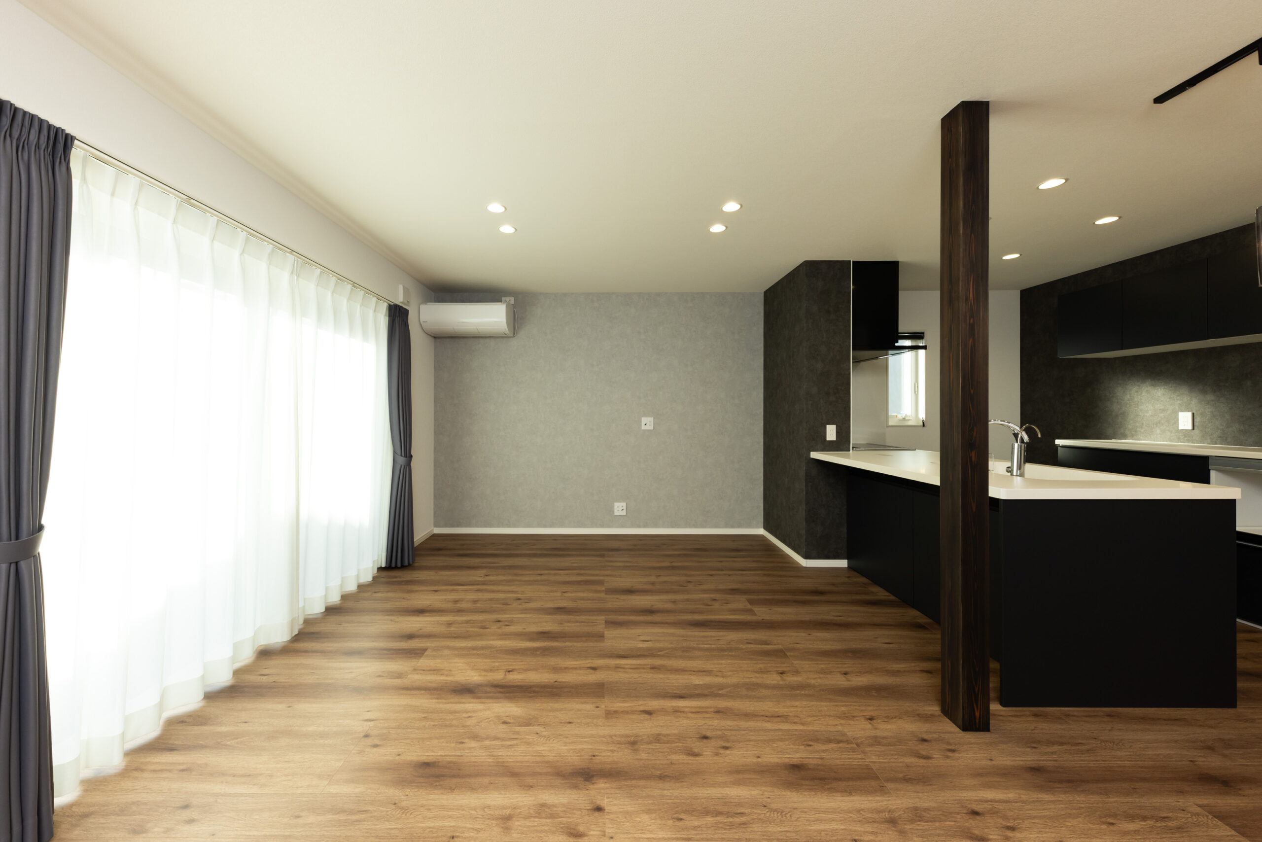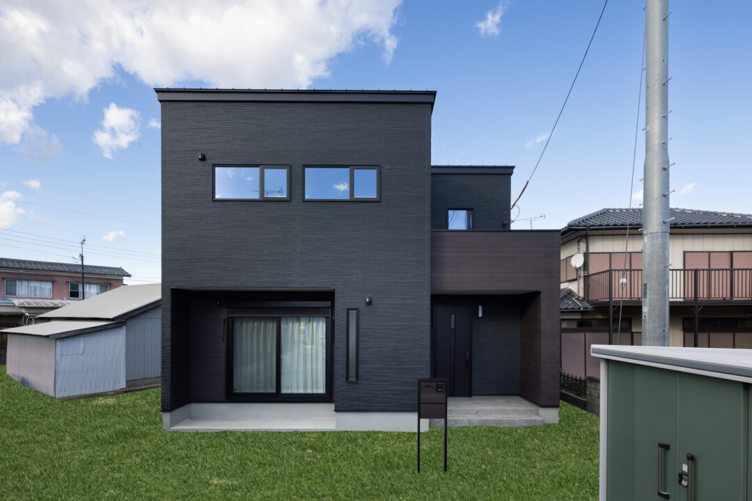 ブラックを基調としたシンプルモダンな外観は、スクエアなフォルムと素材の切り替えにより、重圧感と立体感を演出。玄関からすぐにキッチンとリビングへつながるスムーズな動線を確保し、家事効率の良さと開放感を両立しました。ペニンシュラ型キッチンには、黒のアクセントクロスとペンダント照明を組み合わせ、空間を引き締めながらデザイン性の高い上質な雰囲気に。リビングの一角にはキャットスペースを設け、家族の気配を感じながら、猫が安心して過ごせる居場所をつくりました。さらに、ひとりで静かに過ごせる書庫も備え、読書や作業に集中できる落ち着いた時間を確保。洗脳されたデザインの中に、快適さと安らぎを丁寧に取り入れた理想のお住まいです。