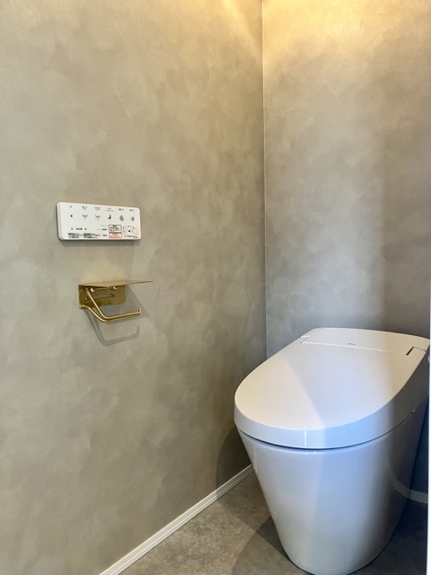 平屋でも、トイレはゆとりを持って2か所に設置しました。 感染症流行時や介護が必要な場面でも、2か所あることで衛生面とプライバシーを守ります。 グレーのミニマルな内装に、オーデリックのアクアシリーズが揺らぎのアクセントを。 落ち着きの中に水面のような光の美しさが宿る、ホテルライクなプライベート空間です。