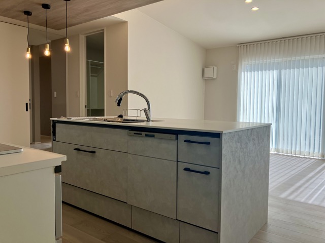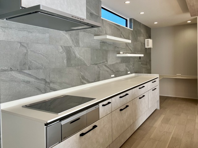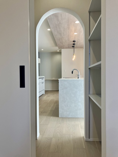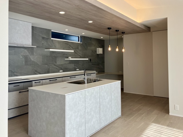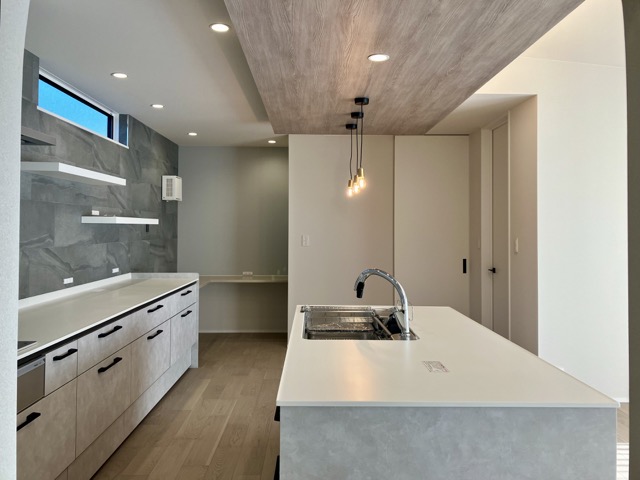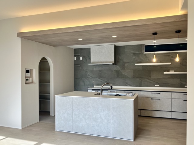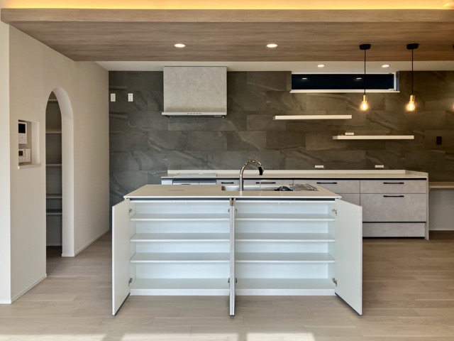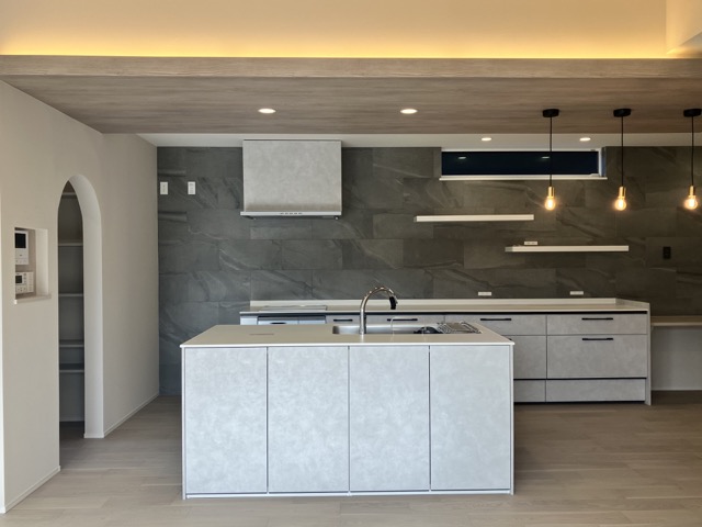 ホワイトスタッコヴィンテージが目を惹く、落ち着いたデザインのキッチン。 重い買い物袋もスムーズに運び込めるよう、パントリーは玄関から直通の配置にこだわり、家事楽動線に。 アイランドキッチンには、大人数でも作業しやすい「ひろびろWサポートシンク」を採用。 壁一面のグレータイルが、空間をスタイリッシュに引き締めます。 また、将来の家電増加を見据えてコンセントを充実させ、パントリー内にも設置するなど、実用性も追求しました。