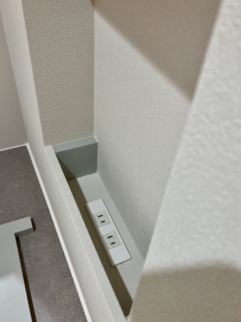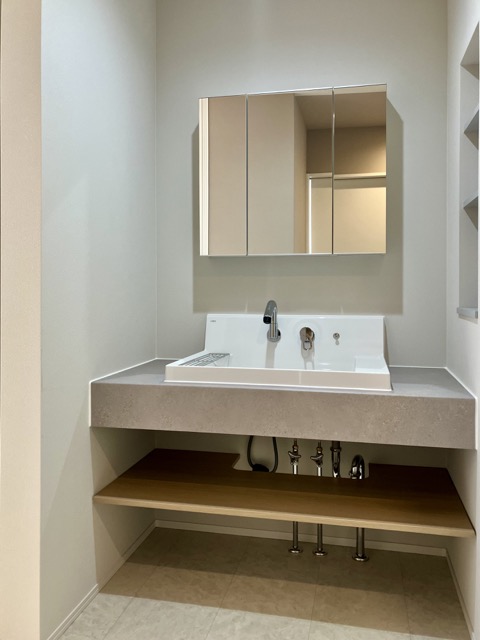 デザイン性と機能性を両立させた、ホテルライクな洗面台。 特筆すべきは、ドライヤー専用の壁掛け収納です。 コンセントを隠して設置しているため、差したままの状態でも生活感を感じさせません。 忙しい朝も、使い終わったらサッと掛けるだけ。 「出しっぱなし」なのに美しい。ストレスフリーな洗面空間になりました。