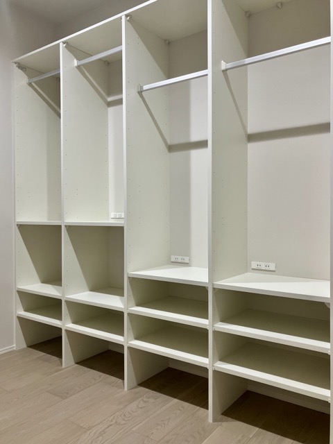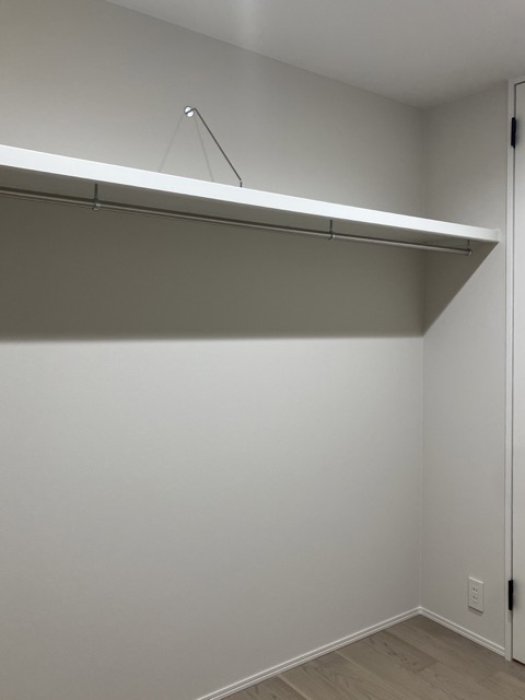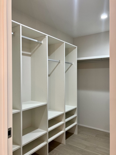 各個室のクローゼットに加え、家族共用のファミリークローゼットも設けました。 内部には家族人数分の棚を設置し、自分のスペースを明確に。 お子様のエリアは、ハンガーパイプの位置を少し低く設定しました。 自分で手が届く工夫をすることで、お片付けの習慣を楽しく育みます。