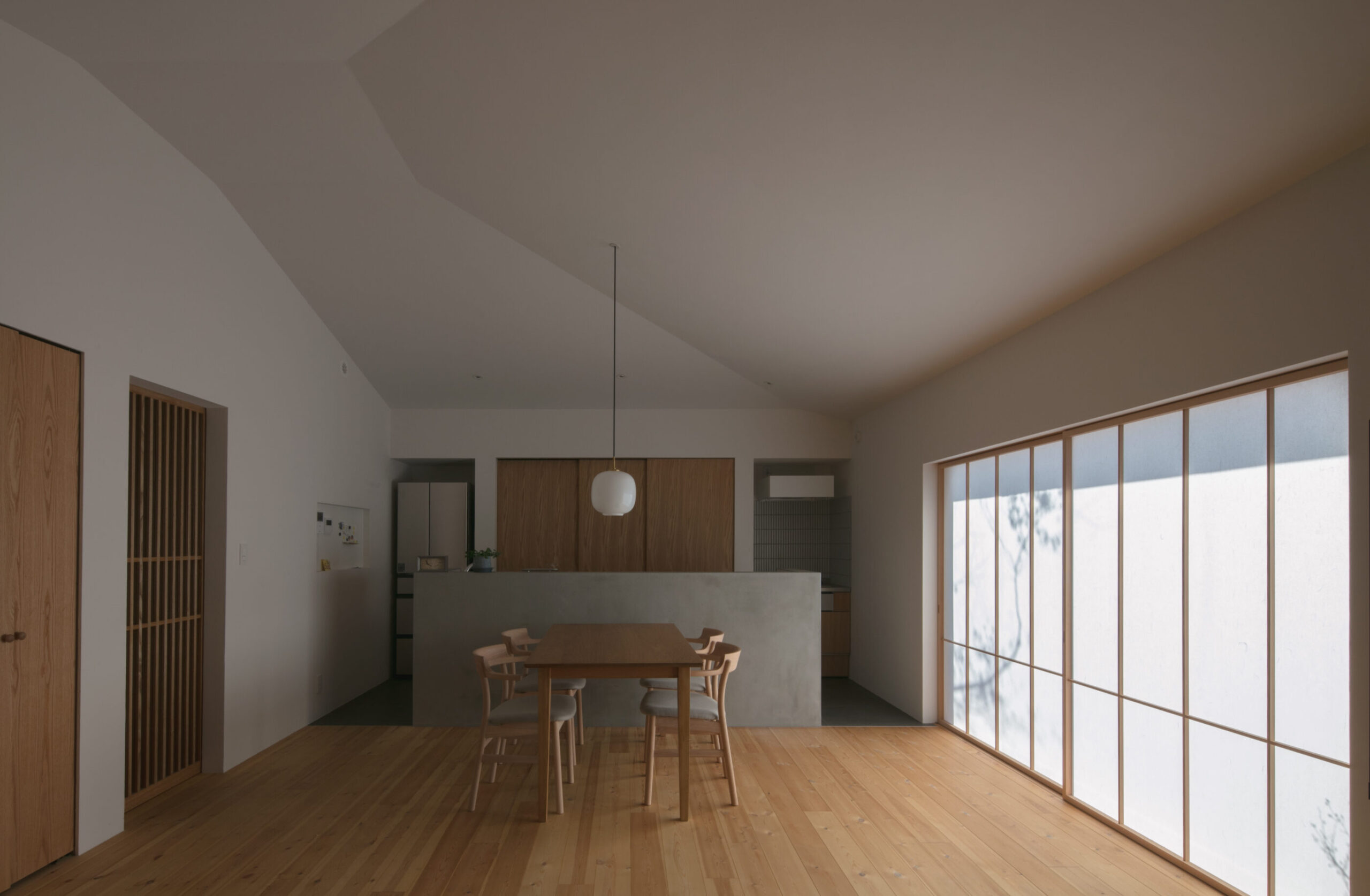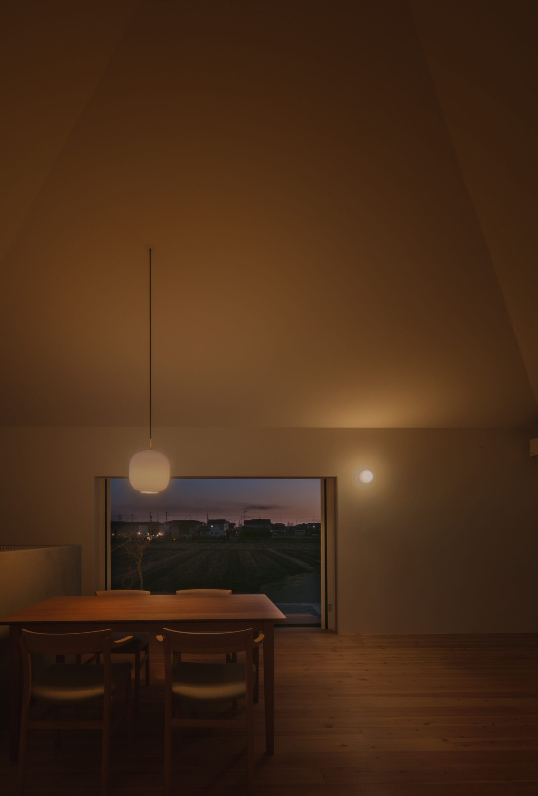 自然に囲まれた穏やかな土地に計画した住まい。周辺環境との調和を大切にしながら設けた大きな窓からは、瑞々しい緑や、季節ごとに表情を変える景色が室内へと穏やかに入り込みます。季節の移ろいを日常の中で感じながら、住まうほどに豊かさが増していく空間を目指しました。
