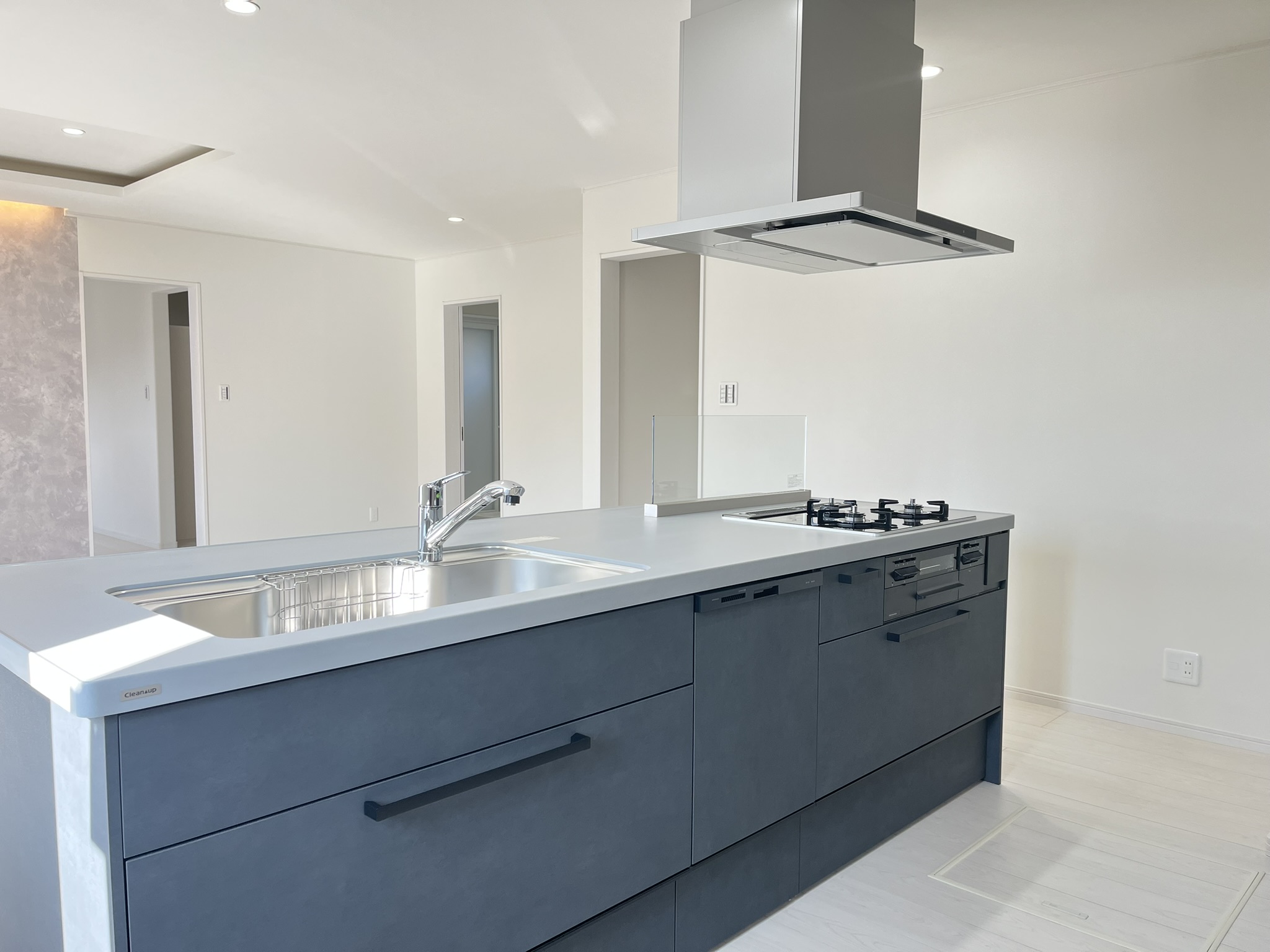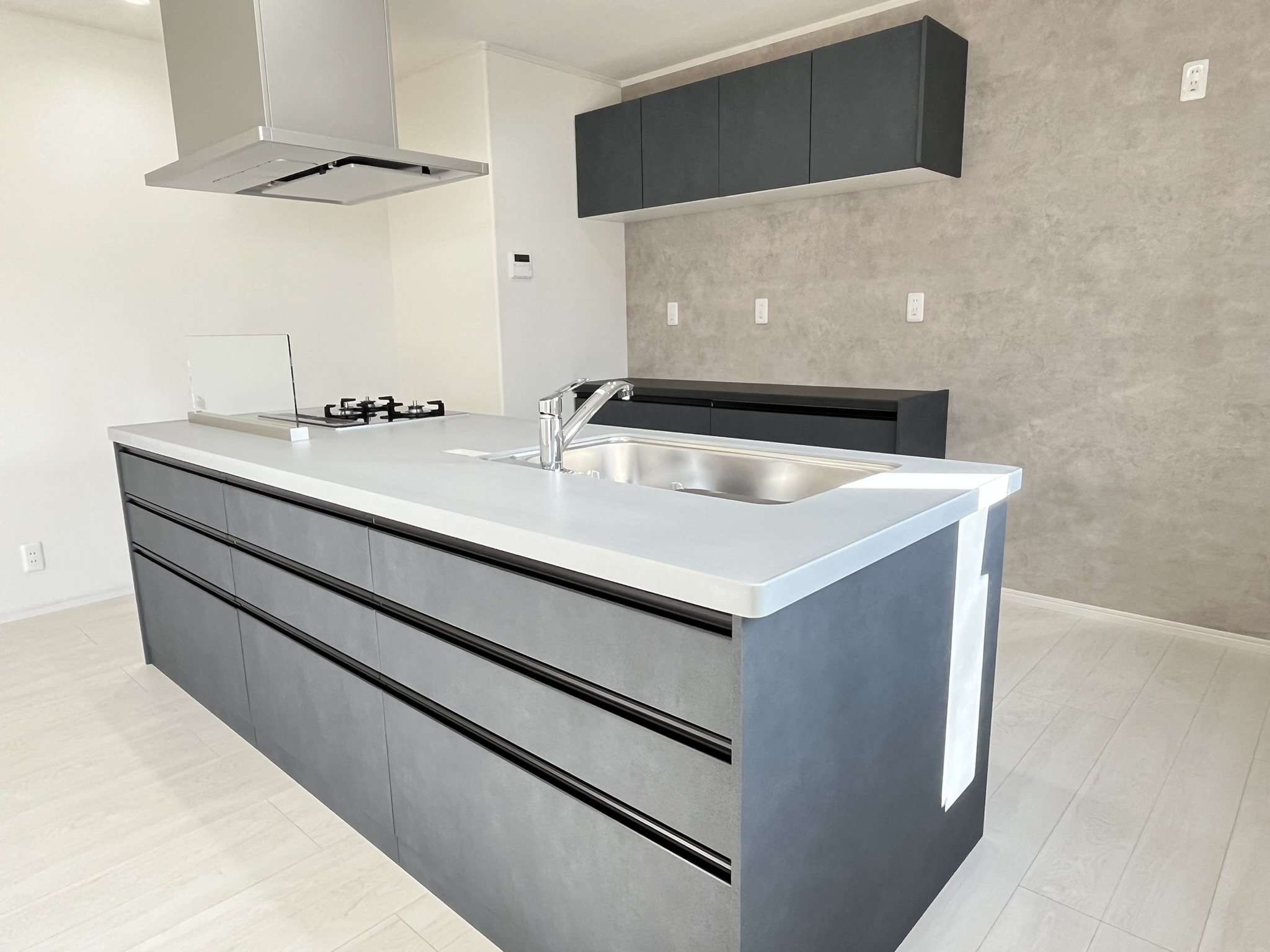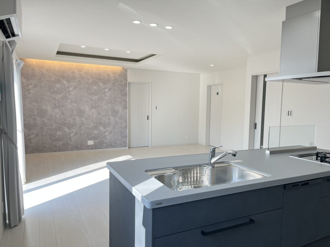 こだわりのアイランドキッチンはお部屋との一体感がありお料理しながらも会話がはずみます♪左右からの行き来もしやすいので、家族もお手伝いがしやすい!リビング収納も兼ねておりリビング側が全面収納♪サッとしまえて片付け上手♪
