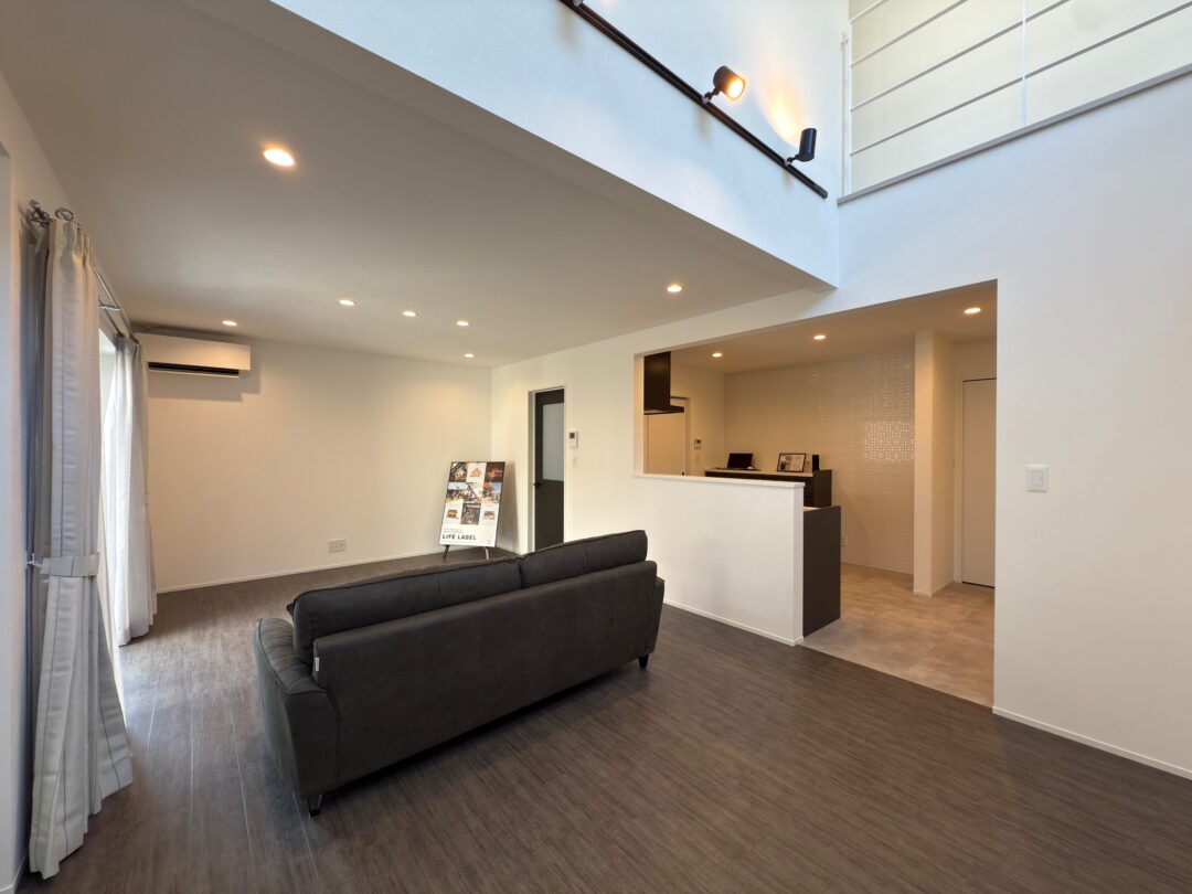 白を基調にグレーを差し色として取り入れた、落ち着きのあるリビング。余計な装飾を排したミニマルなデザインが、空間の広がりと清潔感を引き立てます。 床はすべてフロアタイル仕上げ。リビングはグレーの木目でナチュラルに。