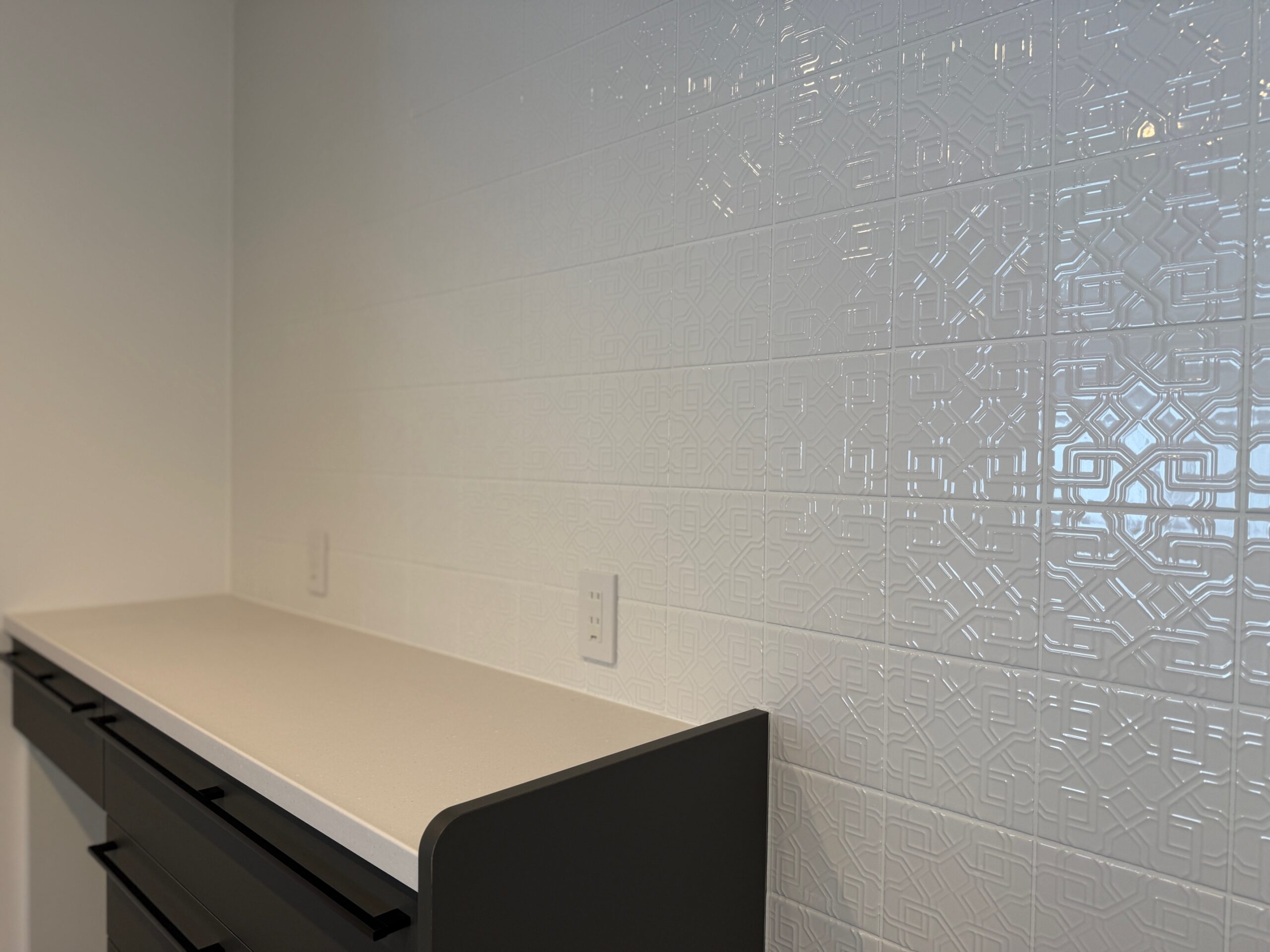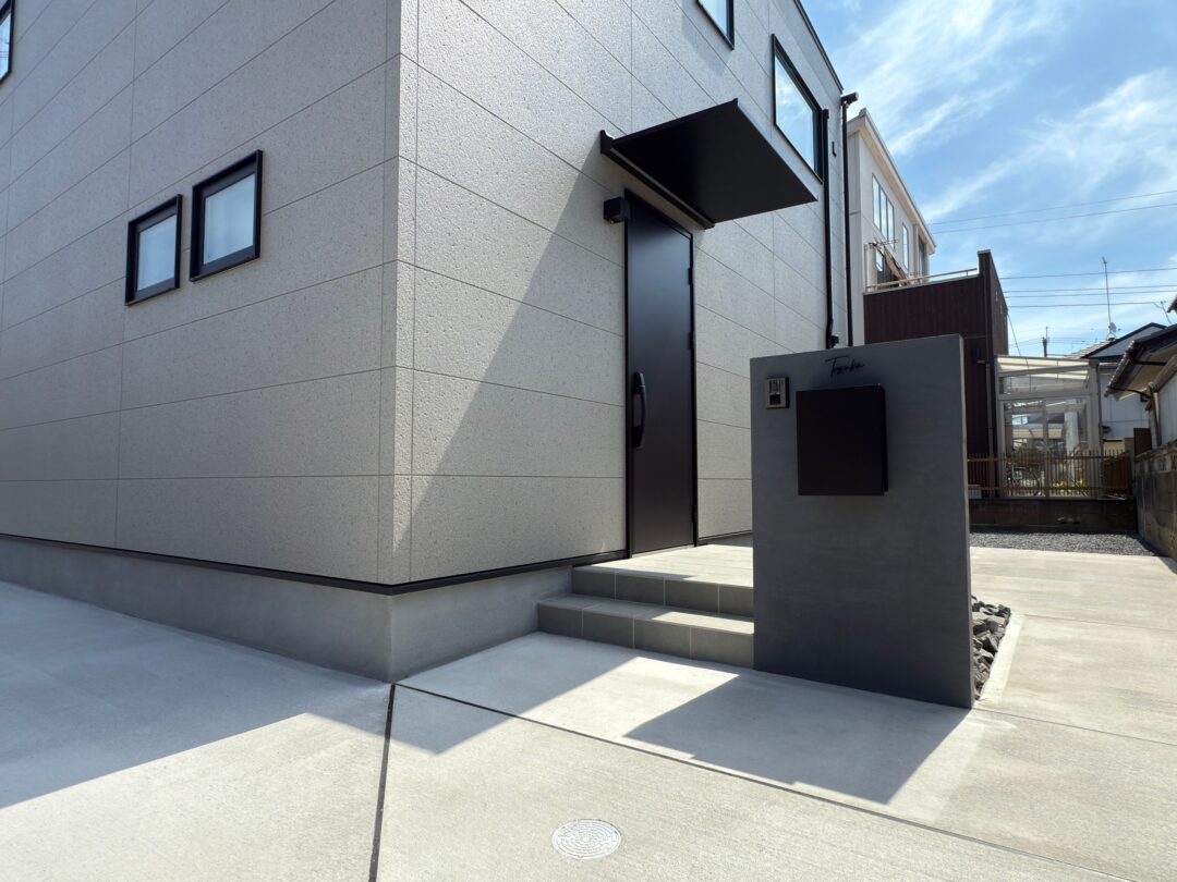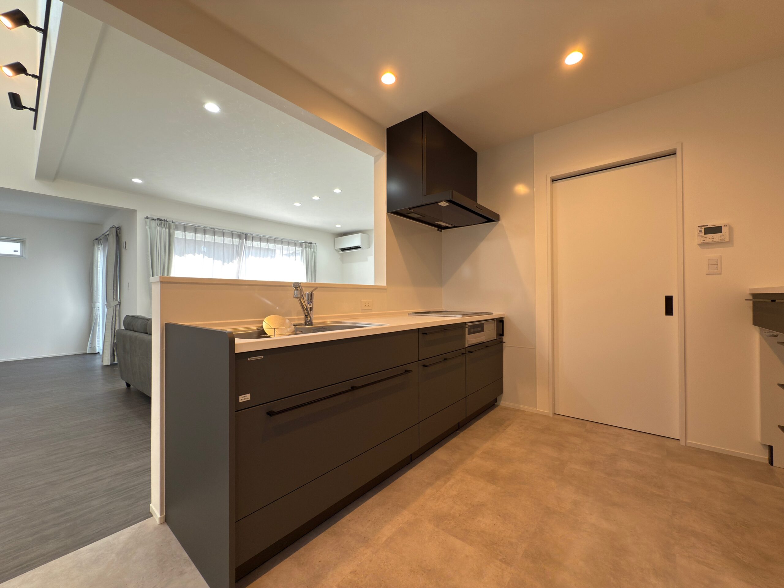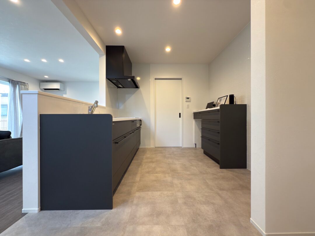キッチン・洗面・トイレはモルタル調でシャープさをプラス。 空間ごとに表情は変えつつも、全体はシンプルにまとまる統一感あるデザインに仕上げました。