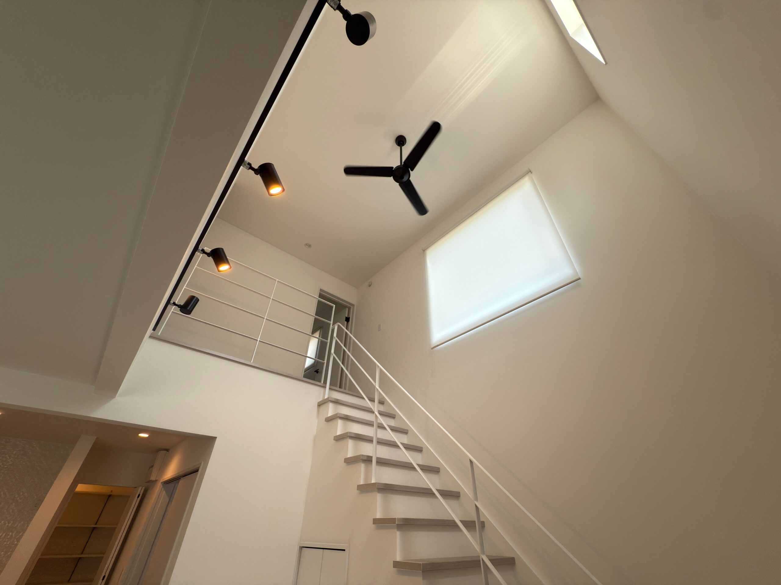 オープン階段の鉄骨手摺はホワイトをセレクト。やわらかく馴染むホワイトが空間のバランスを整え、軽やかで抜け感のある印象に仕上げました。