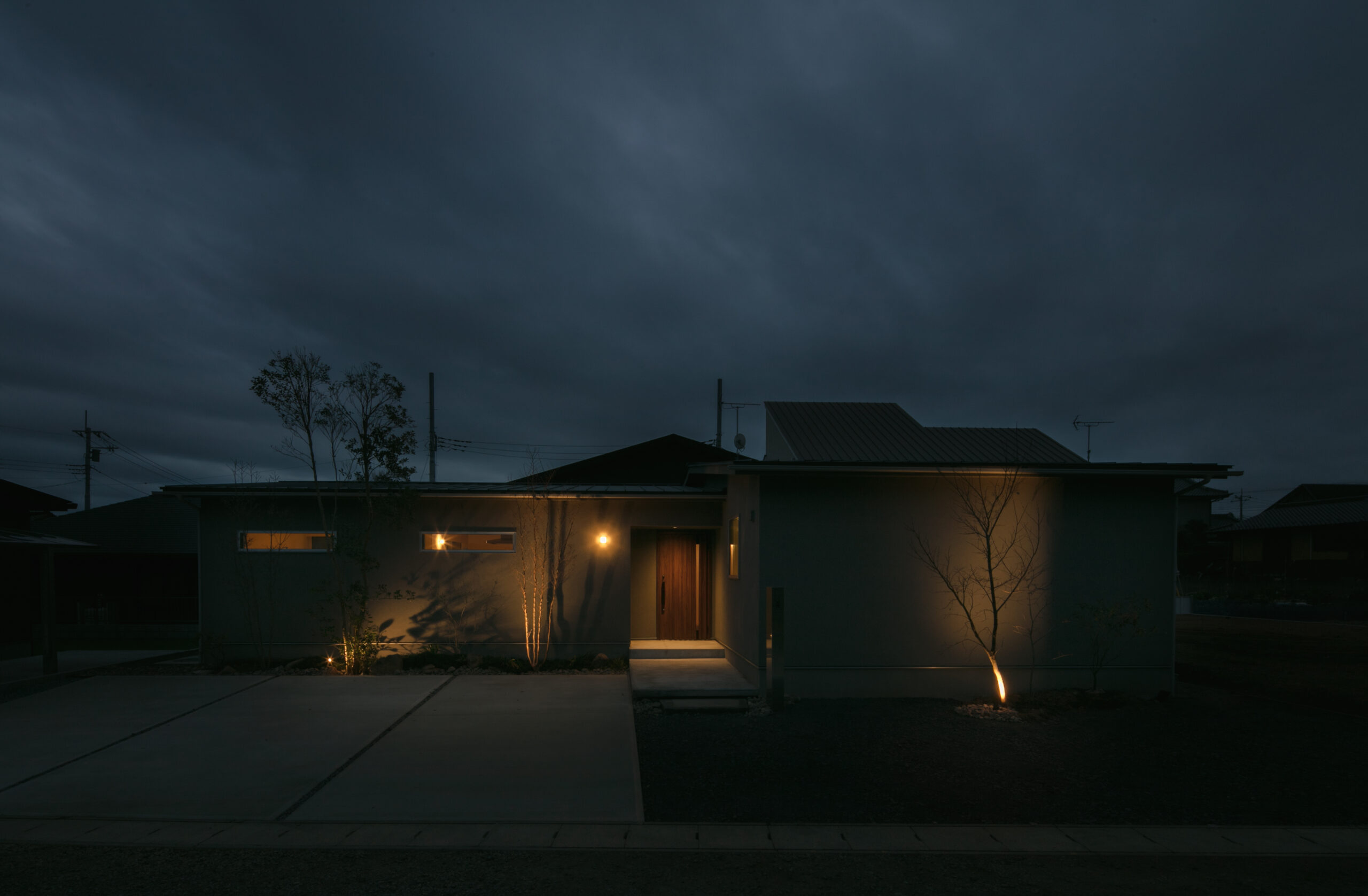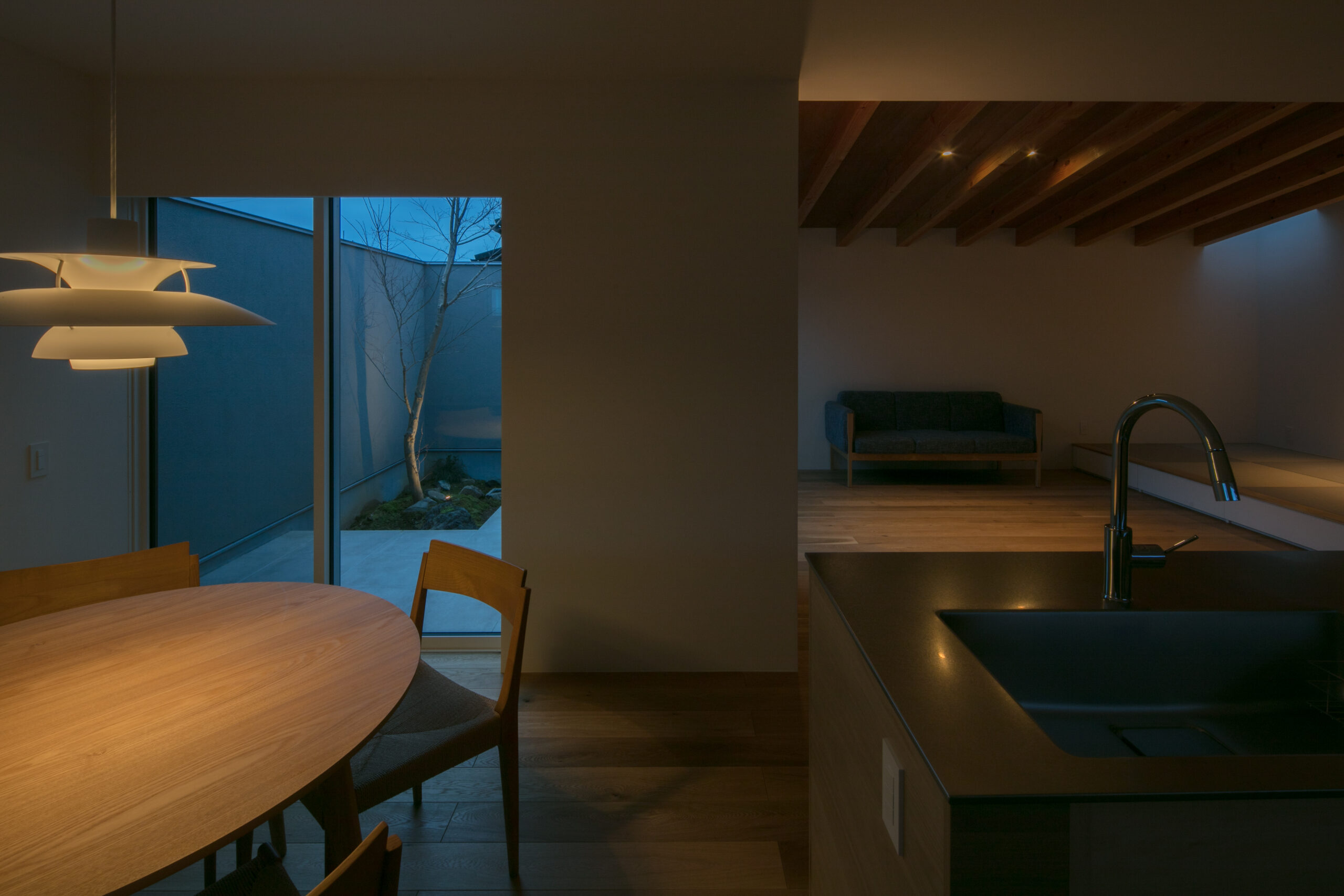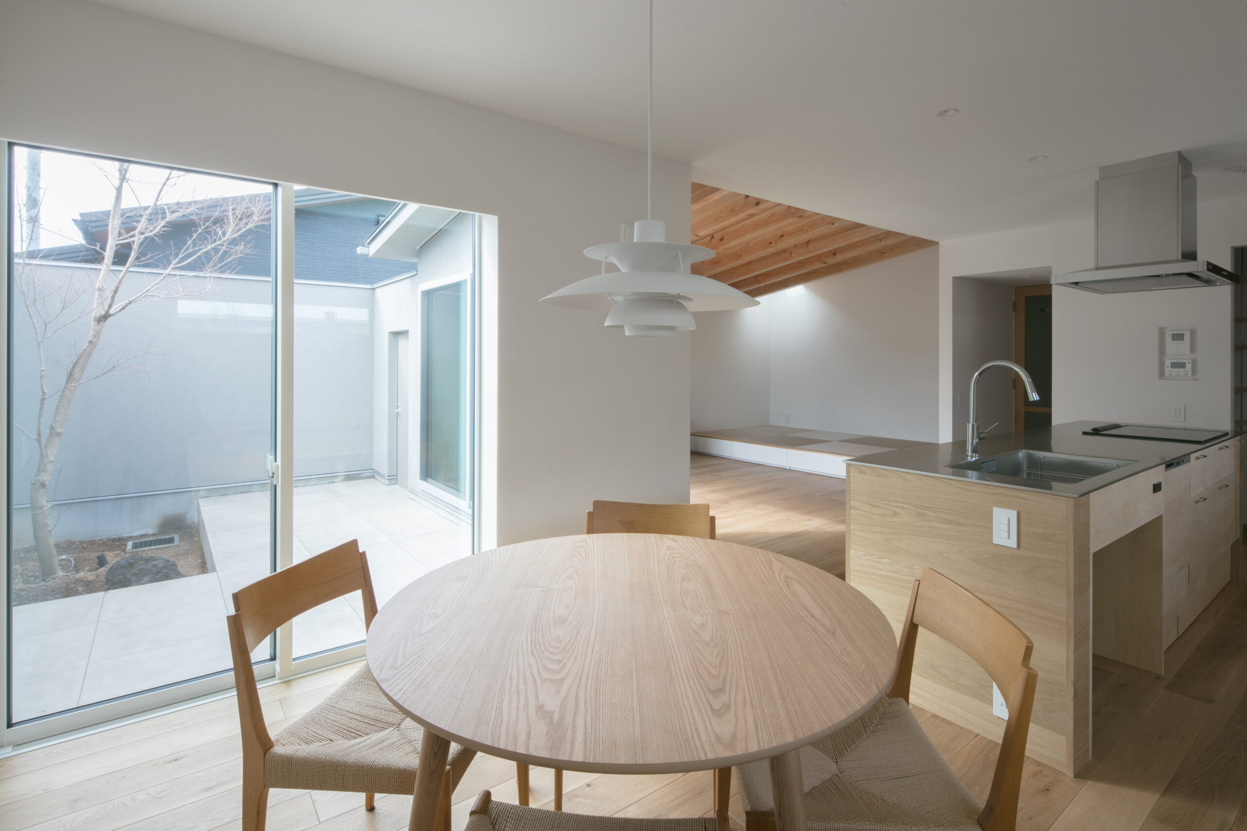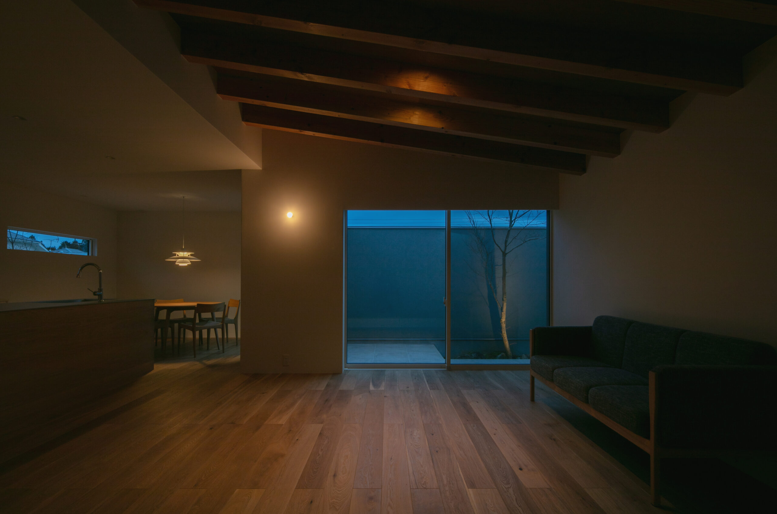 中庭から届く光と、やわらかく広がる陰影。木の表情が空間に奥行きを与え、季節の移ろいを静かに感じられる平屋の住まい。穏やかな気配の中で、日常を丁寧に重ねていく家です。