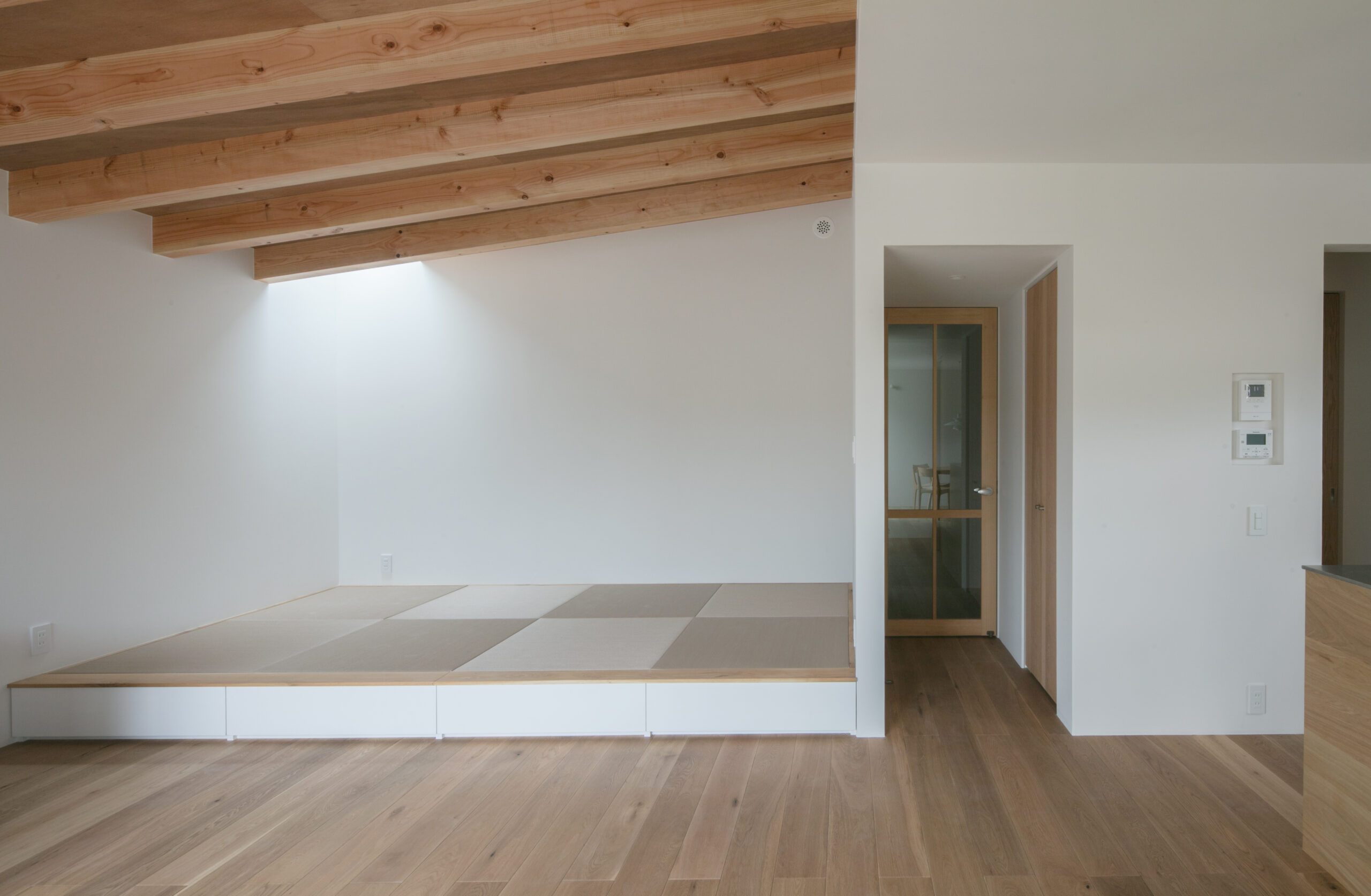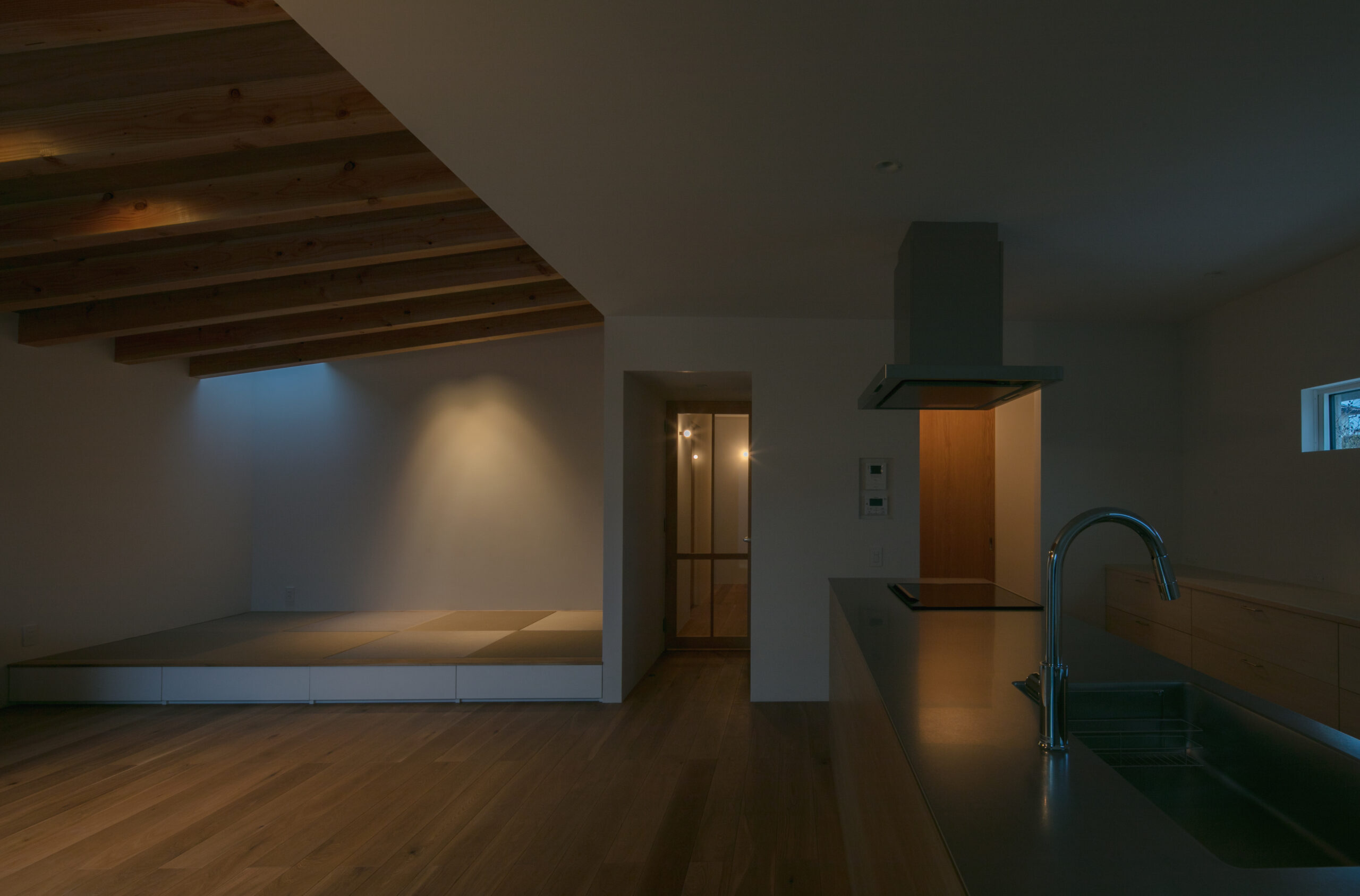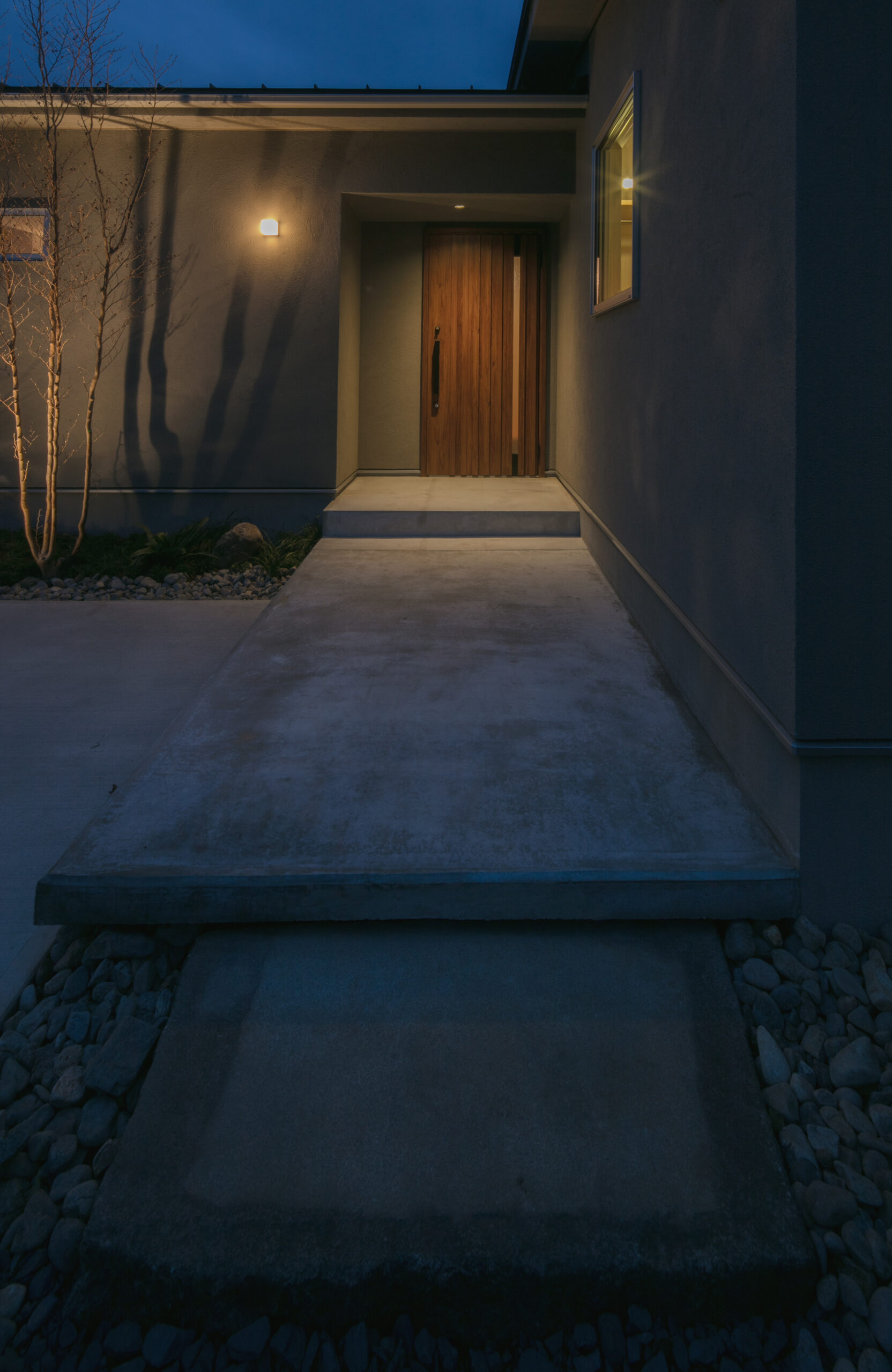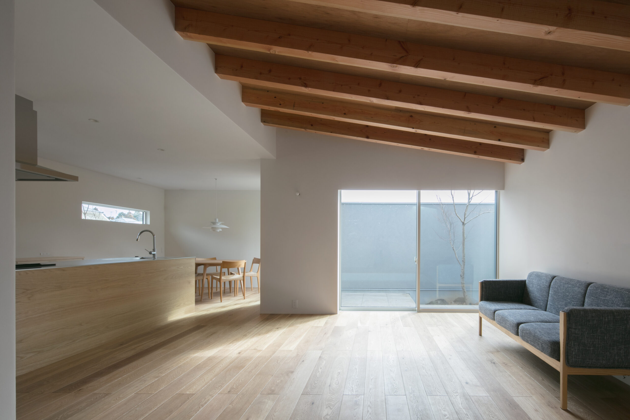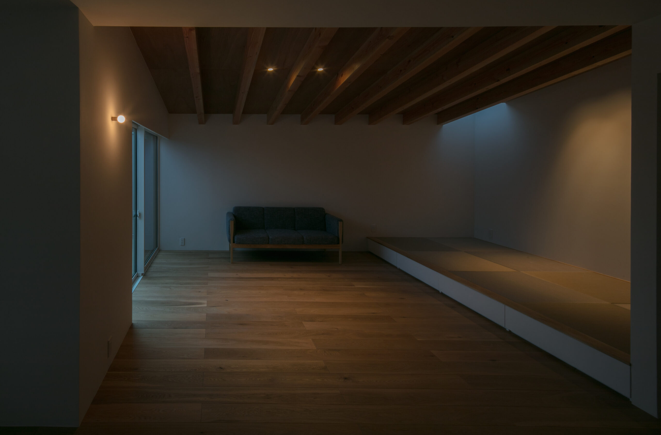 中庭から届く光と、やわらかく広がる陰影。木の表情が空間に奥行きを与え、季節の移ろいを静かに感じられる平屋の住まい。穏やかな気配の中で、日常を丁寧に重ねていく家です。