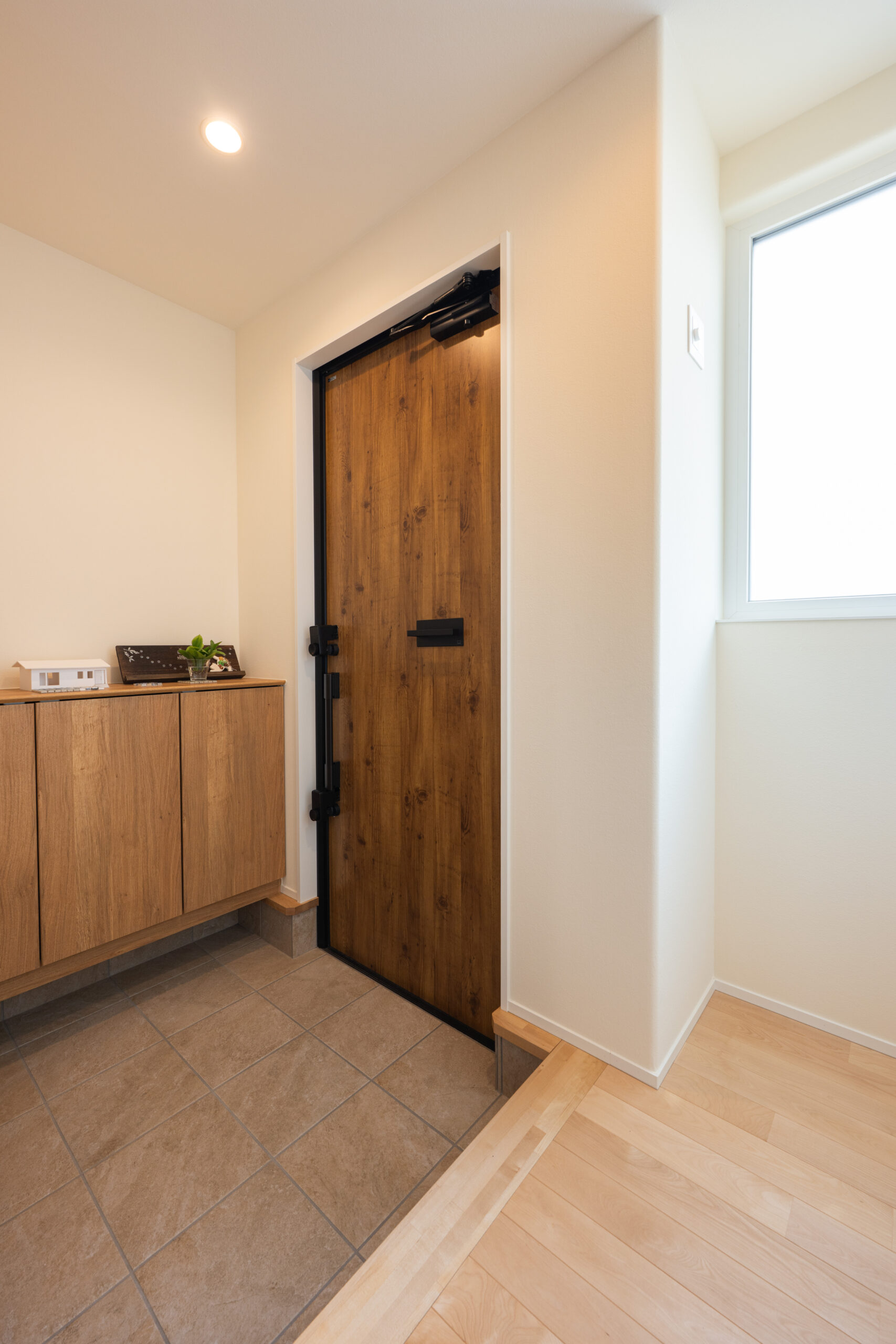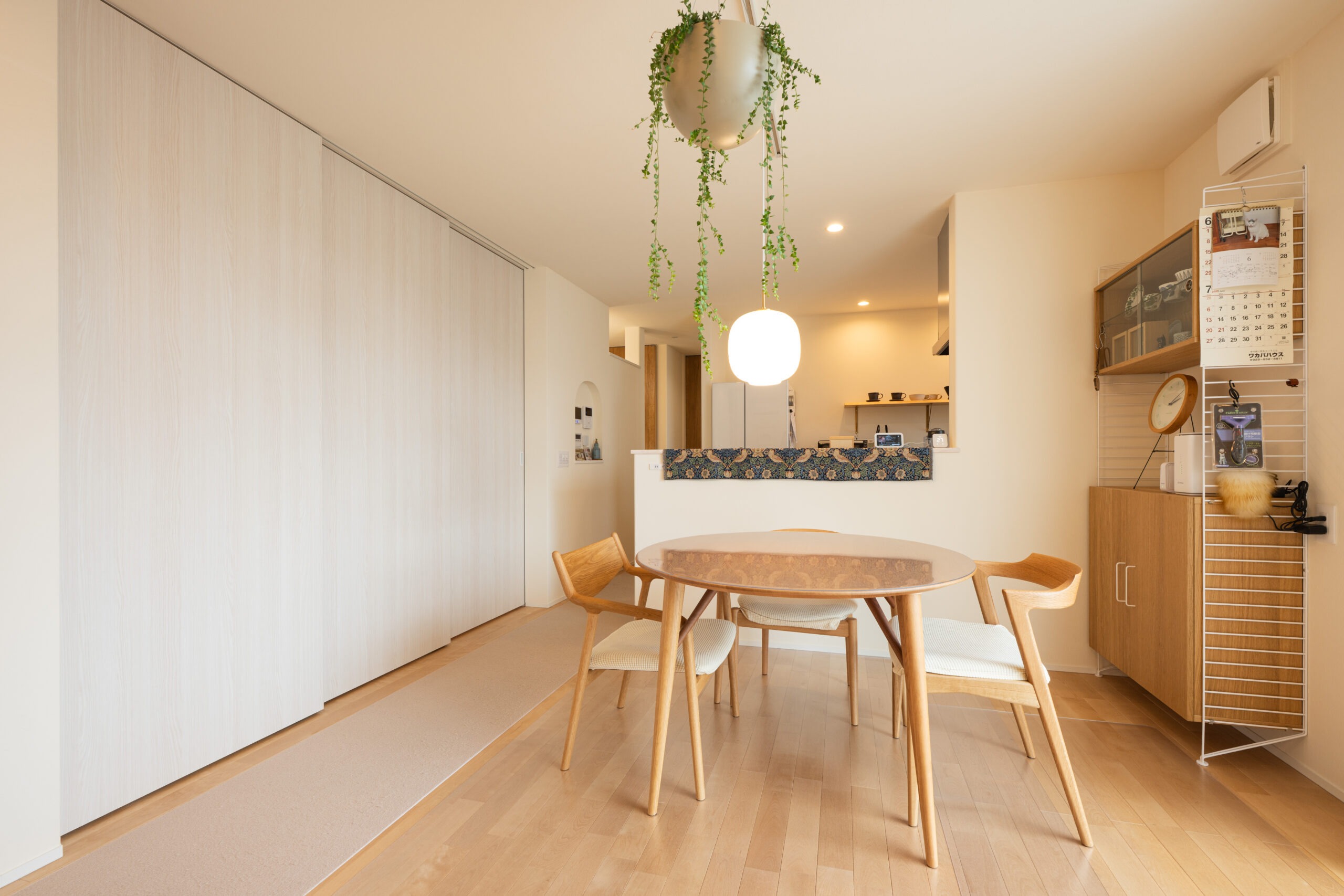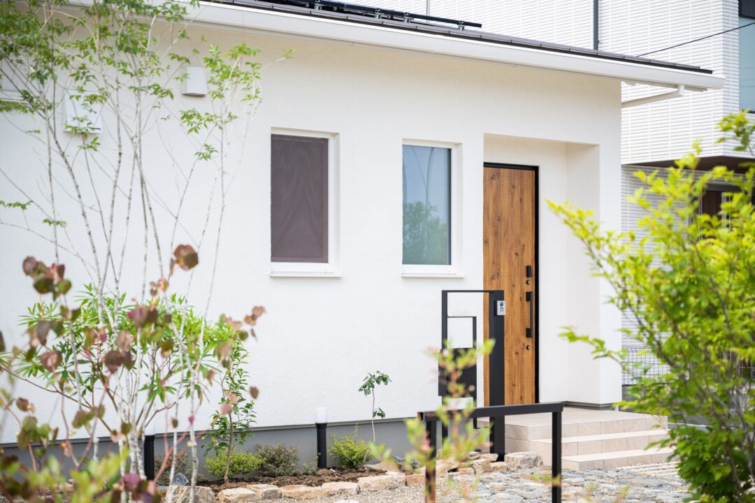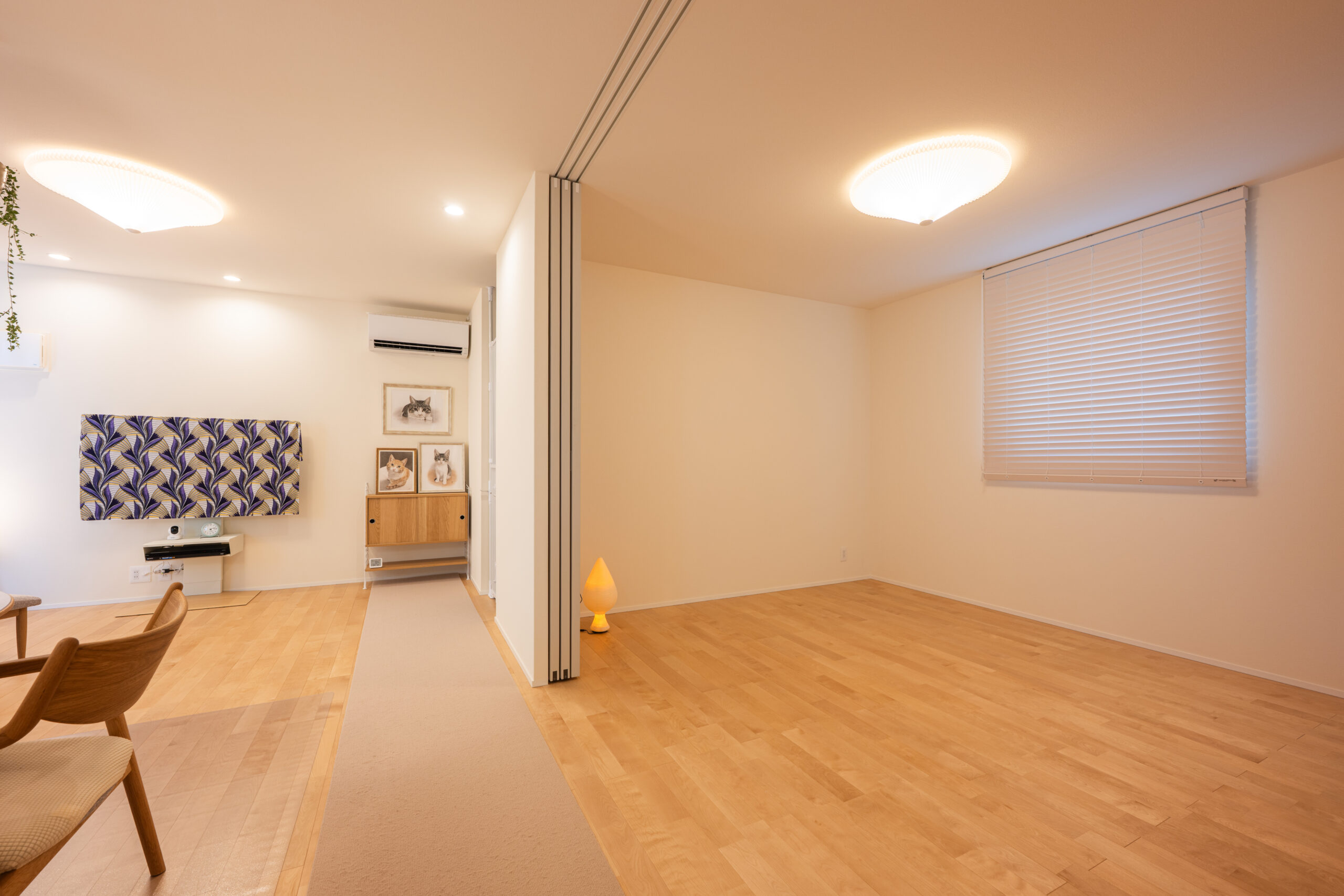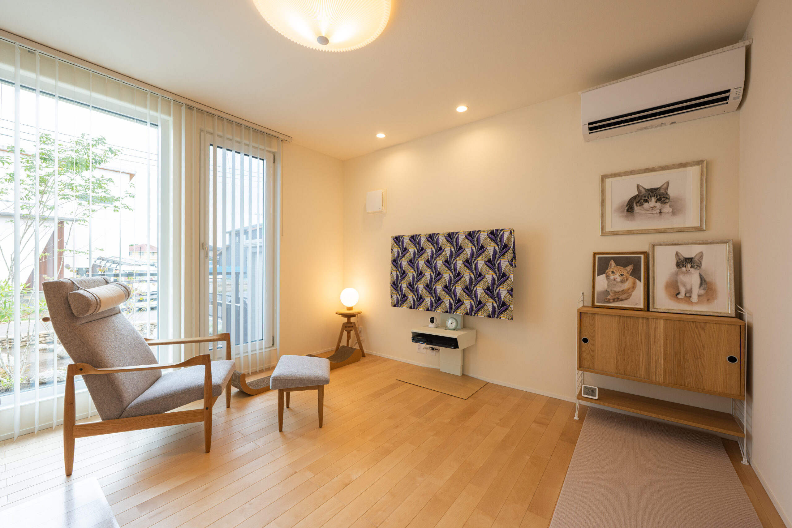 夫婦ふたりと猫が安心して暮らせるよう、小さな願いを丁寧に形にした平屋。猫の飛び出し防止やプライバシーに配慮した動線、趣味の個室、水まわりと寝室がつながる家事ラク動線で、心地よさが自然と続く住まいになりました。